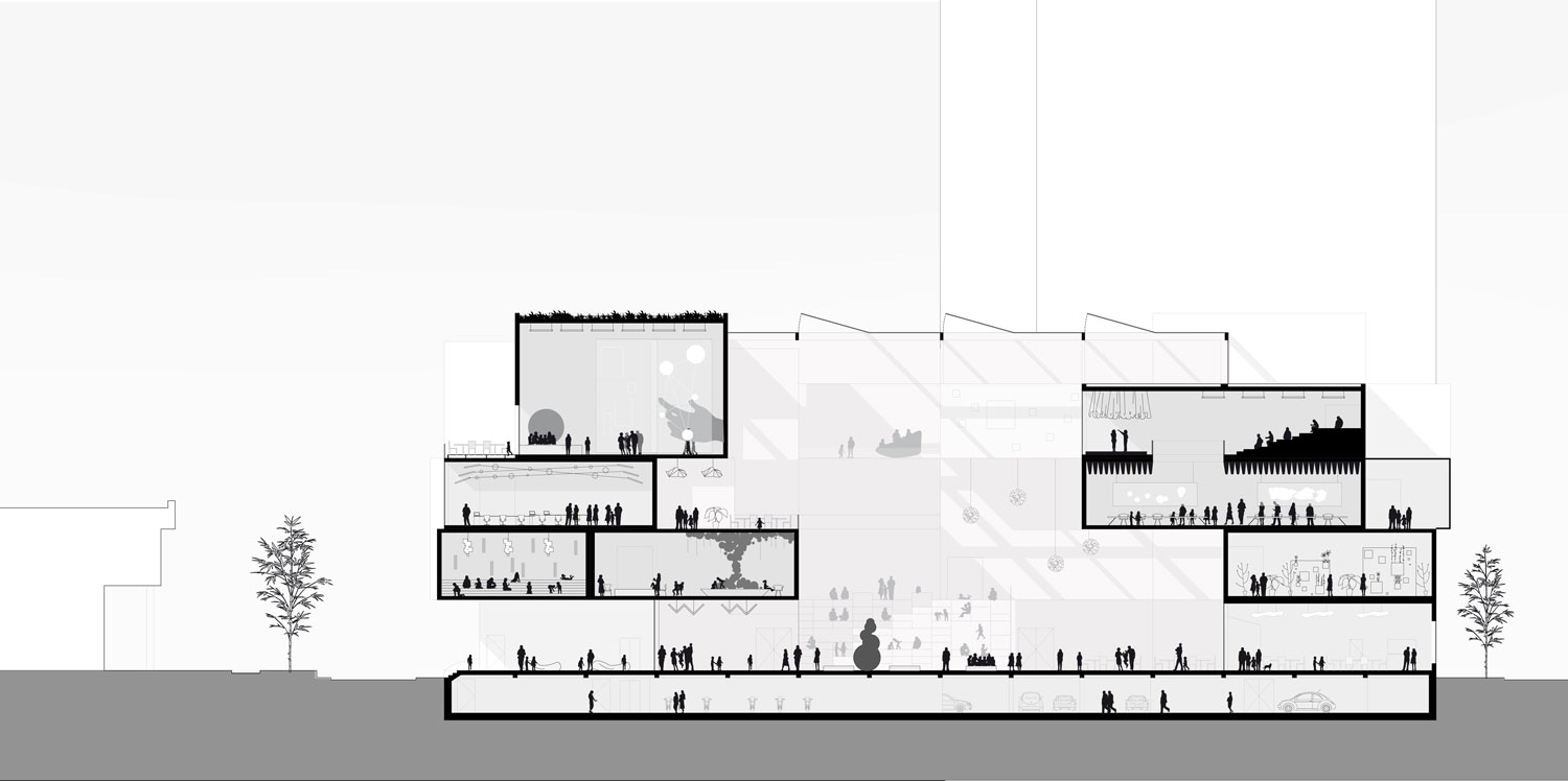 ☉ Children Museum of Louisville is a proposal by NBJ architectes and NAS Architecture designed in 2014. It is located in Louisville United States in an urban setting. Its scale is large with a surface of 28.000 sqm. Key materials are concrete glass and metal. Concepts such as box and atrium are explored.