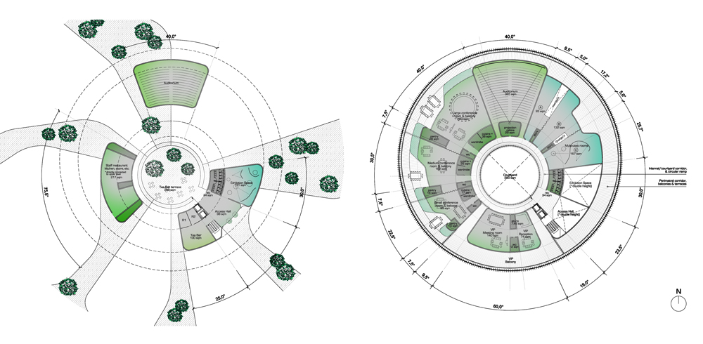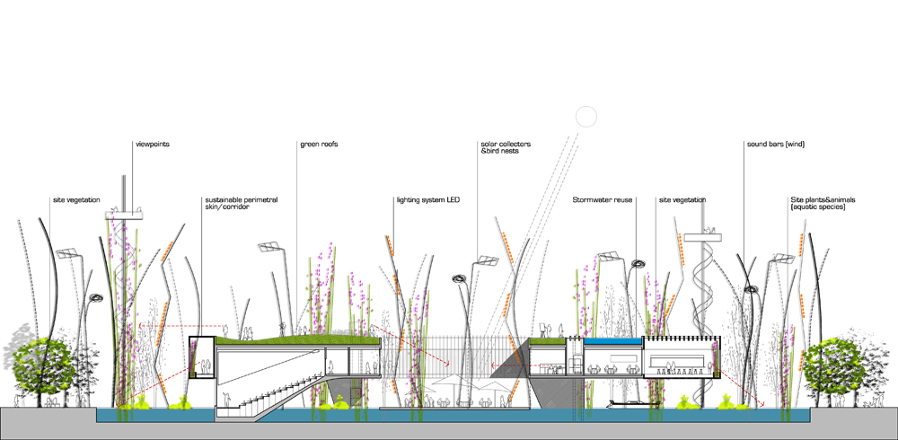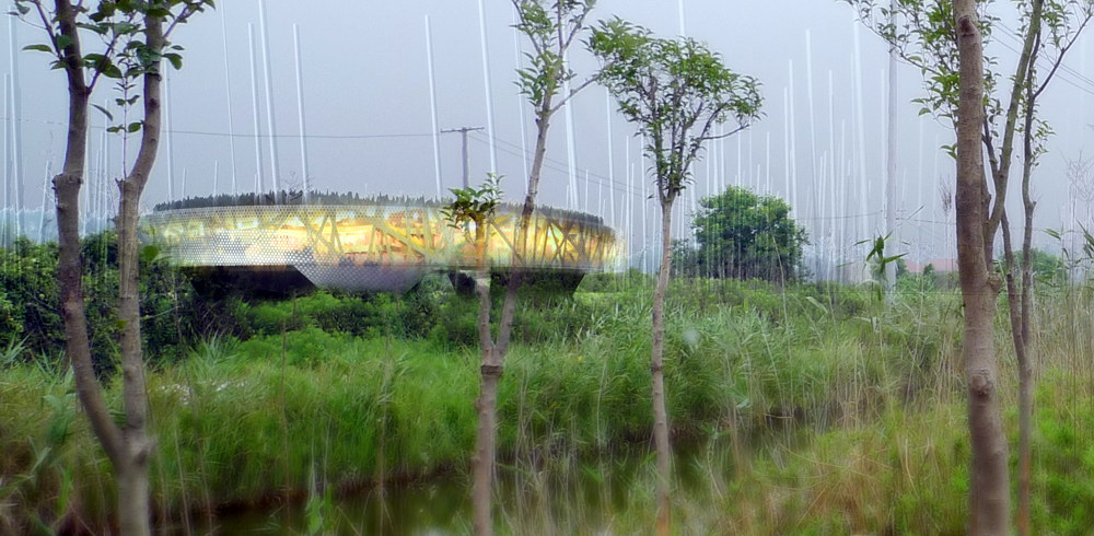 At 0.00m level, develops our own landscape,…. who try to represent the content of the Chongming island and at the same time, create a sustainable filter (humidity, shadow,…) between the exterior climate and our building. At the same time becomes an special area for the visitor with a lot of inputs created by the natural and the artificial elements incorporated on it. At 4.50m level, our building or “island” happens , from which we can enjoy of a 360º panoramic views over our particular landscape, towards the horizon and rest of the island. A mixed natural&artificial double-skin placed on all the building perimeter allows to control the interior climate and also reduce considerably the costs in energy terms. The roof or «park» becomes a place to enjoy, and relax our mind and by the other hand, a sustainable element to isolate the building of exterior and to get different resources such as rain water, the sun irradiation, the wind, etc…to be reused for sanitary elements, irrigation, electricity, hot water, etc.