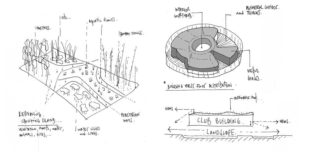 The main idea is combine 2 elements to create a unique project as a representative green and sustainable element on the island. It’s not only to think about a building with a empty area around it but to introduce 1:1 scale all that happen surrounds the island. The building will become our “island”, full of uses and viewpoints, and the area around it, our small reproduction of the Chonming environment, including representative species as trees, plants, fishes & crabs, etc. ……. all around in a water environment. Extracted elements from the own island combined with high sophisticated technologies to obtain the maximum integration on the existing landscape, a complete self-sufficient building, a good behaviour in front of the hostile climate of the island, etc…