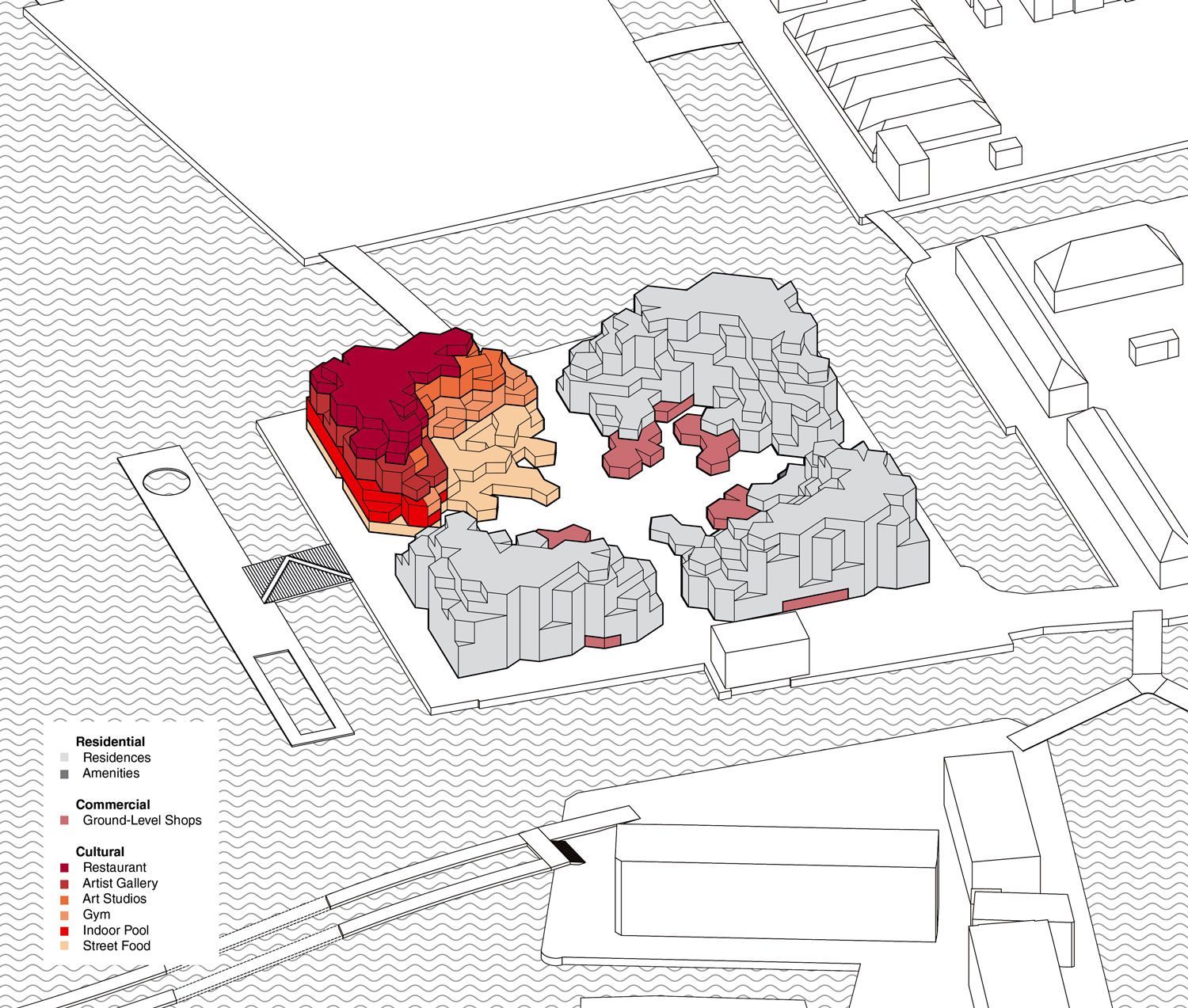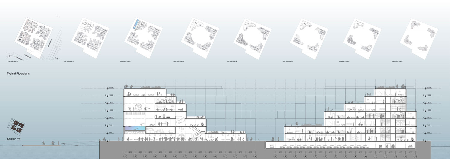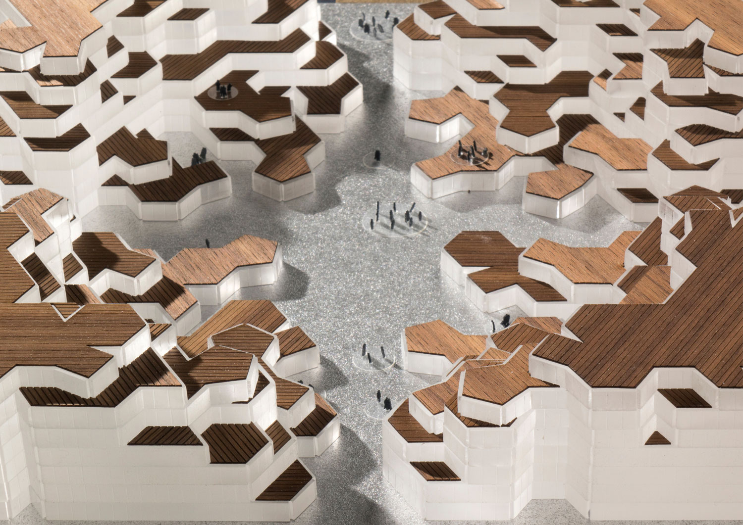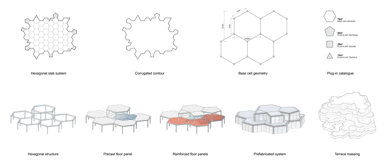Ever since industrial production entered the realm of architecture, architecture has been a losing battle against boredom. This project is an attempt to find a way out. It generates a maximum amount of variety with a minimum number of elements. It is based on repetition, efficiency, standardization and all the other imperatives which, from the moment industrial production took hold, have held architecture to ransom. In fact, it embraces all these imperatives with the exception of one: the 90° angle. The abandoning of the 90° angle allows the project to unite a number of phenomena previously considered irreconcilable: rationality and interest, repetition and variety, collectivity and individual expression, monumentality and informality. The project creates the feeling of single family homes (with gardens in the form of the ample roof terraces), yet it organizes these within the collectivity of a larger building. All homes are constructed of the same standard prefabricated elements, but none of the homes are the same.
