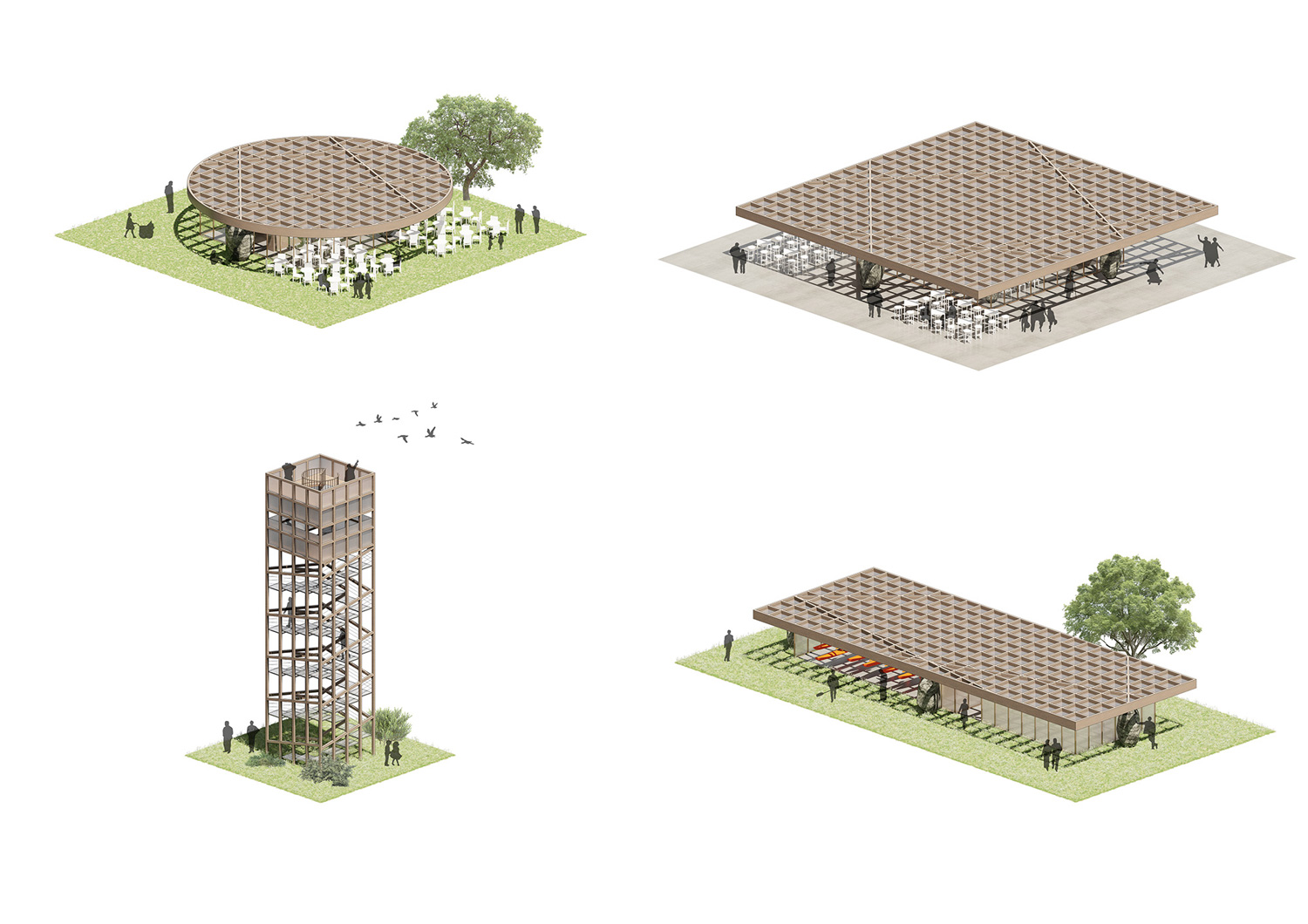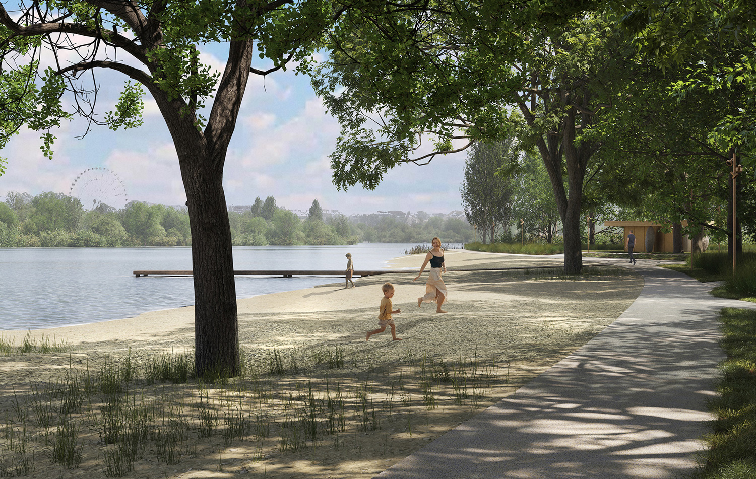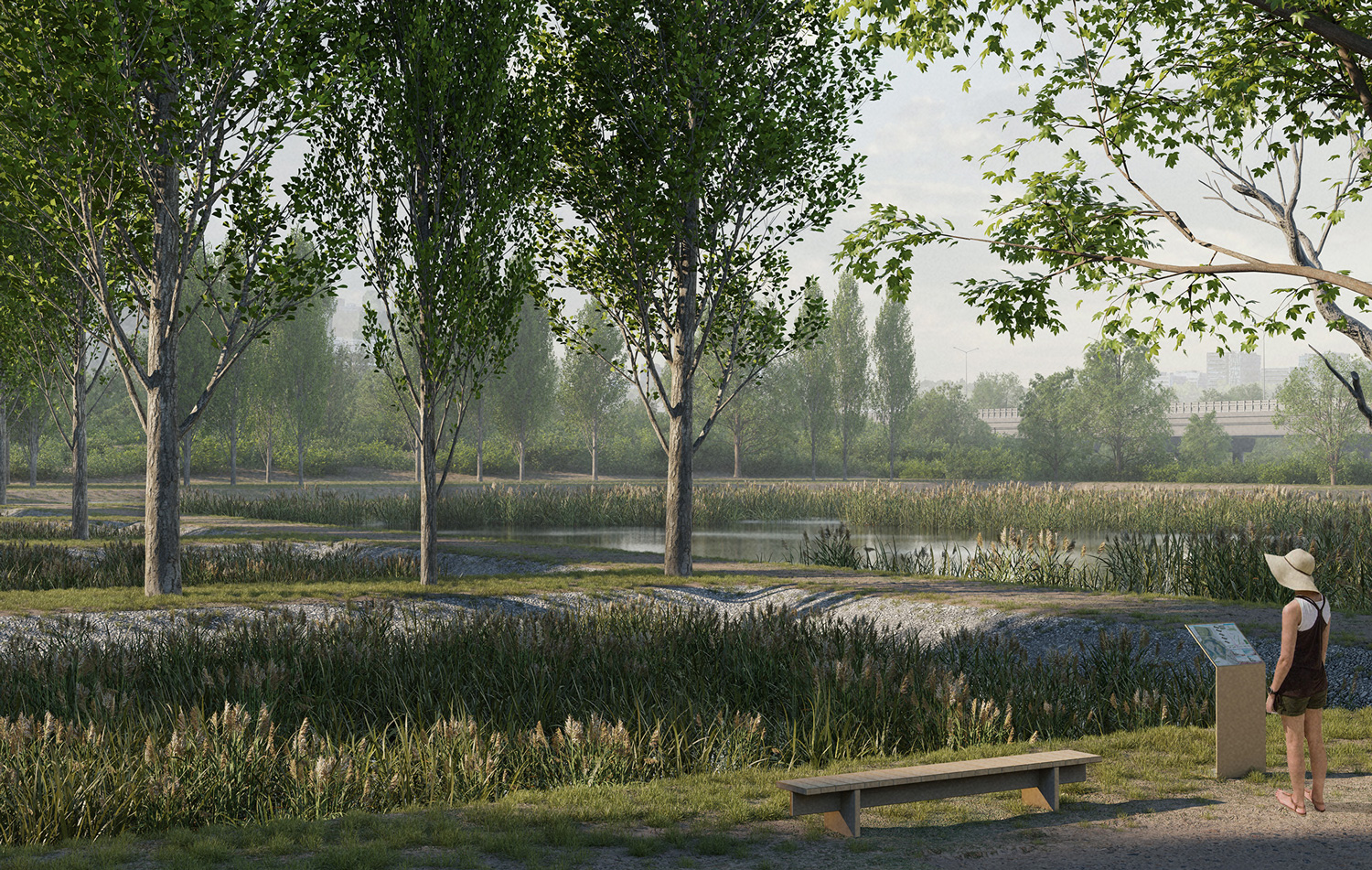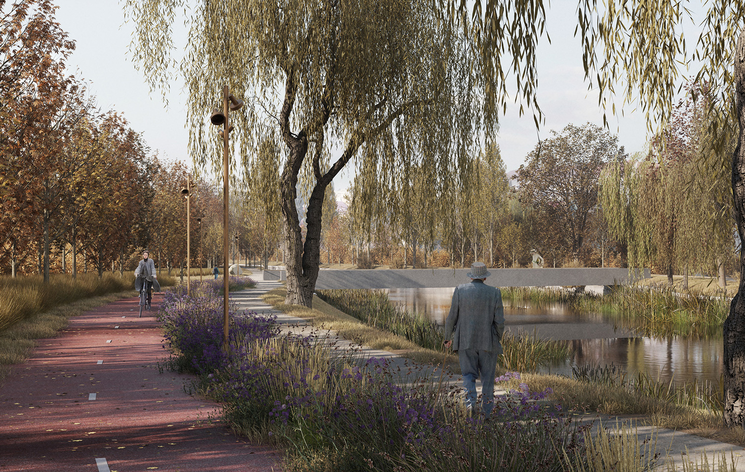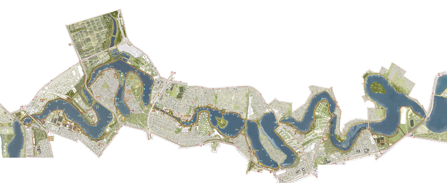 The most relevant points of connectivity with the surrounding networks are highlighted as milestones, marking a sequence of nodes of activity along the lakefronts. When these milestones are additionally placed in direct connection with the main mobility arteries of the city, they become the main gateways into the project. Among these gateways and milestones, a continuous pedestrian and bike promenade is laid out, connecting the different communities and neighborhoods along the way. The promenade leads to five newly enhanced parks, that offer green, open, public spaces to areas of the city that were previously in need to one. The entire project is materialized through natural, non-polluting materials, and non-invasive and reversible construction methods, ensuring the lasting recovery of the displaced natural habitats.