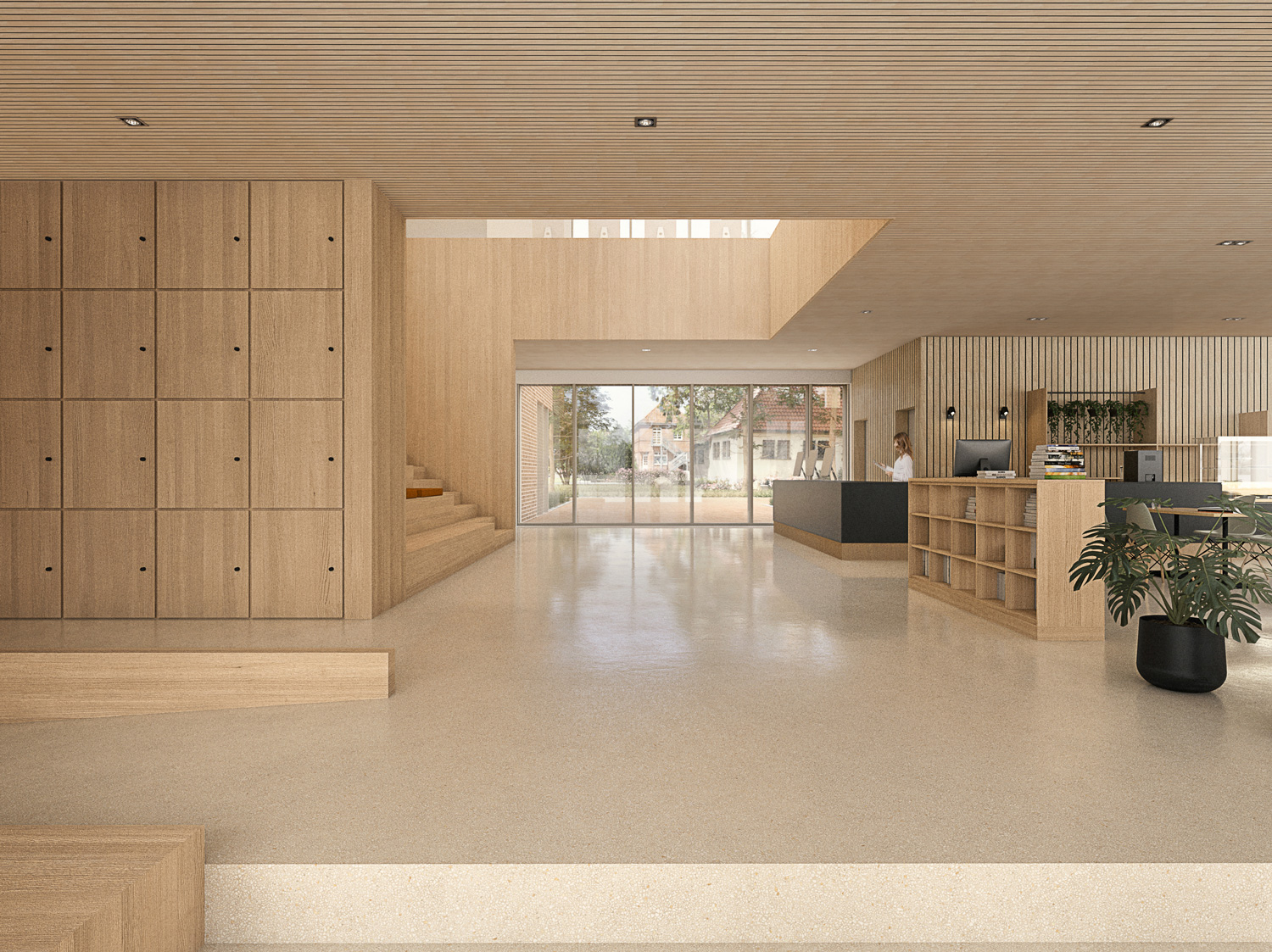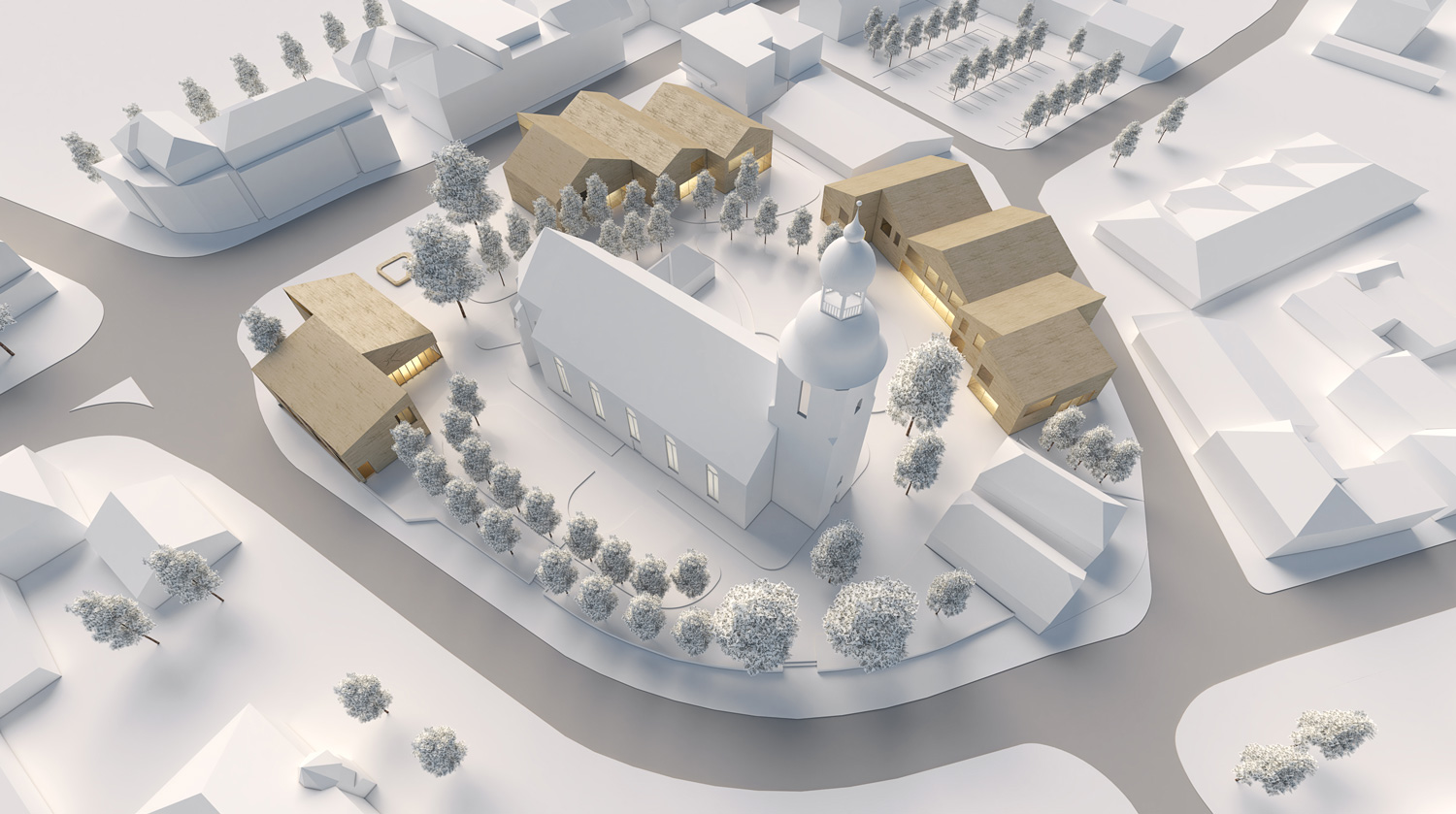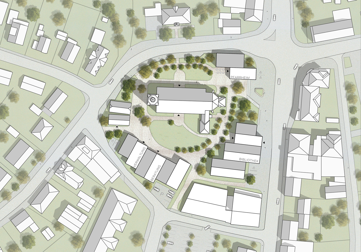 Several two- and three storey buildings of different sizes but with a uniform materiality and architectural language, will shape the new churchyard area and represent the community towards the city in a contemporary way. The buildings are grouped gable around the historic baroque church. The parish garden with its lively variety of use possibilities is deliberately positioned on the site of the former acolyte’s house towards the city centre.
