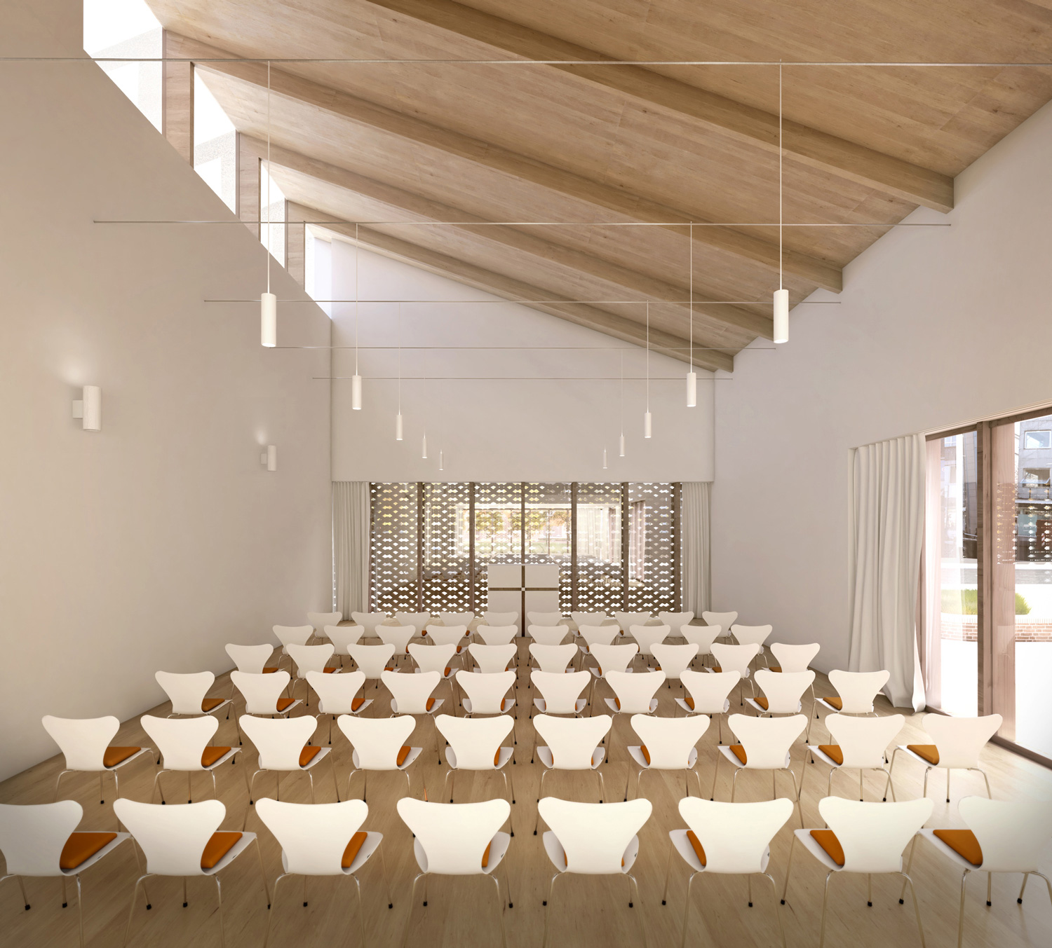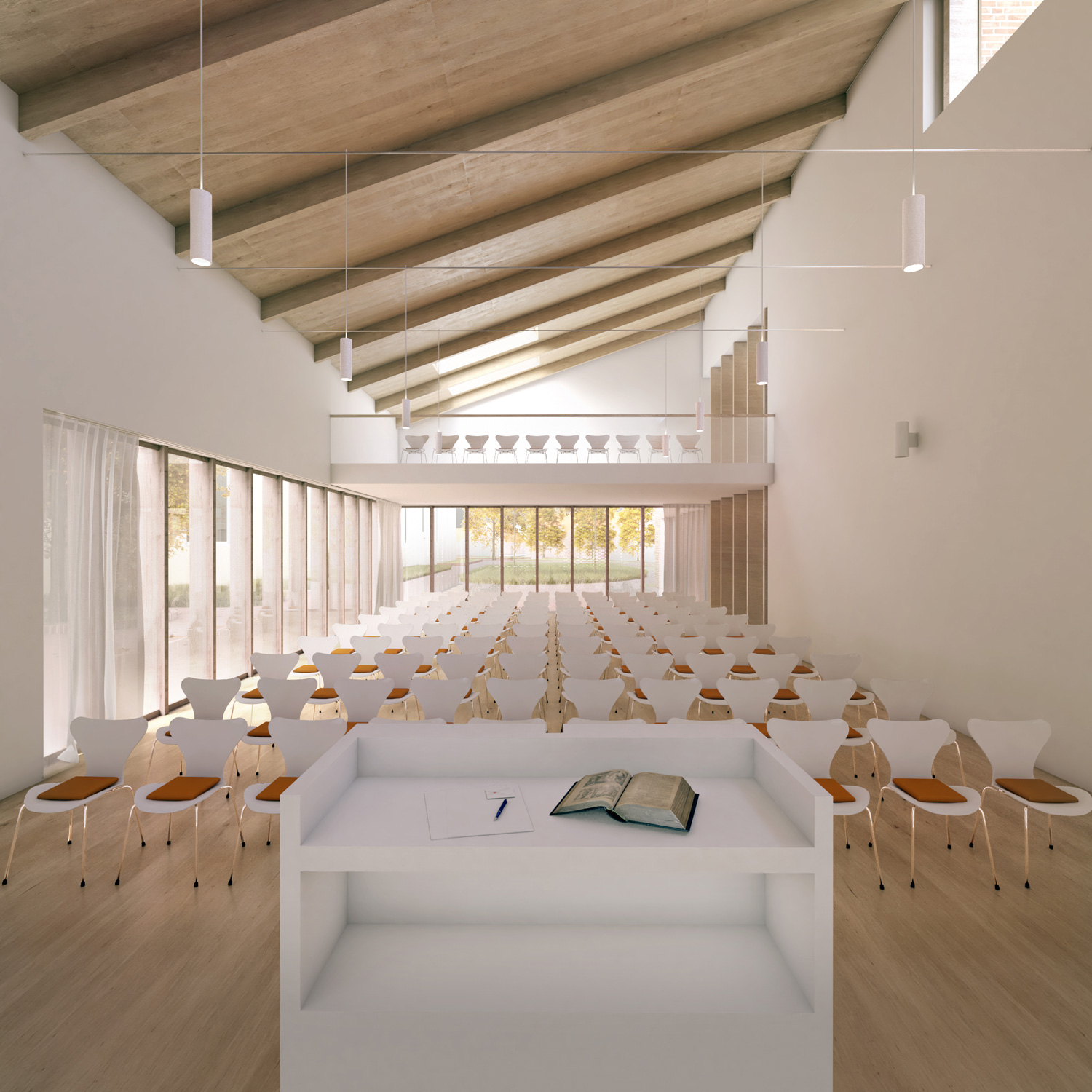 The community building is located on Loeninger Strasse, with access from both the street and the churchyard. The building masses are divided by the projections and recesses of the facades and the associated saddle and monopitch roofs. In this way, the buildings blend in with their surroundings in terms of scale and roof shape.