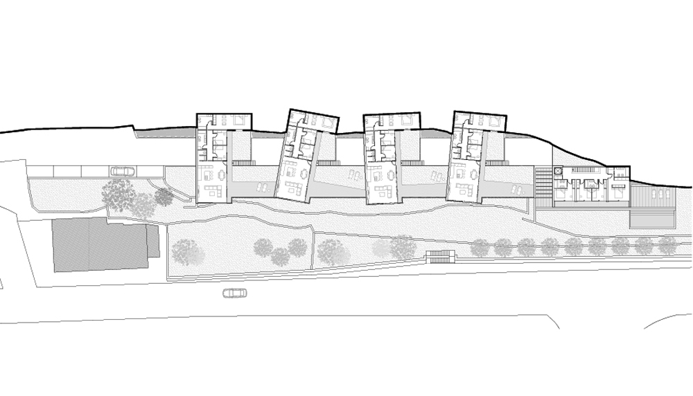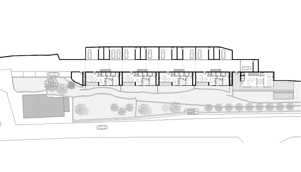 Il team di progettazione ha deciso d’intervenire, per quanto riguarda gli appartamenti, con un edificio lineare, sviluppato su due livelli sfruttando le quote del terreno, mentre come conclusione al sistema si è deciso d’inserire l’edificio unifamiliare (villa) così da privatizzare il terreno restante. Nello specifico sono previsti 4 appartamenti al piano terreno di mq. 85 netti più 30 mq. di terrazza/loggia. Al piano soprastante sono previsti ulteriori 4 appartamenti più ampi di mq. 110 netti più 50 mq. di giardino pensile e 60 mq. di terrazza. Inoltre ogni appartamento è dotato di un box doppio da 6m x 6m, più ripostiglio e cantina, e di un giardino comune con piscina.