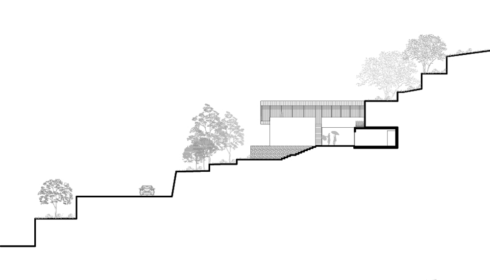 Grazie alla flessibilità del progetto, dovuta dalla qualità della soluzione adottata e dalla modularità strutturale, due appartamenti (piano terra e piano primo) possono divenire un’unica unità abitativa, e nella parte esterna del terrazzo al piano primo si può collocare una piscina privata di 6m x 4m. L’edificio unifamiliare sviluppa una superficie di circa mq. 180, oltre al doppio box ei locali accessori, più un giardino esterno di 500 mq. con piscina. Il punto chiave del progetto, che risolve gli accessi, le differenze di quote ed i percorsi, è stata la decisione di creare un sistema di distribuzione non invasivo e non percepibile dal lago. Visionando le sezioni si capisce bene lo sviluppo della strada che porta alle unità abitative, situata sul retro degli edifici, inglobata nel terreno retrostante.