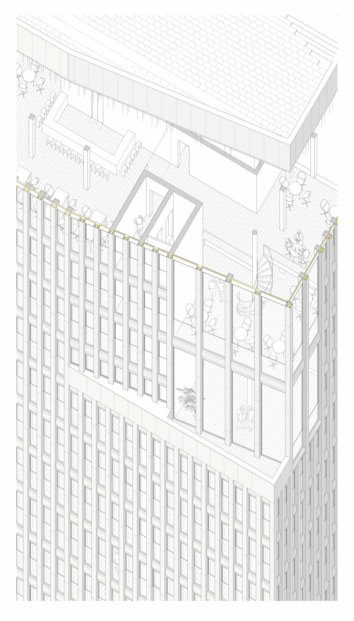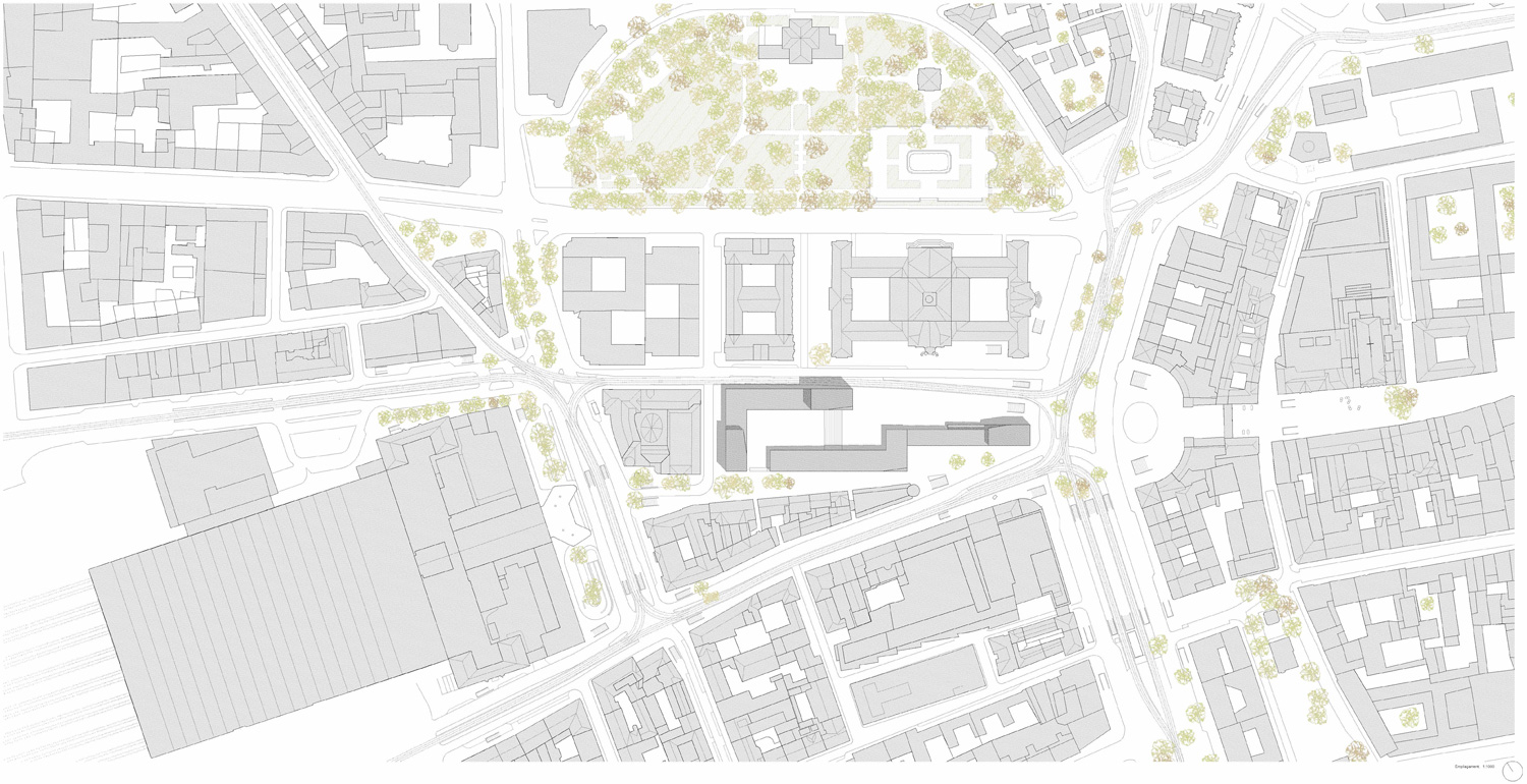 En canvi, per la cara sud hi trobem un carrer residencial amb edificis d’habitatges de gra mitjà dins el l’espectre del teixit de la ciutat residencial de Munic. Per la cota inferior, sota terra, diferents vies de tren i metro passen sota els carrers de la ciutat, però és de rellevància l’existència del centre comercial de Stachus-Karlsplatz, que s’ubica sota la plaça, sota terra, que en les ciutats del nord serveixen també per a poder comprar durant la temporada més freda de l’any, en ple hivern. A través dels passadissos del centre comercial es pot accedir a les vies tant de tren regionals com de metro intrametropolitanes. Així doncs, ens trobem en un solar cèntric, en una zona estratègica d’ús mixt. El projecte buscarà donar resposta, doncs, a una àrea de ciutat complexa, que haurà d’actuar com a element articulador i nexe entre el casc antic, l’eixample de la ciutat residencial i l’area d’equipaments i infraestructures centrals de la ciutat a la cota de l’espai public, així com l’integració del centre comercial i les vies d’infraestructura a nivell inferior sota terra.