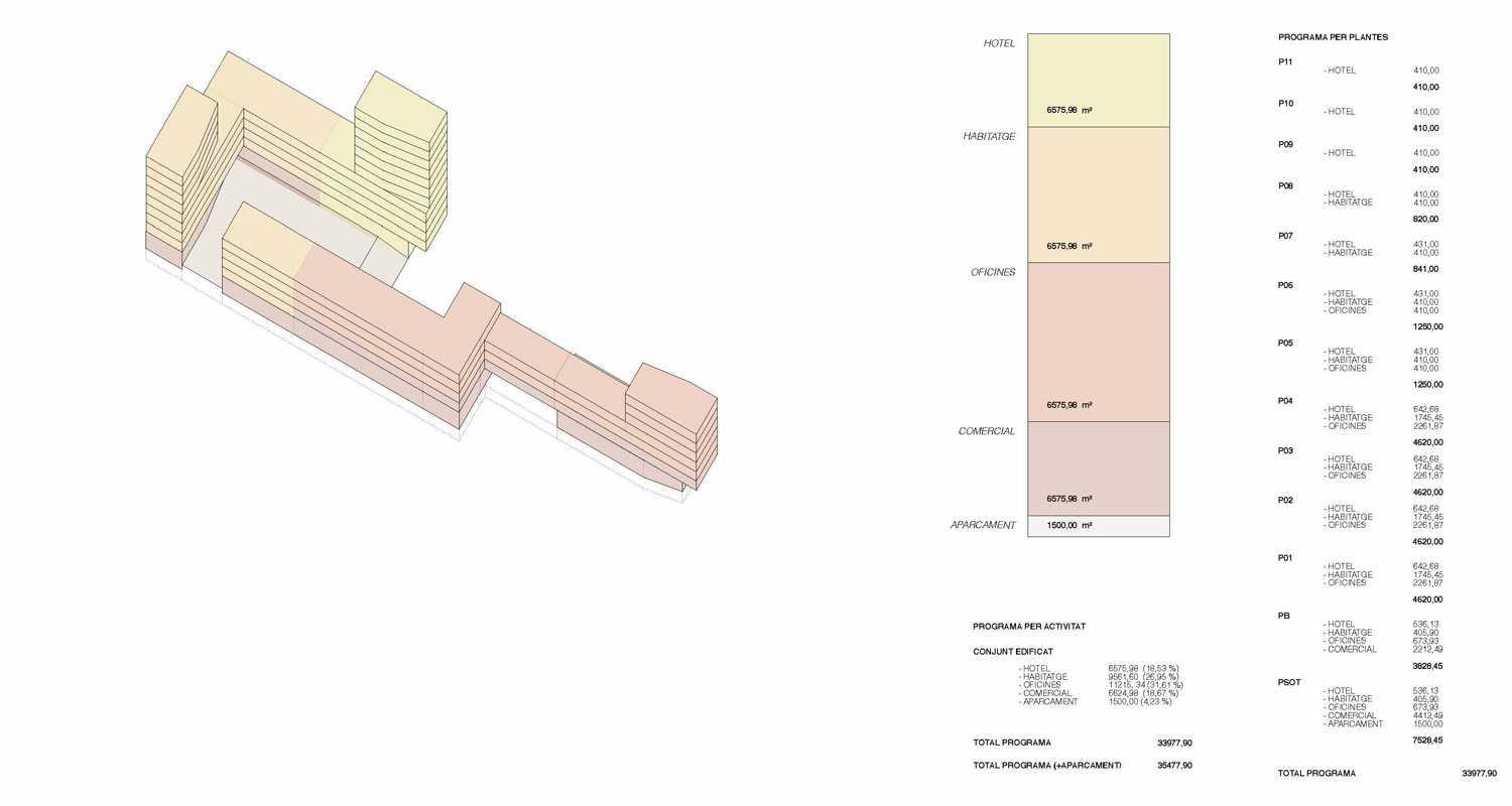 El conjunt edificat es composa del següent programa mixt de caire privat: Habitatges, Hotel, Oficines i Comercial. Es lliberen dos grans espais per a plaça pública, així com petits passatges puntuals sota edificació per a passos públics de connexió en planta baixa. El programa Comercial s’ubica en les plantes baixes, obtenint diferents espais per a locals i botigues de l’àrea, de diversos tamanys per al tipus de comerç existent a la zona. L’Hotel s’ubica en vertical en l’edifici més alt, un dels extrems que tanca la nova plaça davant del Palau de Justícia.