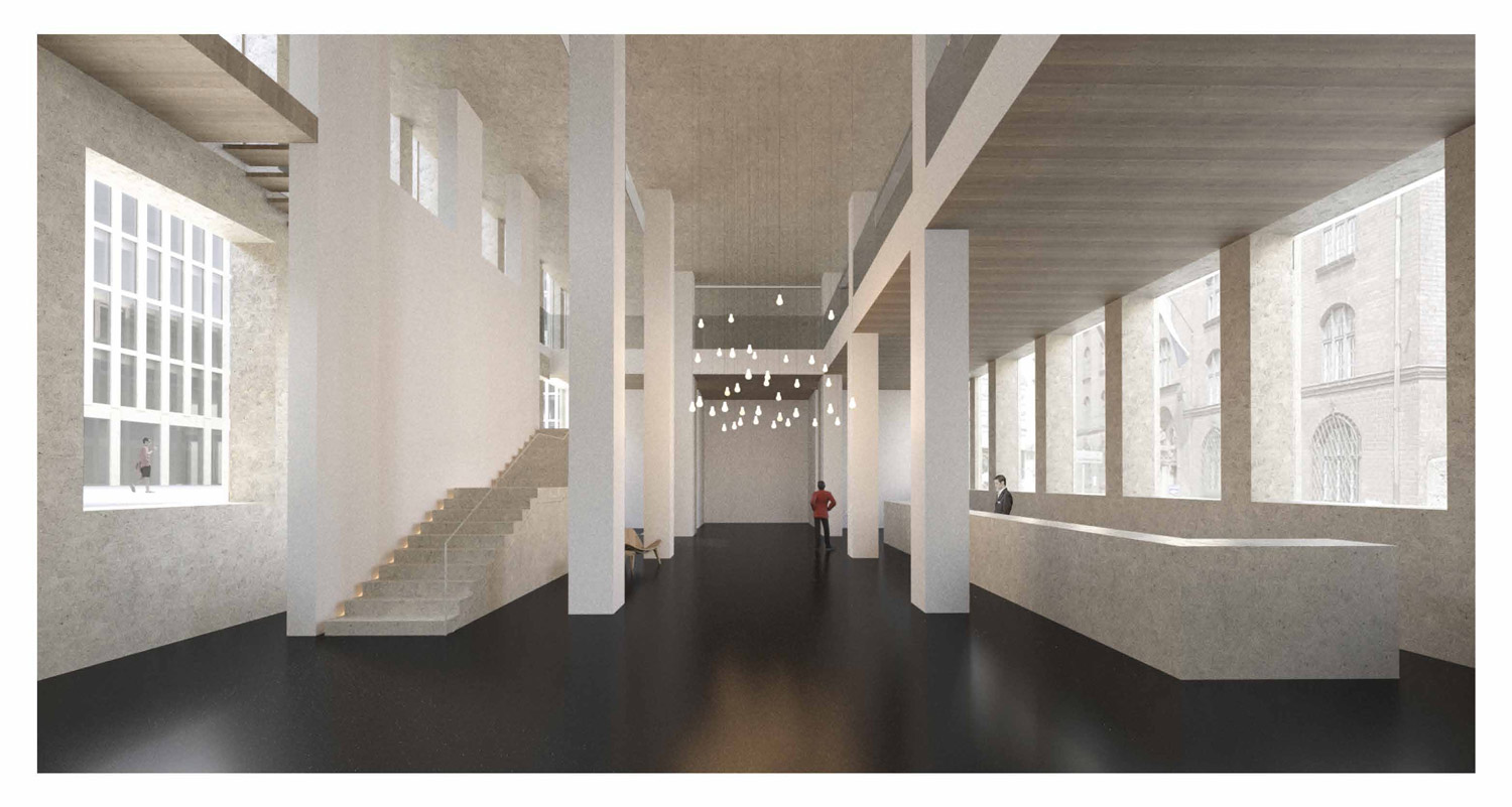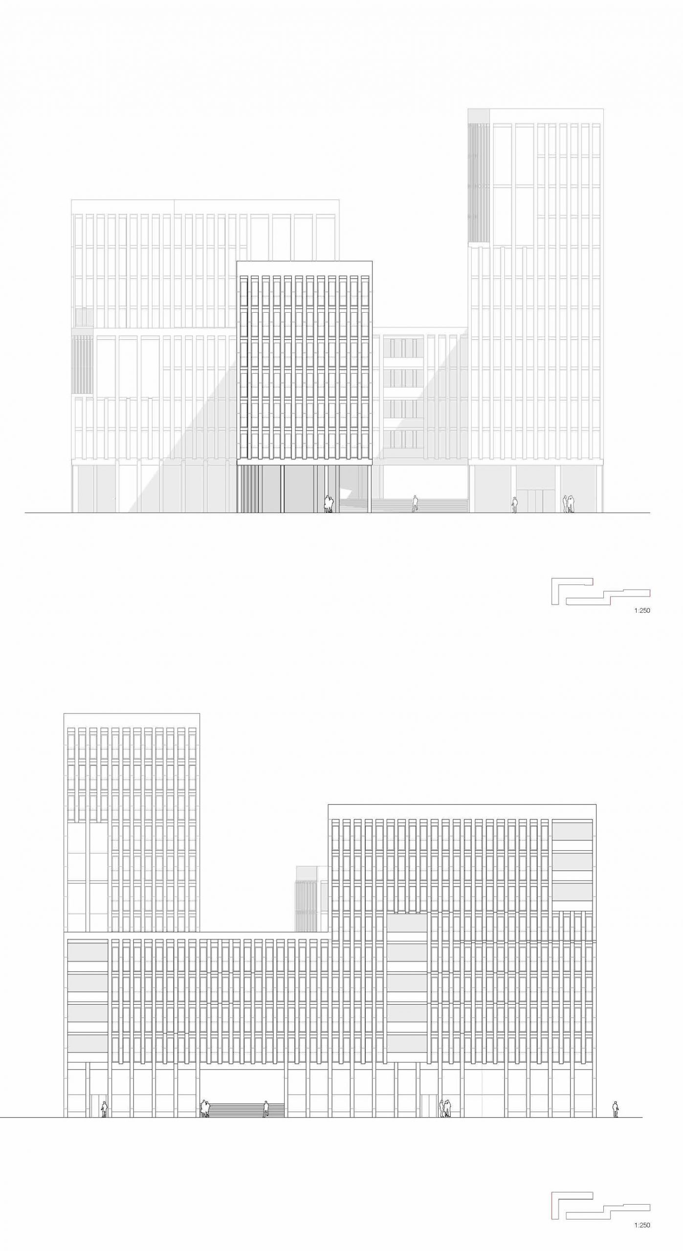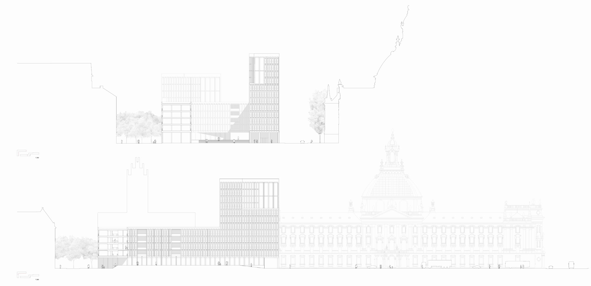 – Anclatge de la volumetria a la part posterior del solar. L’estudi de la ciutat i les diverses reflexions portaven a pensar on podem ubicar els punts alts del conjunt edificat. L’edifici més alt, no s’ubica fent front a la plaça de Karlslplatz sinó més endarrera, per la voluntat de no competir amb el palau de justícia. Ans el contrari, la creació i delimitació de la plaça davant del palau de justícia