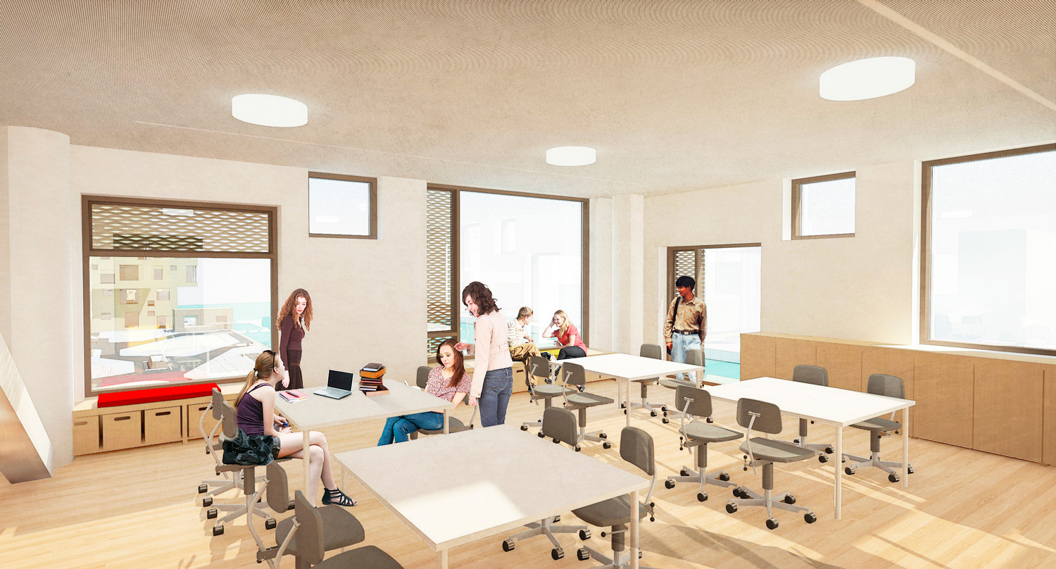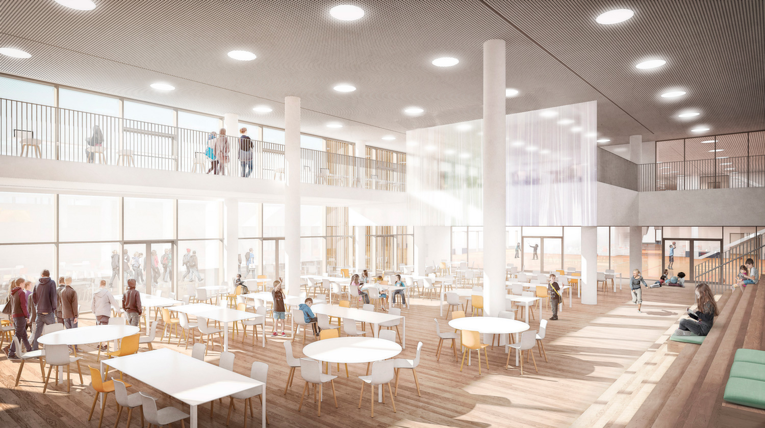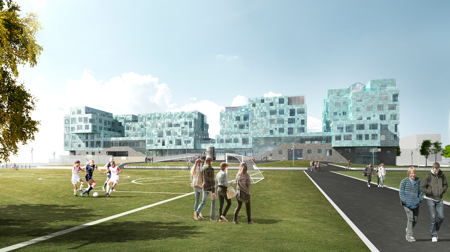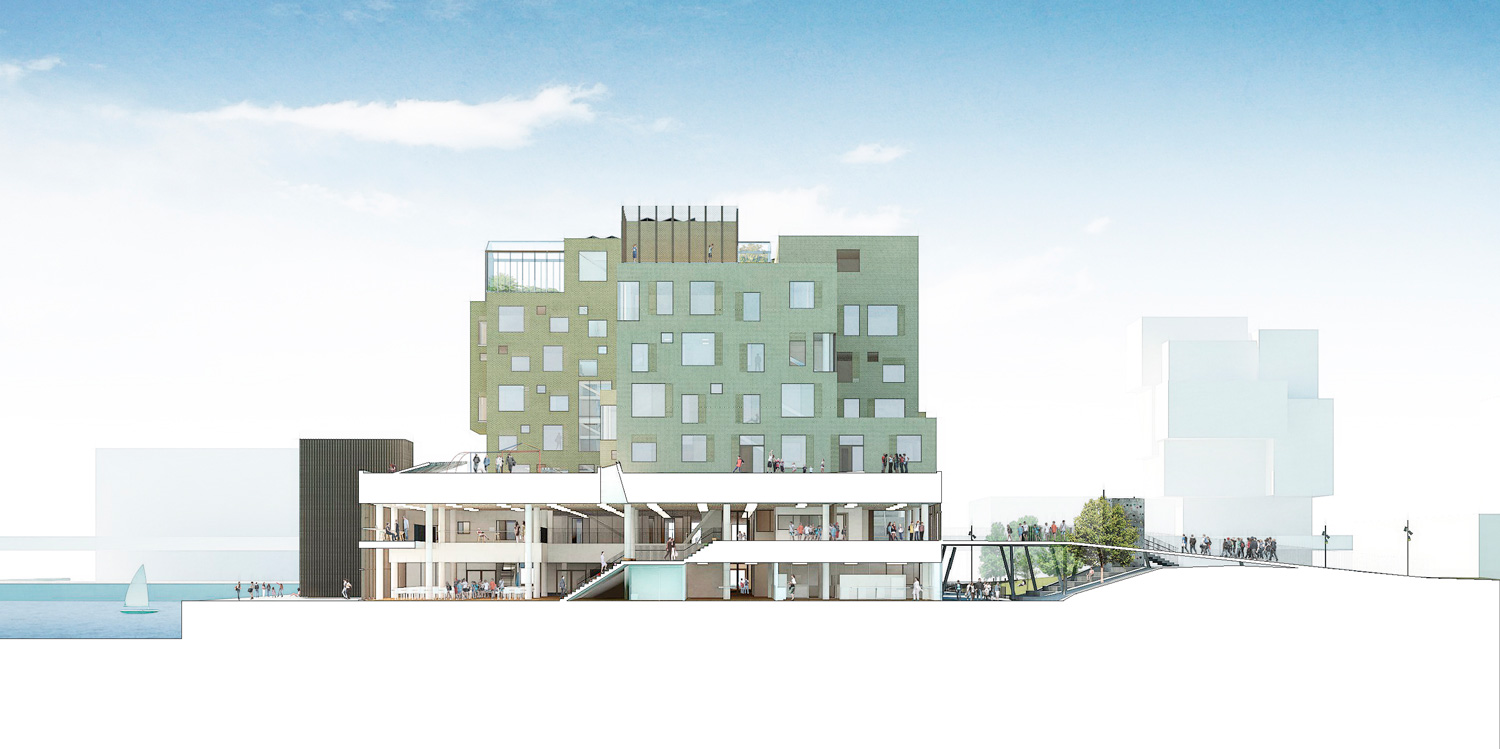 CIS Nordhavn is a new school building for the Copenhagen International School, which will be located on a prominent site in Copenhagen’s new Nordhavn district. The 25,000 m2 school building will be Copenhagen’s largest school, and accommodate 1,200 students and 280 employees. The modern educational architecture is designed to link the school premises with the public sphere in the urban environment, and give the school an open ambience. The promenade outside the school will become an urban port-side space providing opportunities for relaxation and various activities. The main school building is subdivided into four smaller “towers”, ranging from five to seven storeys, each specially adapted to meet the needs of children at different stages of development. For example, the classrooms for the youngest pupils are particularly large: A full range of functions will take place in and around the classroom, each of which has designated green spaces and areas with drama/performance facilities, PE, etc. The subdivision of the school into four units facilitates community, identity and easy wayfinding. All four school units are built on top of the ground-floor base, which contains common and more extrovert activities, including a foyer, sports facilities, a canteen, a library and performance facilities.