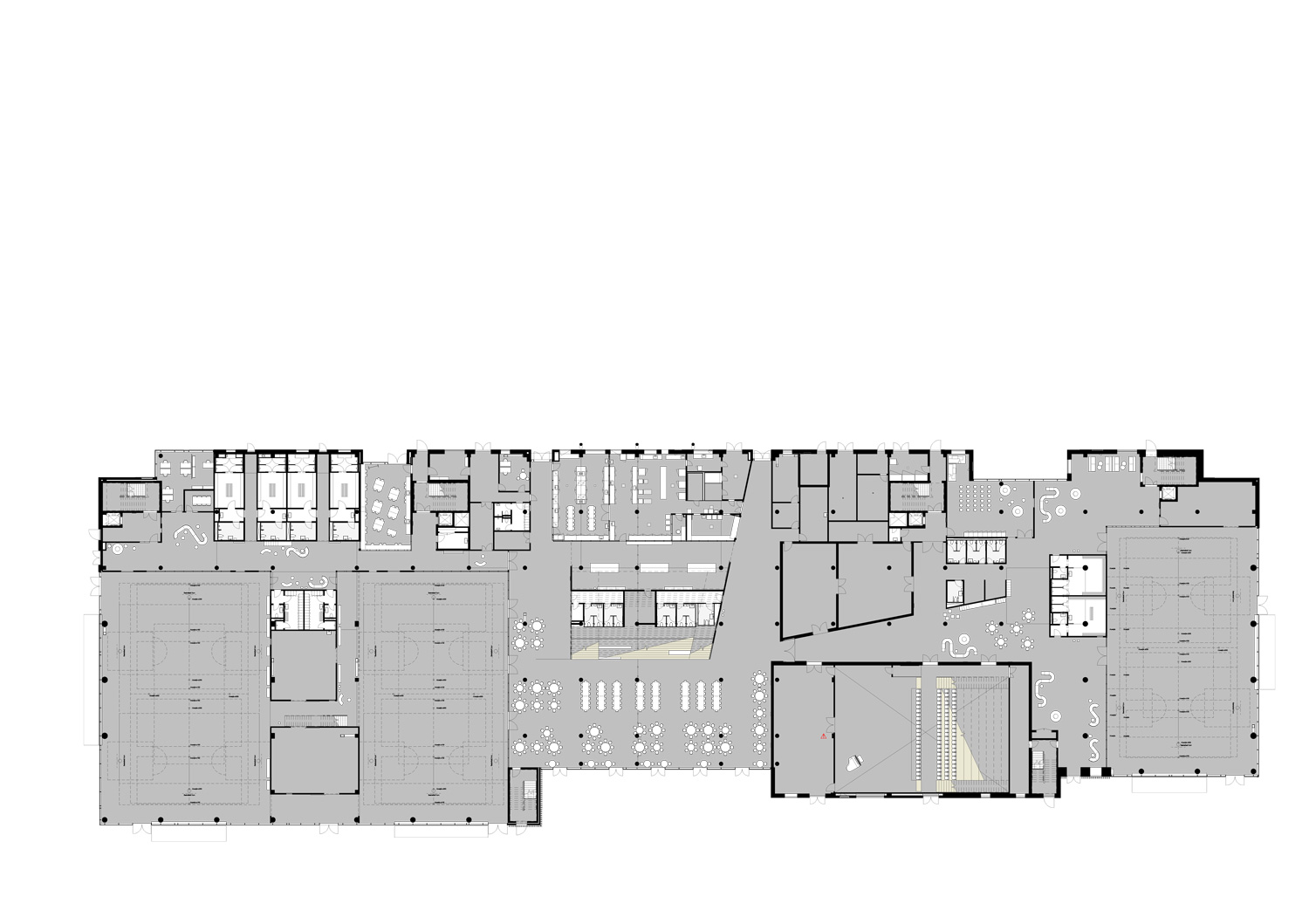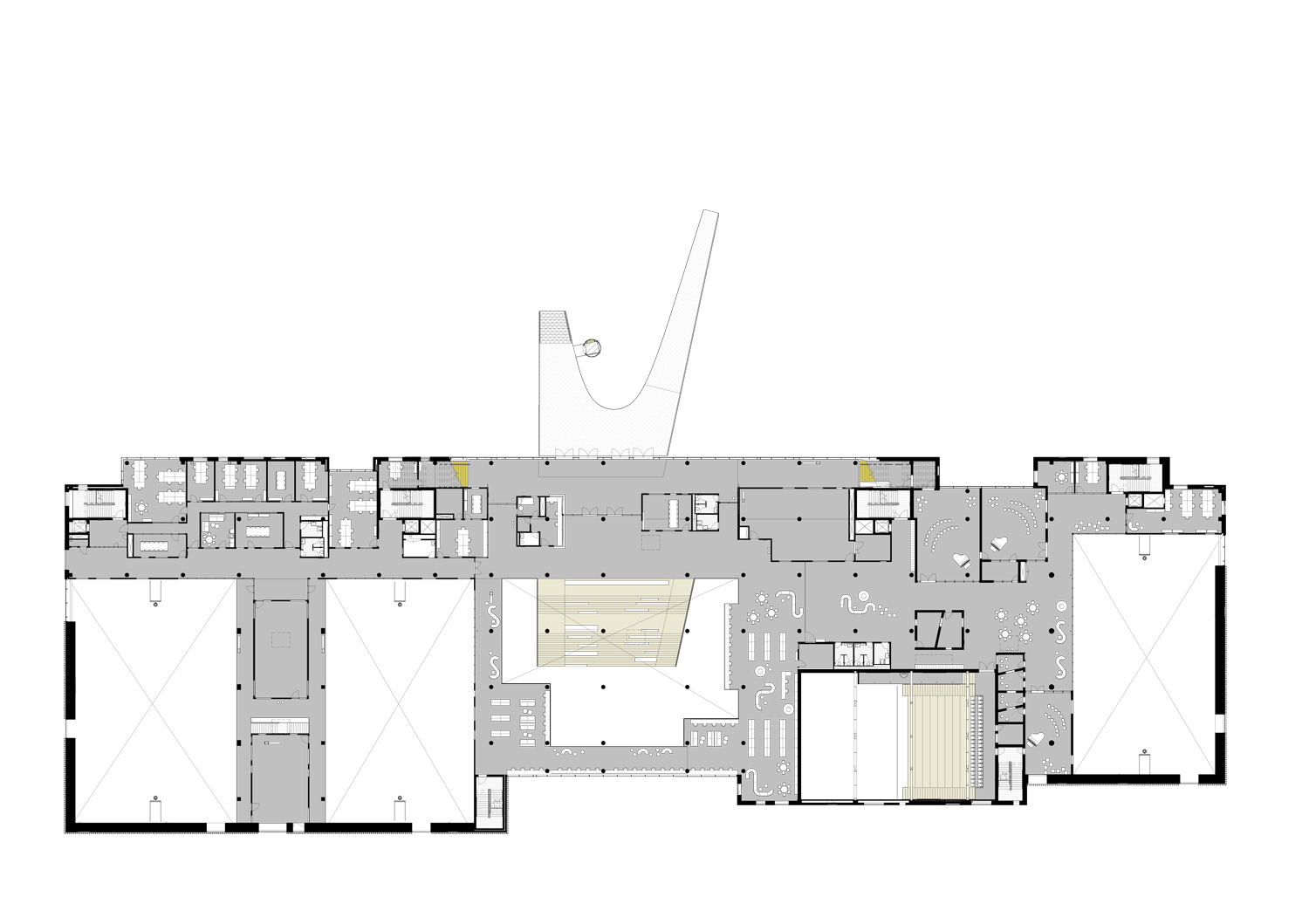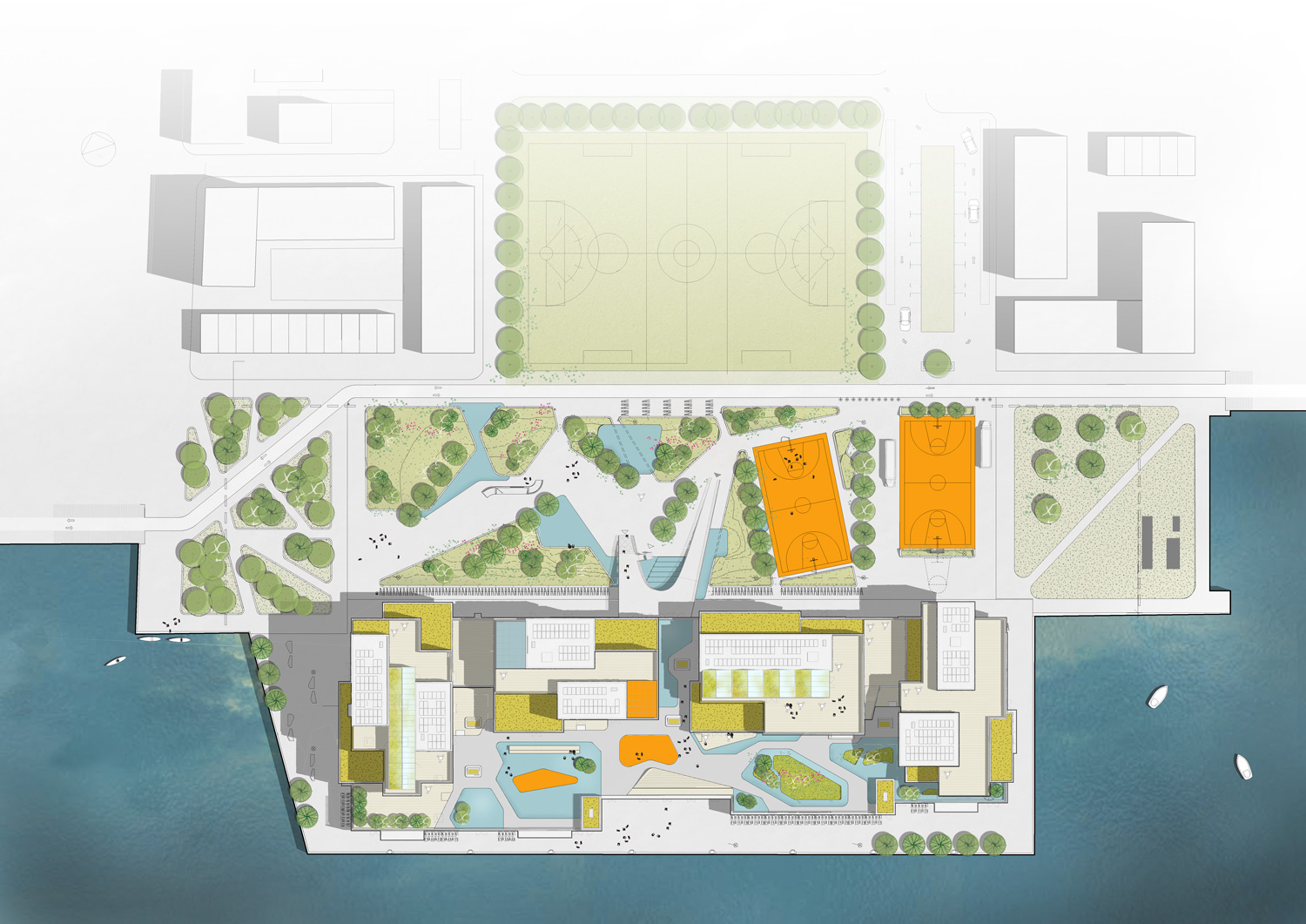 CIS Nordhavn is a new school building for the Copenhagen International School, which will be located on a prominent site in Copenhagen’s new Nordhavn district. The 25,000 m2 school building will be Copenhagen’s largest school, and accommodate 1,200 students and 280 employees. The modern educational architecture is designed to link the school premises with the public sphere in the urban environment, and give the school an open ambience. The promenade outside the school will become an urban port-side space providing opportunities for relaxation and various activities. The main school building is subdivided into four smaller “towers”, ranging from five to seven storeys, each specially adapted to meet the needs of children at different stages of development. For example, the classrooms for the youngest pupils are particularly large: A full range of functions will take place in and around the classroom, each of which has designated green spaces and areas with drama/performance facilities, PE, etc. The subdivision of the school into four units facilitates community, identity and easy wayfinding. All four school units are built on top of the ground-floor base, which contains common and more extrovert activities, including a foyer, sports facilities, a canteen, a library and performance facilities.