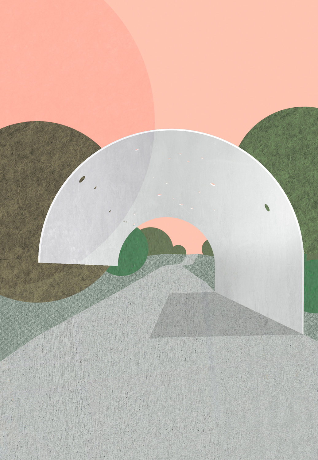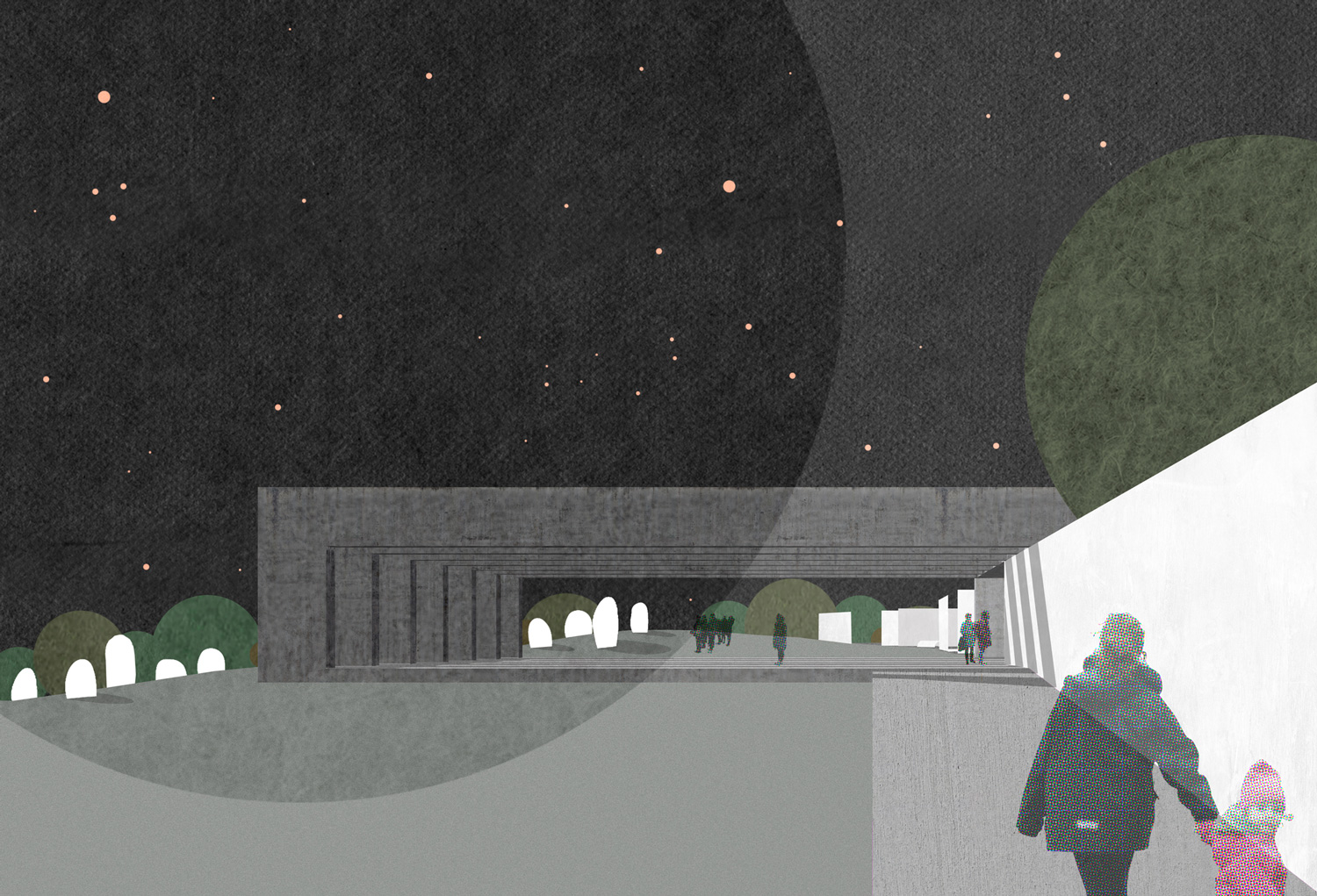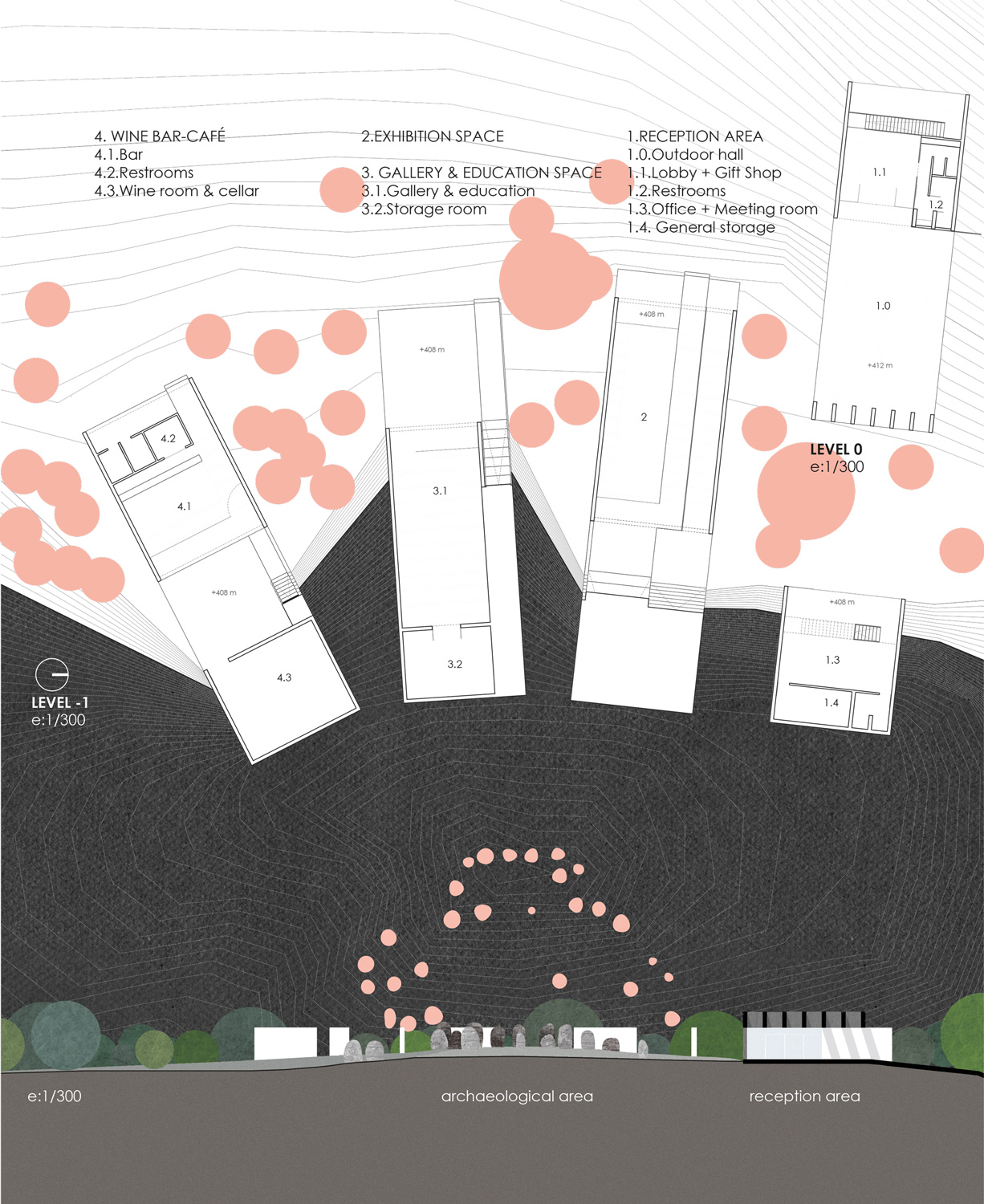 Existen lugares mágicos que han permanecido junto a nosotros durante miles de años, espacios que nos despiertan sensaciones ancestrales de pertenencia a una realidad infinitamente más grande que nosotros, rincones que pretenden conectar tierra y cosmos. El Crómlech dos Almendres (Cromeleque dos Almendres en portugués) es uno de ellos: un conjunto megalítico de gran importancia dentro de la península Ibérica del que se puede destacar su dimensión, además del estado de conservación de los monolitos que lo forman. Nada hay alrededor de los mismos más que árboles, una gran explanada en forma de elipse delimitada por menhires de hasta 3 metros de altura domina una colina a la que conseguimos llegar a través de un camino de tierra. Al instante reconocemos la importancia del sitio y consideramos que cualquier intervención que hiciéramos no tendría que competir con la conmoción que genera el descubrimiento de un lugar así perdido entre un bosque de almendros. El proyecto busca de esta manera presentar su respeto a los restos. Sin más referencias formales, aprovechamos la cota para asentar el programa por debajo de la rasante de los menhires, justo en el lado contrario de la colina donde aparecen estos. El uso lo generamos con unas estructuras sólidas construidas con hormigón que se amoldan a la pendiente existente y todas tienen, como hilo conductor, la intención de buscar constantemente el contacto con los monolitos.