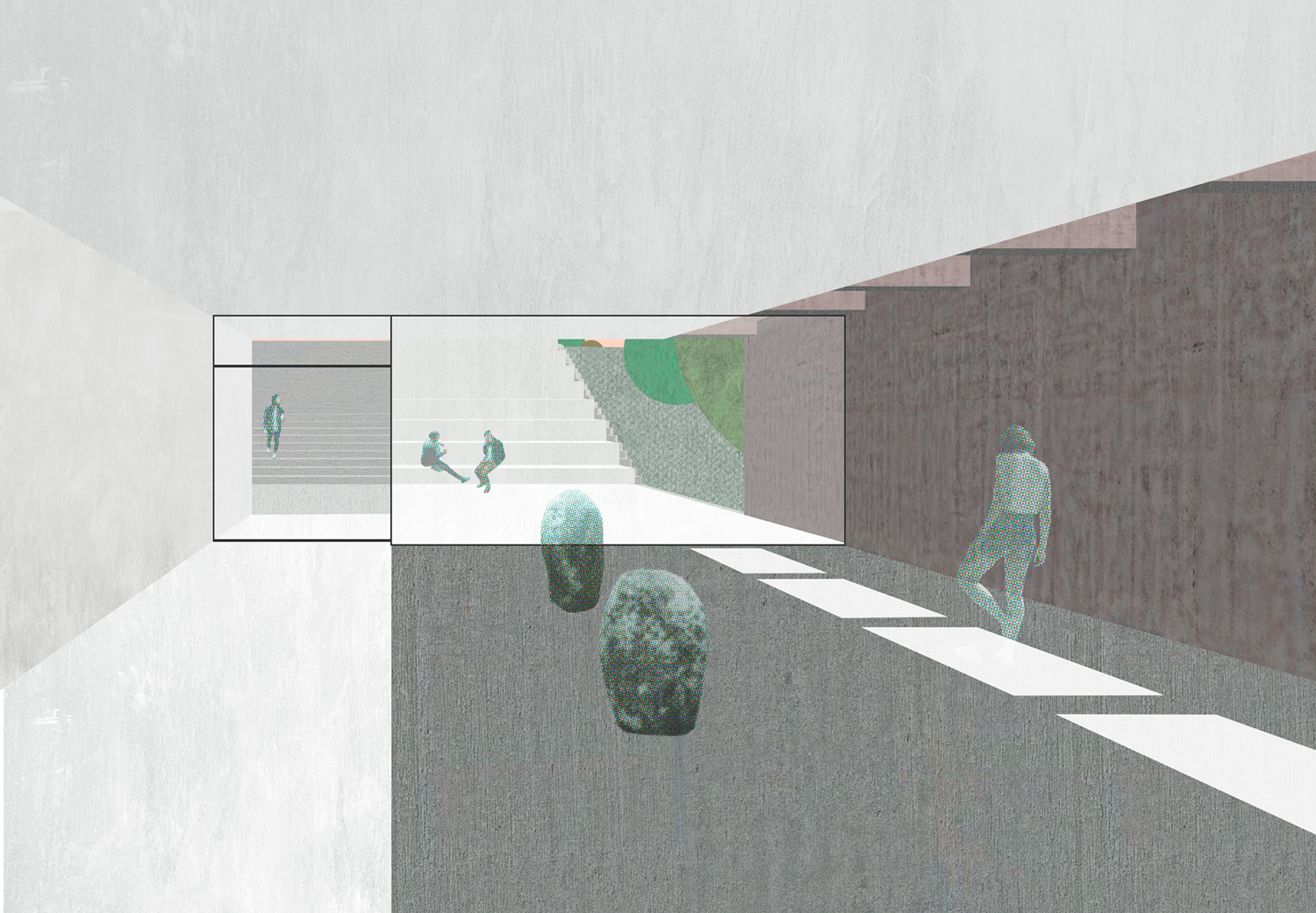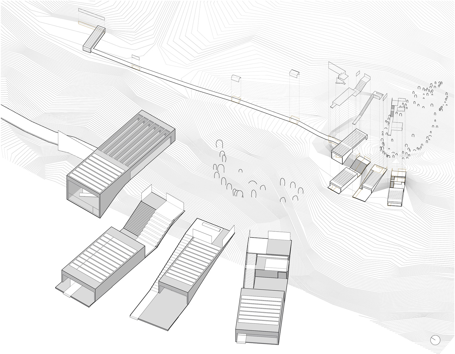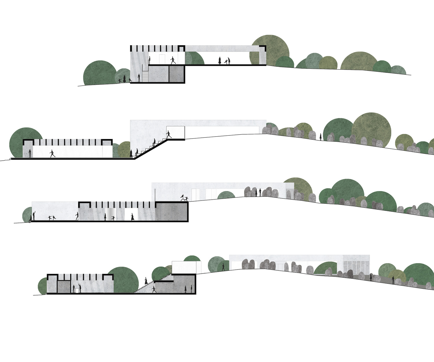 Aparecen así elementos tales como gradas, escaleras longitudinales o plataformas a varios niveles, que intentan unir programa y menhires. Solo existe un elemento sobre rasante, el programa de recepción que abraza a un gran espacio aporticado y que nos recibe, como elemento final de un camino que recorremos desde el aparcamiento y como inicio para conocer el conjunto megalítico que se abre ante nosotros. Finalmente, todas estas piezas se unen a través un hilo que va hilvanando el programa y los recorridos, un hilo blanco metálico que dibuja una línea que nos guía desde que dejamos el coche en el aparcamiento y que nos invita a descubrir el misterio que se oculta al final del mismo. Esta piel blanca a veces es camino, pero otras veces se transforma en espacios significativos, o bien enfocan puntos de interés. Por último, en el área de los restos, son sencillos planos que conforman un fondo de escena donde los menhires son los protagonistas y a su vez indican que debajo de los mismos se desarrolla el resto del programa. Piedra y piel.