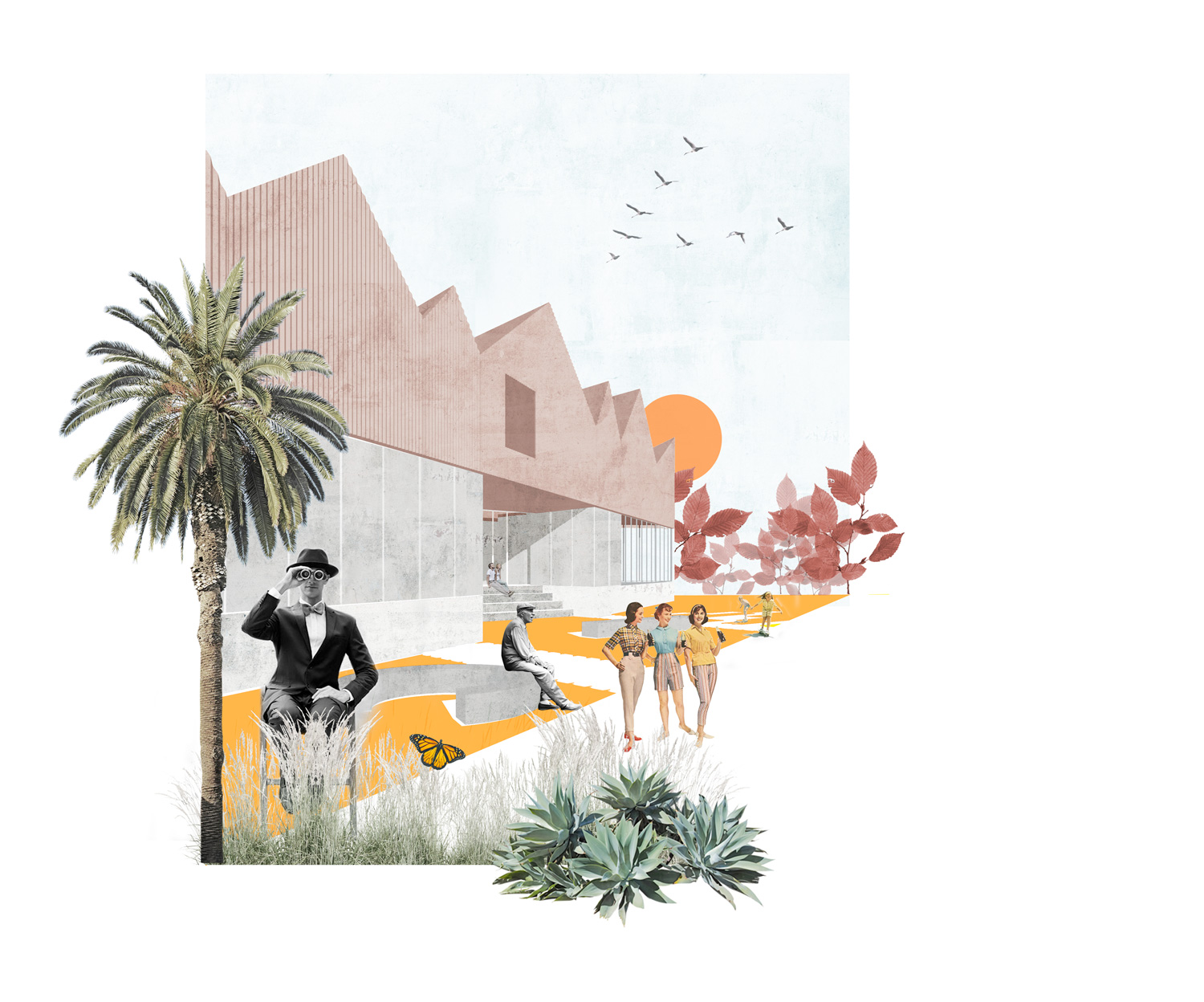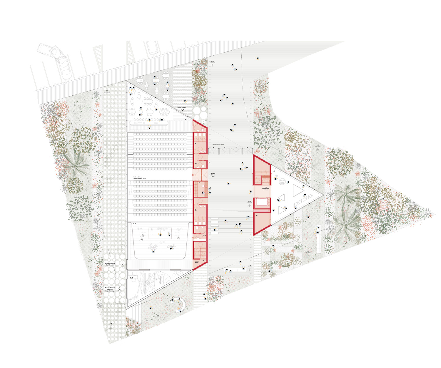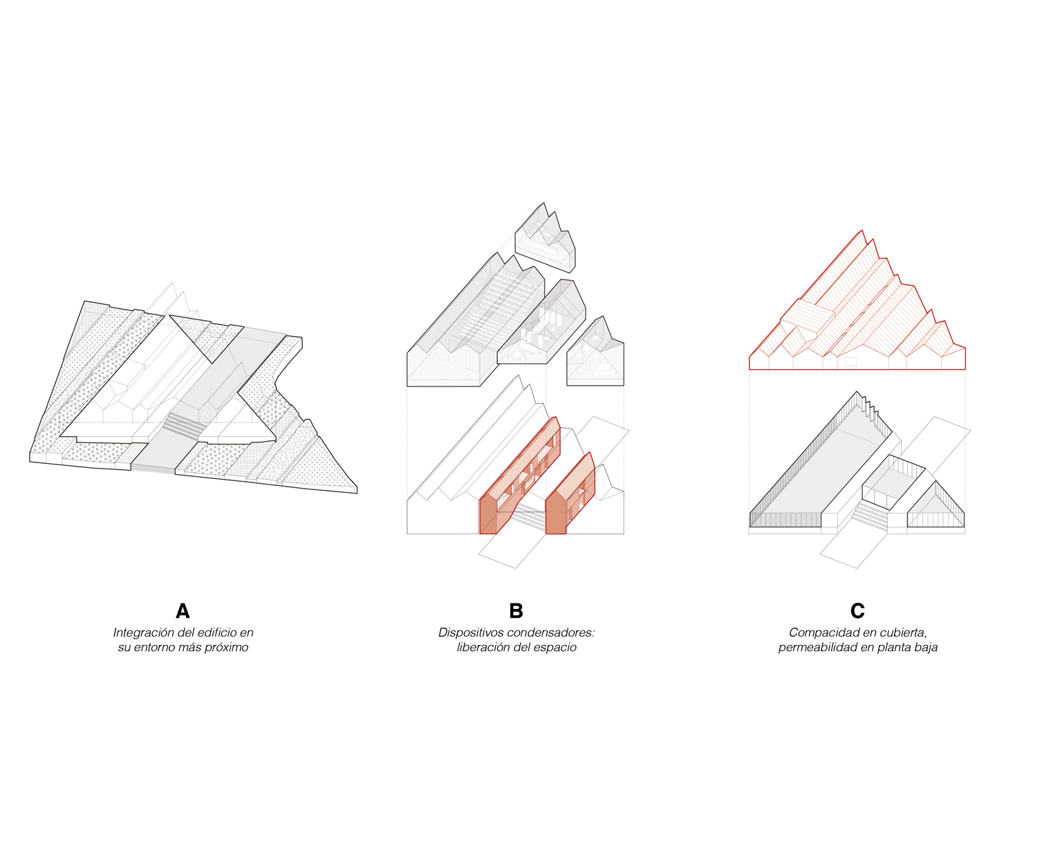 Se parte del entendimiento de la geometría como condición territorial. El entorno y la planta baja son proyectados como un solo elemento. De esta manera, el orden geométrico aplicado sobre la parcela se desmaterializa y ofrece un perímetro cambiante capaz de romper los límites del edificio. Una especie de pasarela irrumpe desde el exterior, atraviesa el edificio, y pone en valor este hecho. Es así como el usuario focaliza su vista hacia un recorrido que, desde cualquier punto del hall, enmarca el paisaje. Esta actuación pretende llamar la atención del usuario, invitándole a entrar y a descubrir, desde el espacio de acceso, cualquiera de los programas.