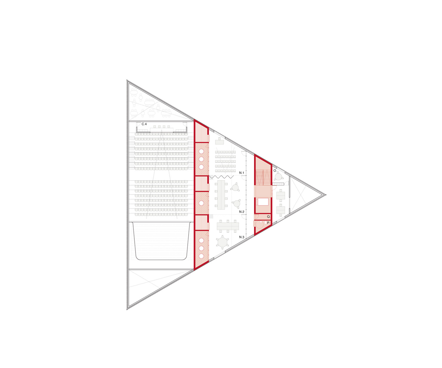 Esta estrategia de regularización en bandas, alcanza un mayor grado de complejidad en lo que al edificio se refiere. El triángulo es fragmentado en cinco crujías, tomando la segunda y la cuarta un carácter completamente singular. Estas dos bandas se convierten en dispositivos condensadores.
