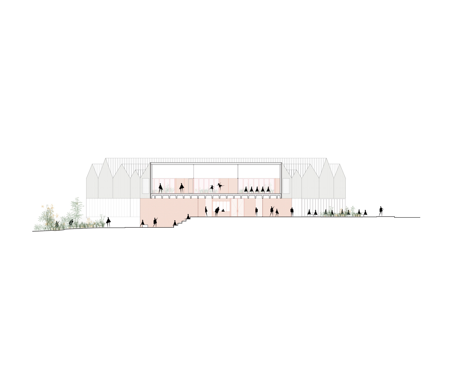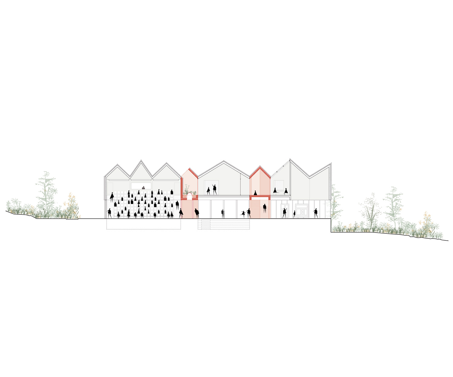 Este sistema de órdenes, regido por una ley geométrica, hace posible vincular la forma en planta con su volumetría y al mismo tiempo, adaptarse a las condiciones del entorno. Así, cada uno de los volúmenes a dos aguas se corresponde directamente con lo que ocurre en su interior. Planta primera y cubierta quedan entrelazados, funcionando como un solo volumen, sólido y compacto. Como si de un gorro se tratara, se apoya sobre una base ligera. La permeabilidad de esta planta baja contrasta con lo anterior, favoreciendo esa relación directa y evidente con aquello que rodea.