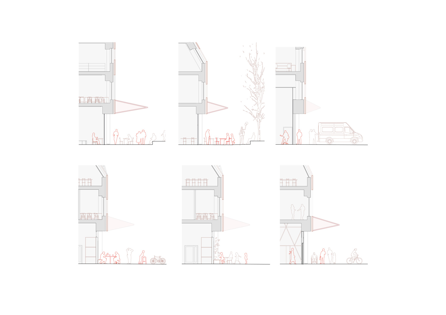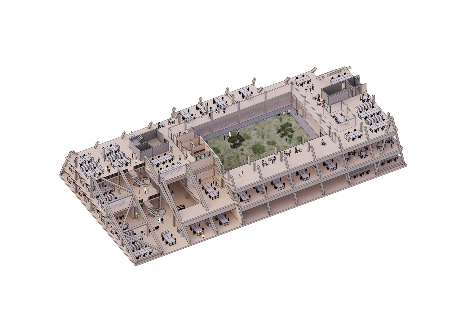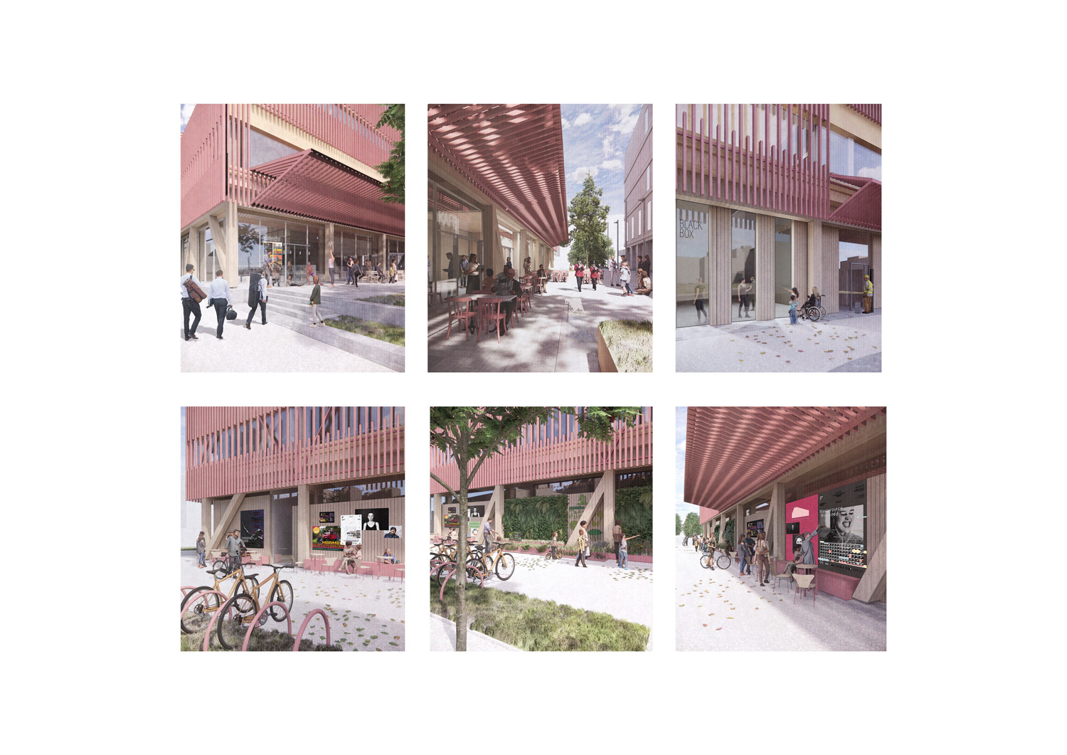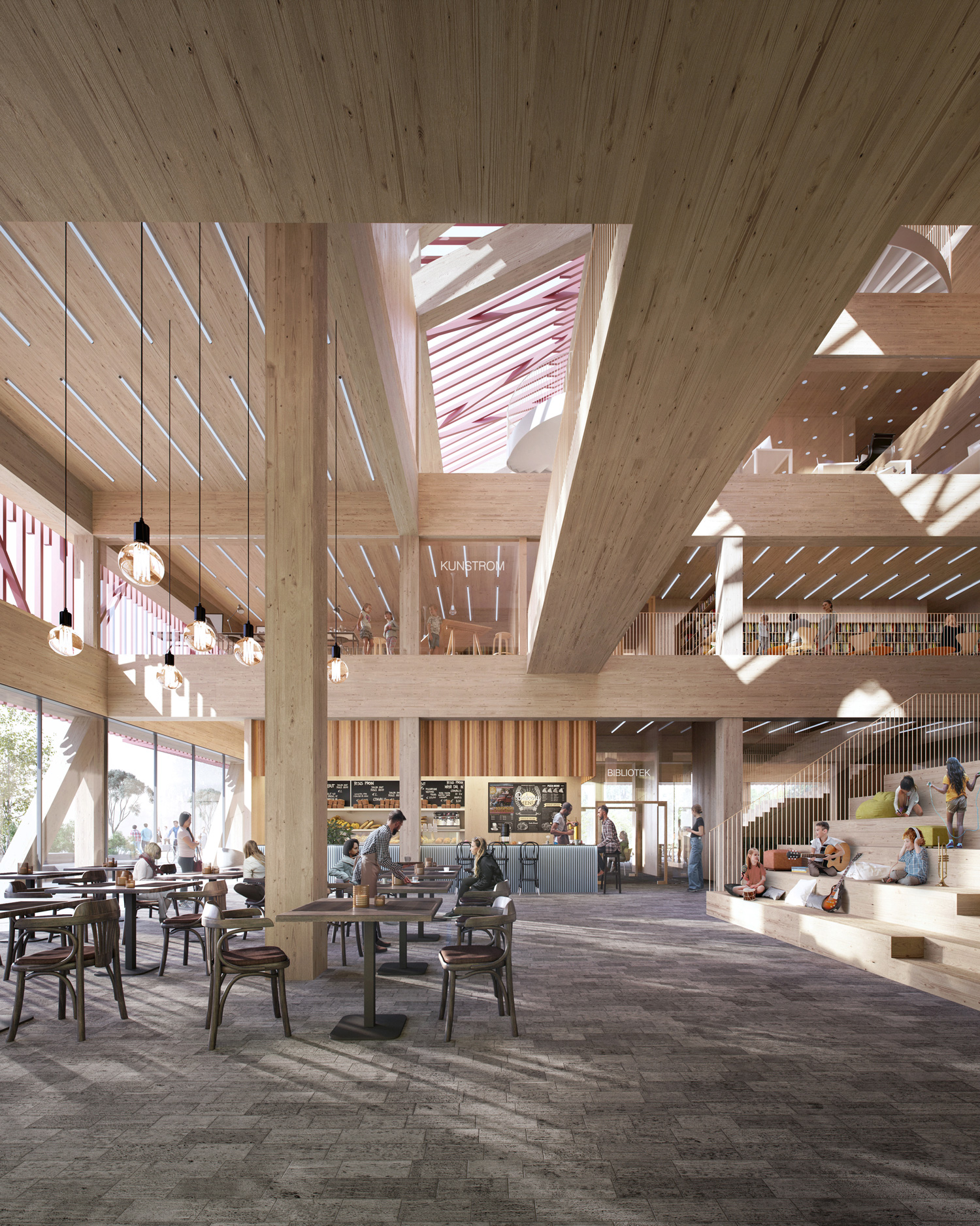 It is framed by a welcoming canopy breaking down the scale and creating a sense of domesticity all around. We build in wood and learn from the west-coast structure informed by scarcity of material and establish dialogue with the ambitious transformation of the area in the 1970. Columns and beams in CLT are intended, and cover of wood with concrete screed.