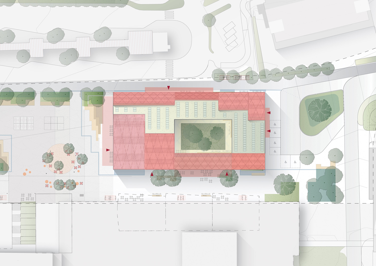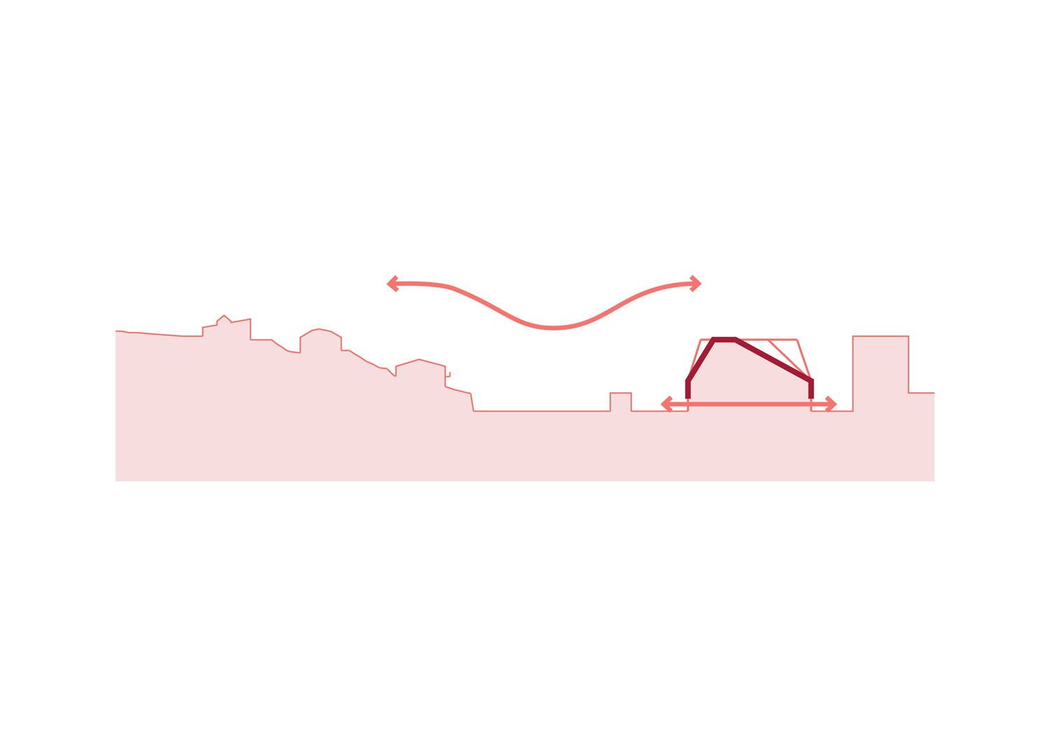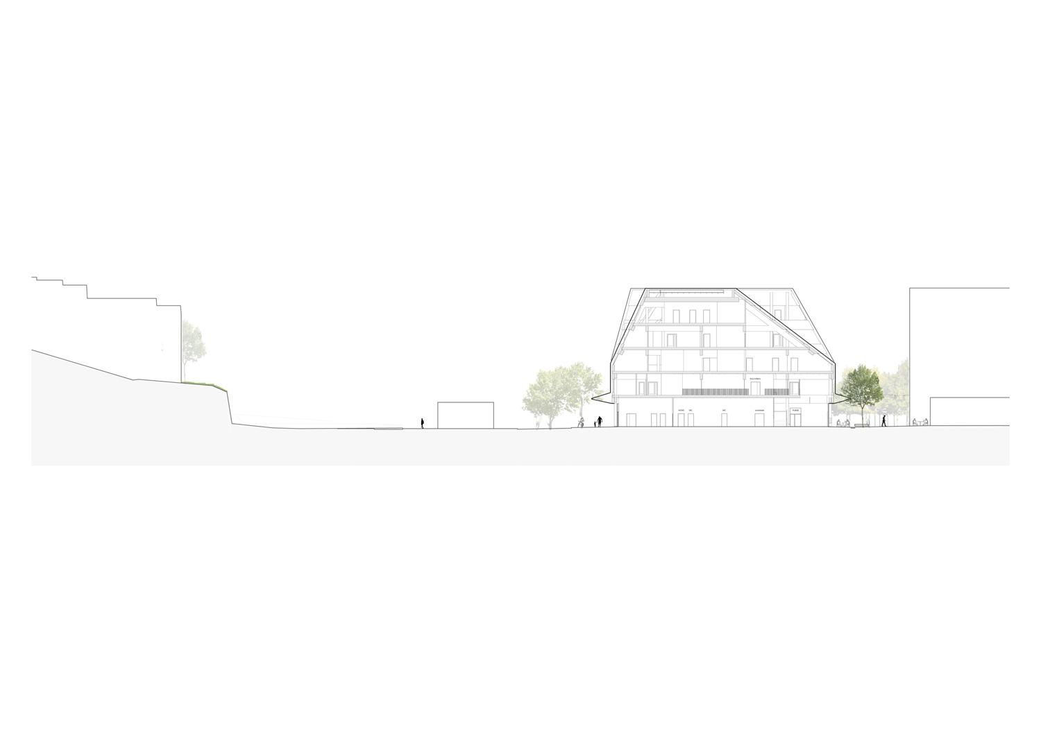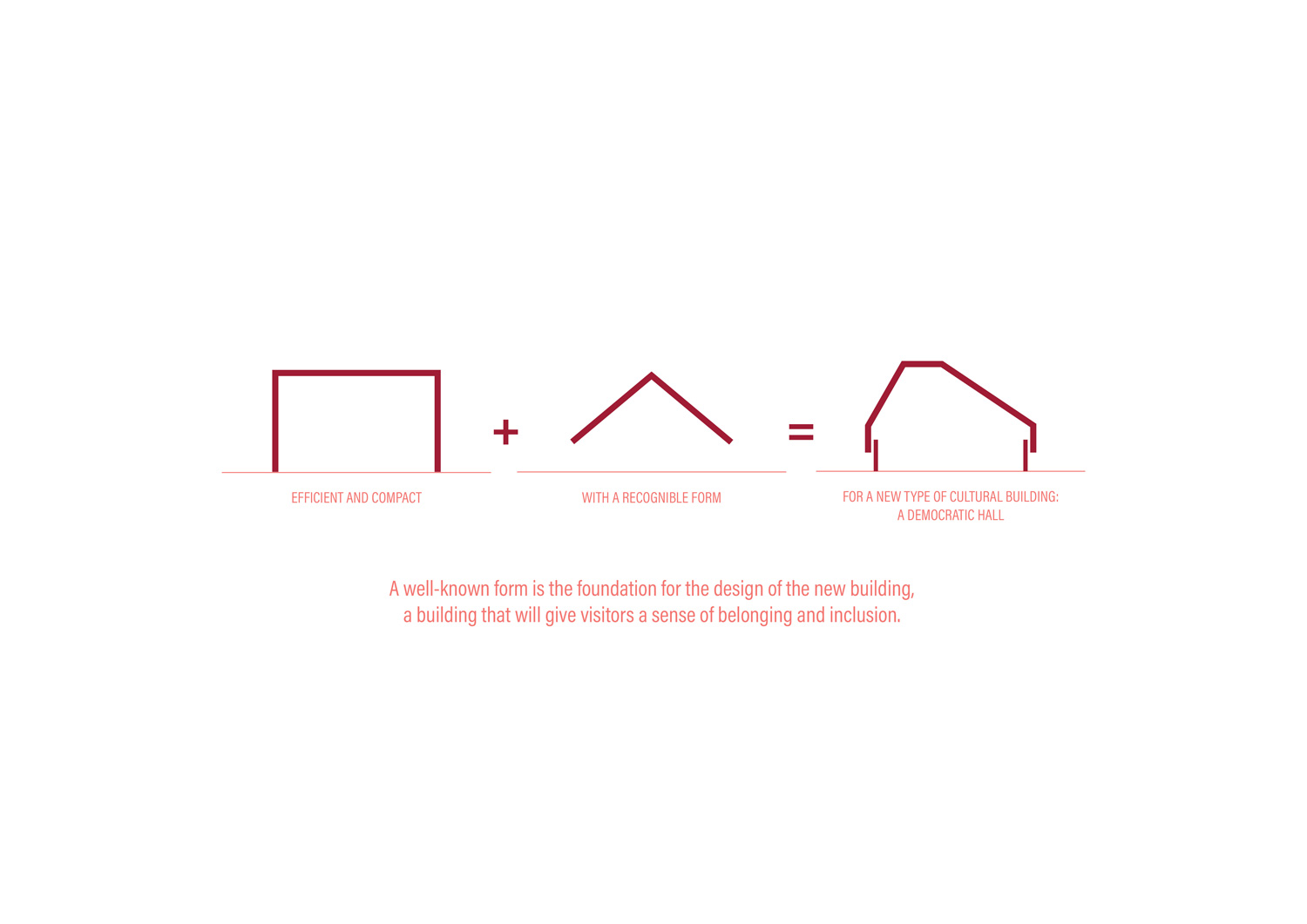 A well-known shape is the foundation for the design of the new building we give visitor and user a sense of belonging while mediating the different typology of the valley. We resist the call for a grand entrance and focus on a porous ground floor with no front or back mediating terrain and existing typology into a simple volume. We create an active plaza, a lively street, an interactive bus-stop facade and visible technical space.