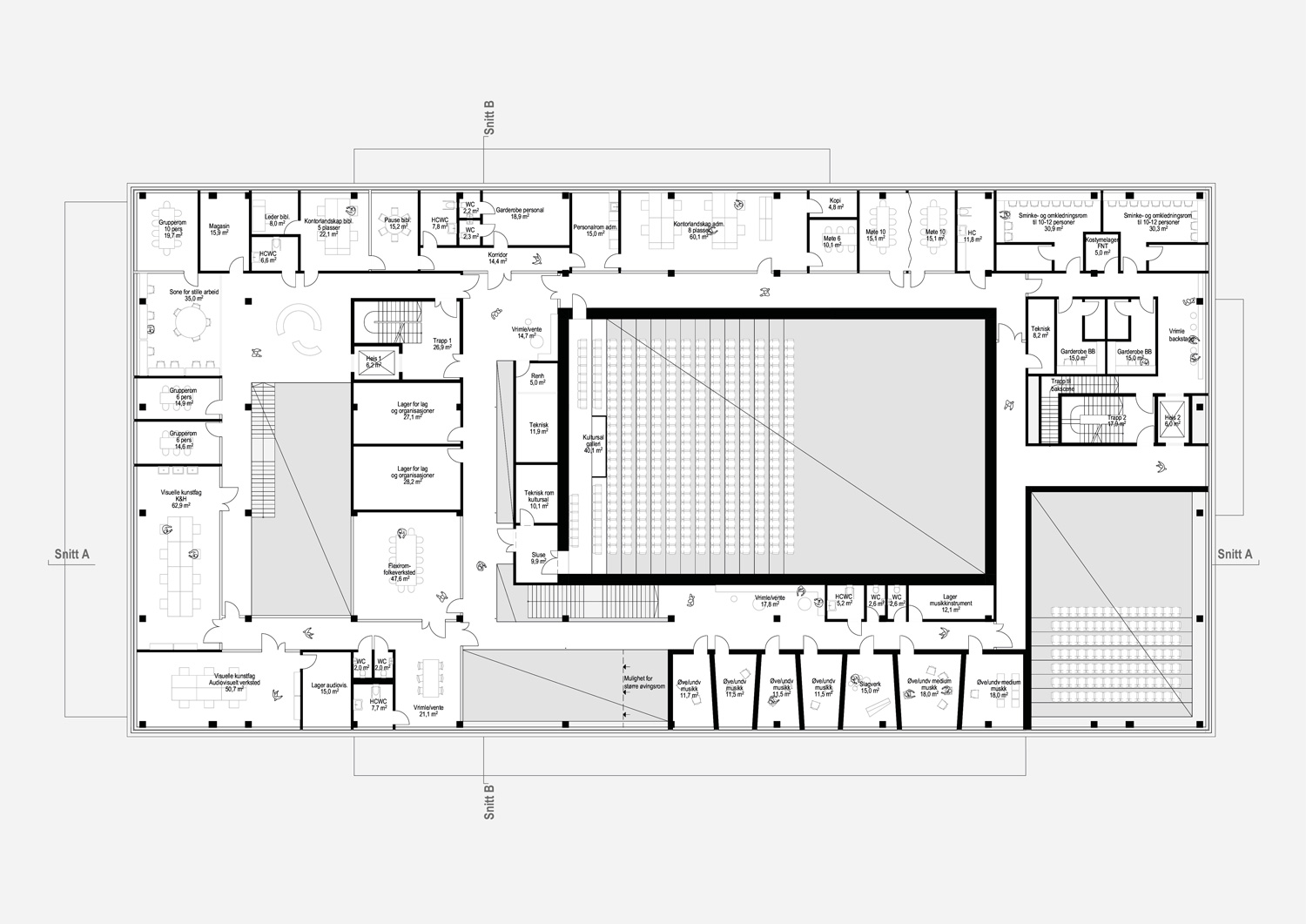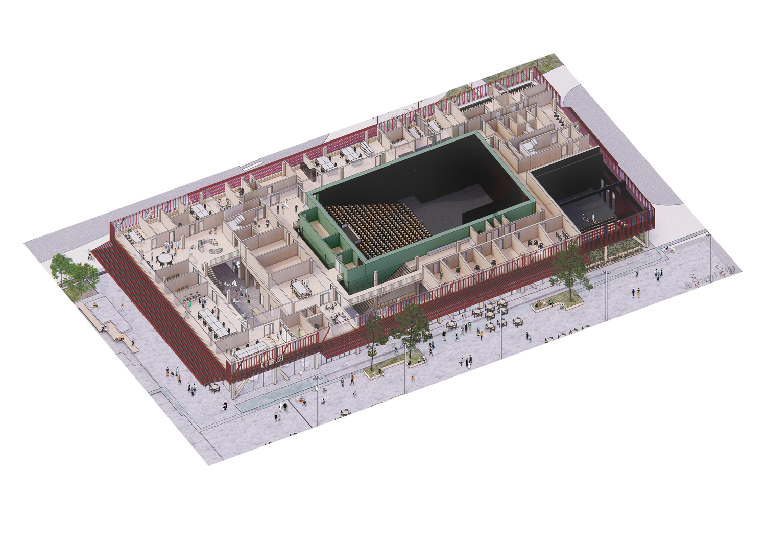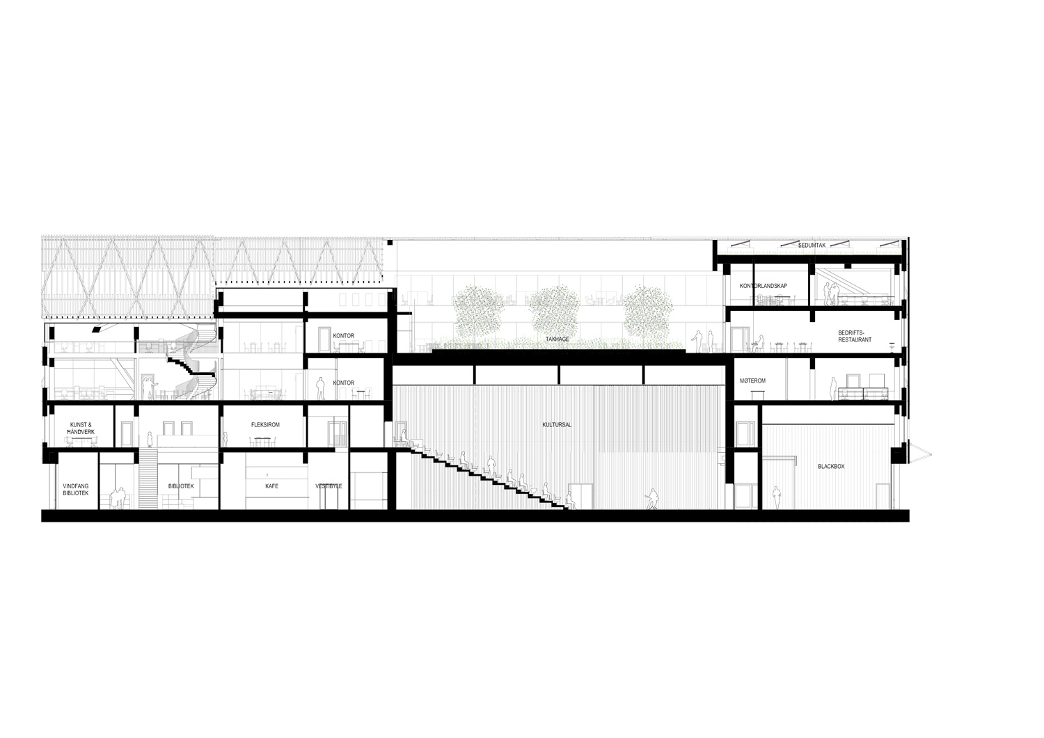 Our proposal mediates the macro and the micro answering to the requirement of a complex program in a series of pitch roof with a ground floor at human scale. The project carries a clear role to change the Oasen district from a pure shopping and business area by adding a democratically open arena that provides many opportunities for people to be active participants in the local community. Publicly accessible spaces around are relatively small and dedicated to production, consumption, and sport. Our new culture house will have to be generous and inclusive to allow in one of the most diverse and socially inequal part of bergen, so that everyone feels at home there.
