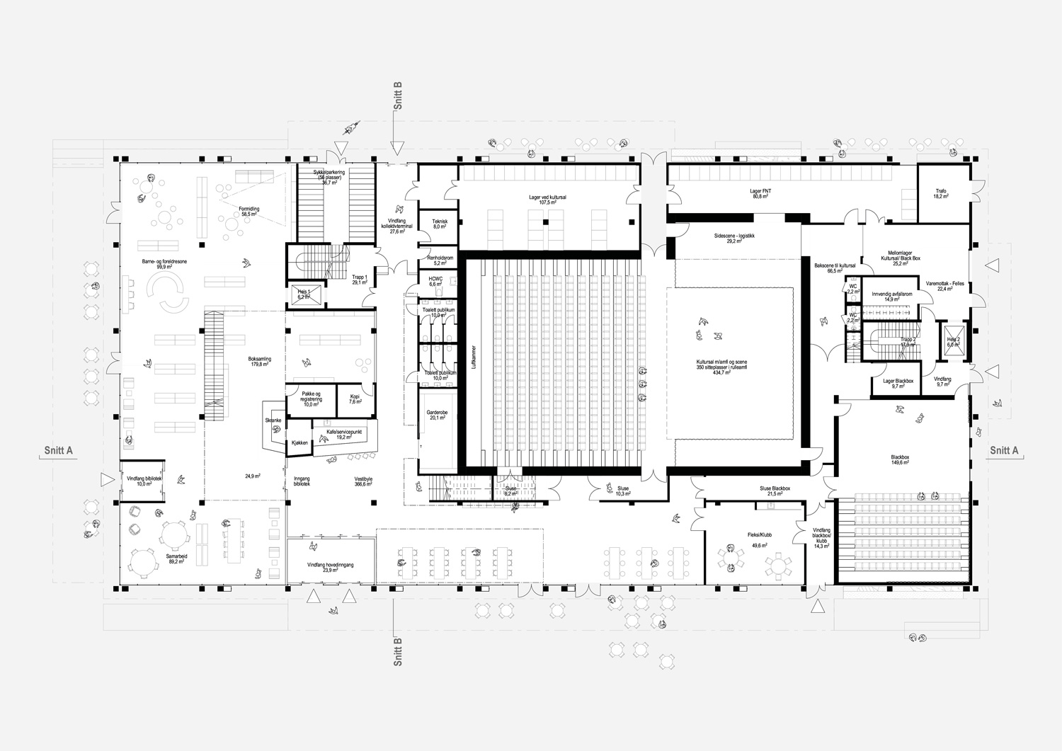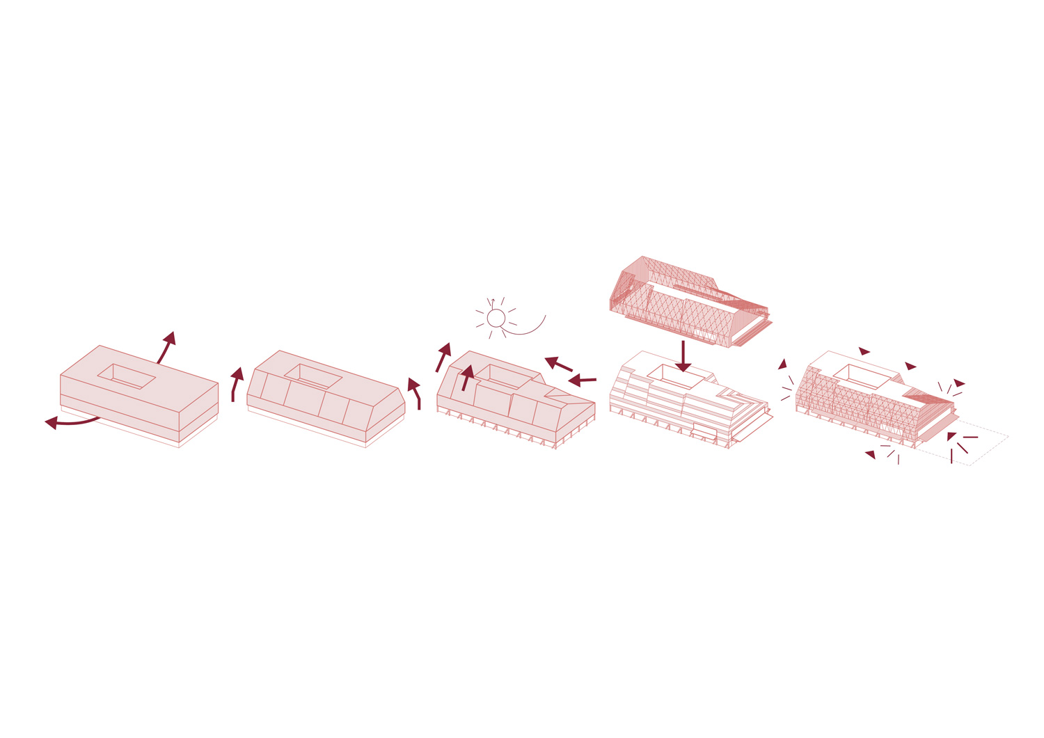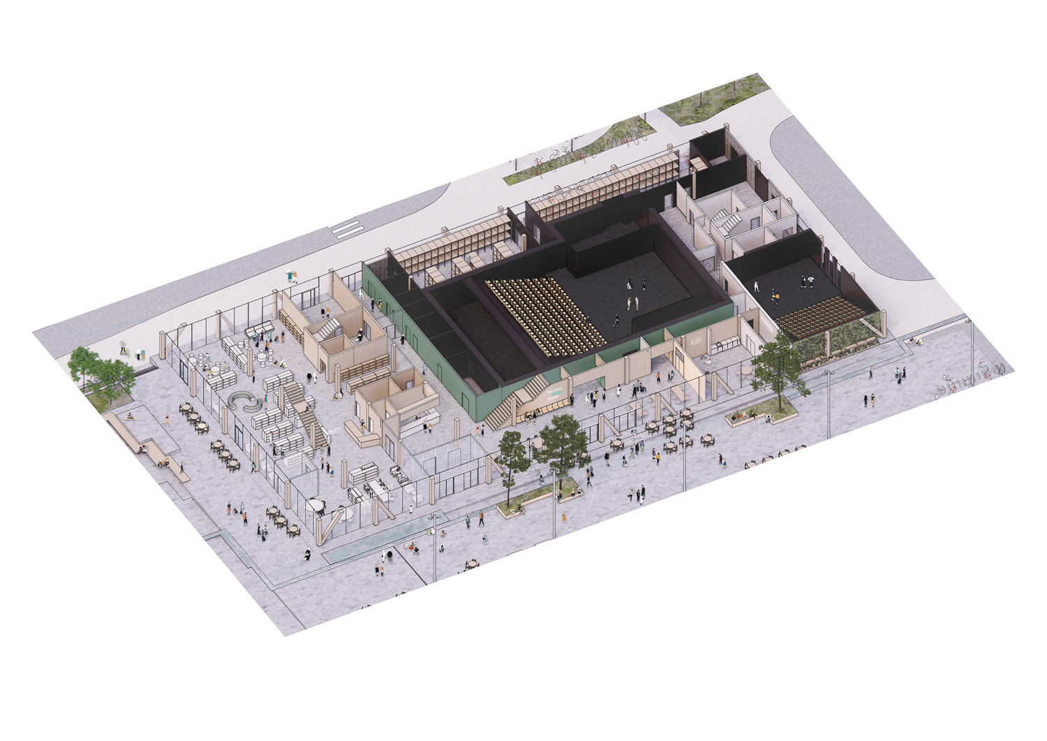 Our proposal mediates the macro and the micro answering to the requirement of a complex program in a series of pitch roof with a ground floor at human scale. The project carries a clear role to change the Oasen district from a pure shopping and business area by adding a democratically open arena that provides many opportunities for people to be active participants in the local community. Publicly accessible spaces around are relatively small and dedicated to production, consumption, and sport. Our new culture house will have to be generous and inclusive to allow in one of the most diverse and socially inequal part of bergen, so that everyone feels at home there.