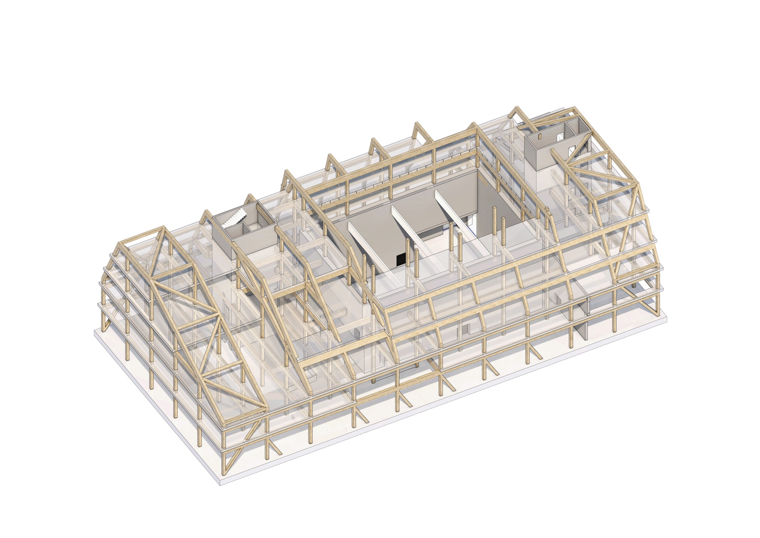 We have looked at local history and been inspired by the visions of how to build in the green valley. We have also taken with us the legacy from the gatehouse. A widespread western Norwegian construction technique, and a very material-efficient method of constructing large and open spaces.