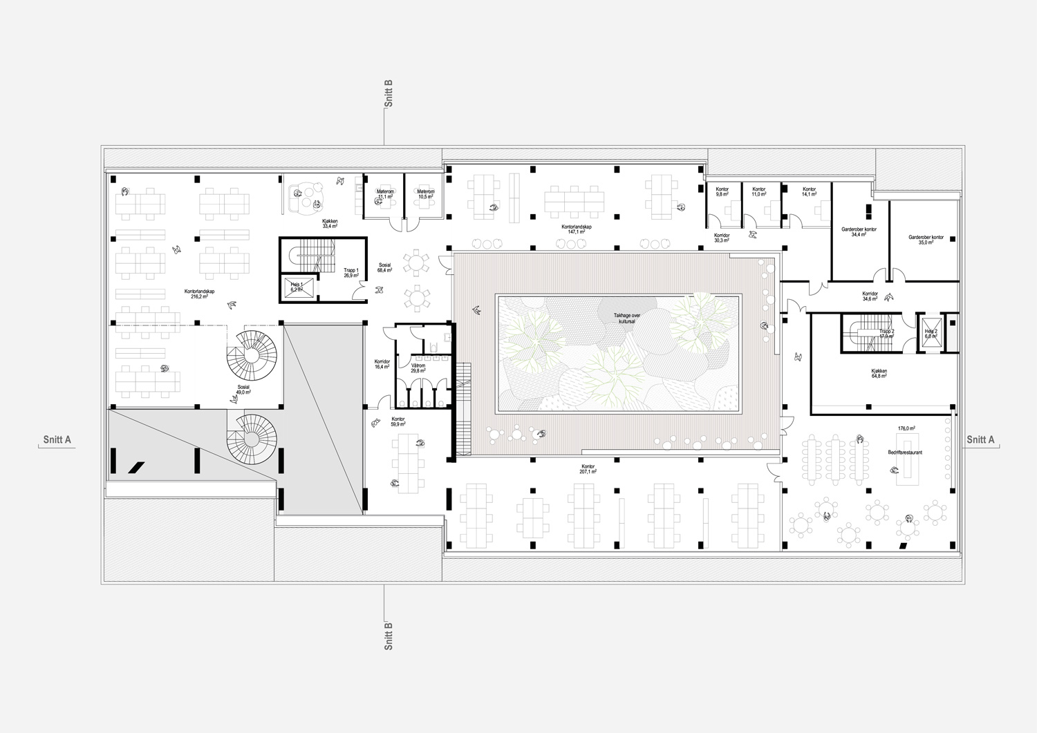 The outer layer has a terracotta player, a natural and sustainable building material, with extremely little maintenance that ensures its aesthetic appeal in the long run. Cladding is reddish ceramic tubes with square sections. The competition basis sets BREEAM-NOR certification level Excellent as an environmental requirement. As always, we were looking to combine exciting architecture with high environmental ambitions, and this time it was integrated surface water management solutions, solar cells and solid wood construction that became our answer.