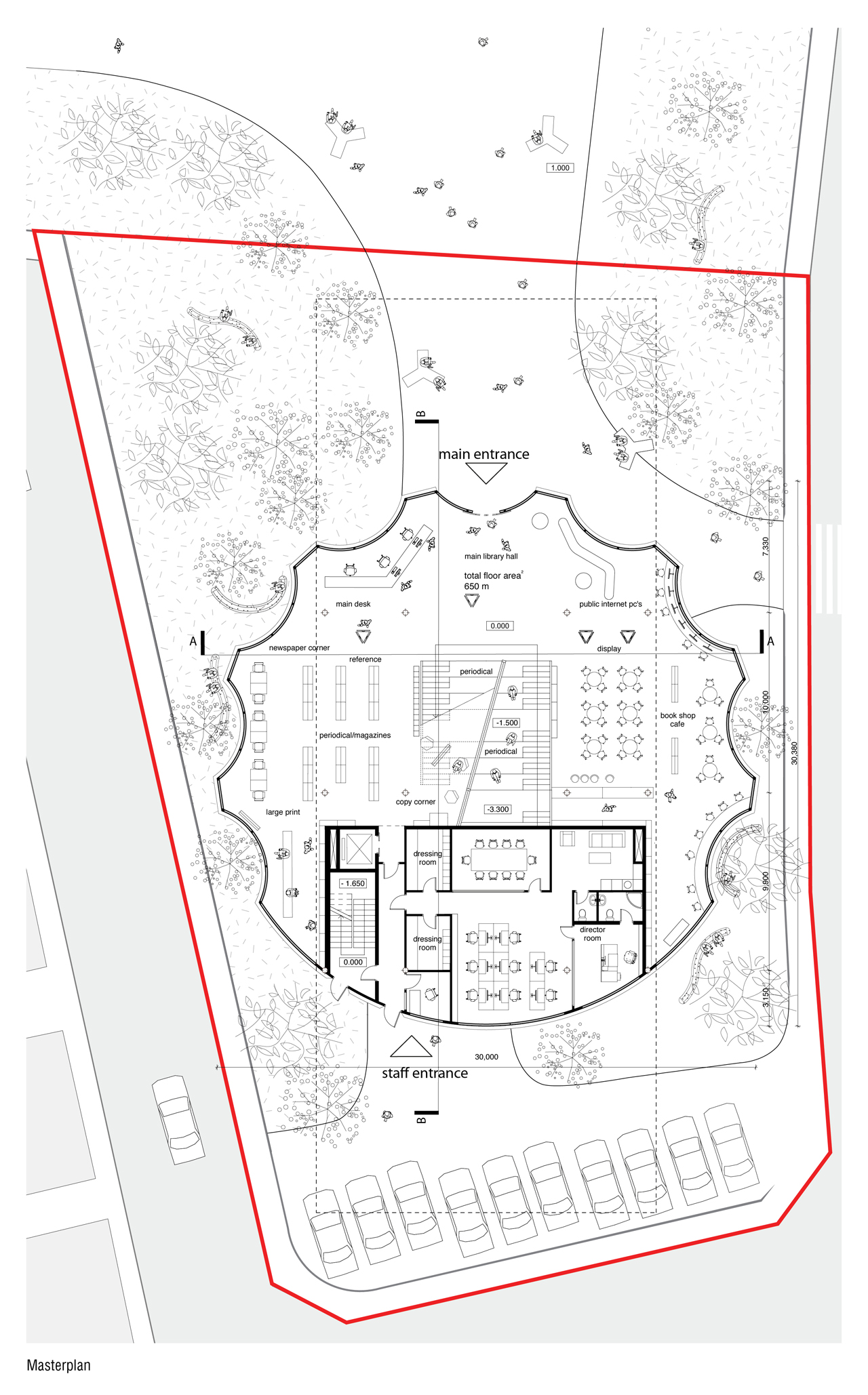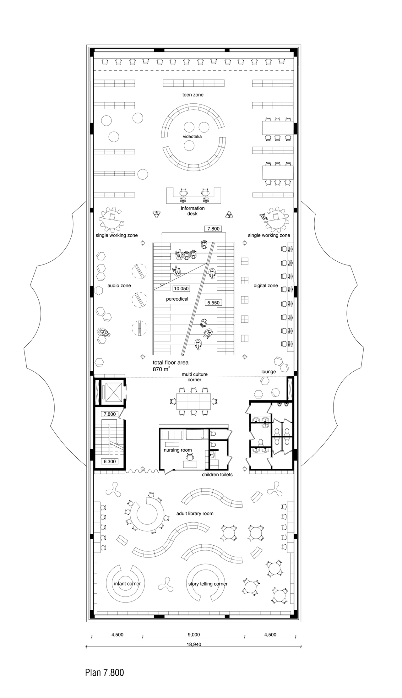 There are two separate volumes, one on top of another. While the lower volume is a public zone available for all residents, the upper rectangular volume presents a concentration of library’s regular functions and userspaces. In the core of the building structure are the atrium stairs. They are not only the transit zone, but also a place for communication: every flight of stairs can be used as a place for lecture, discussion or informal meeting.