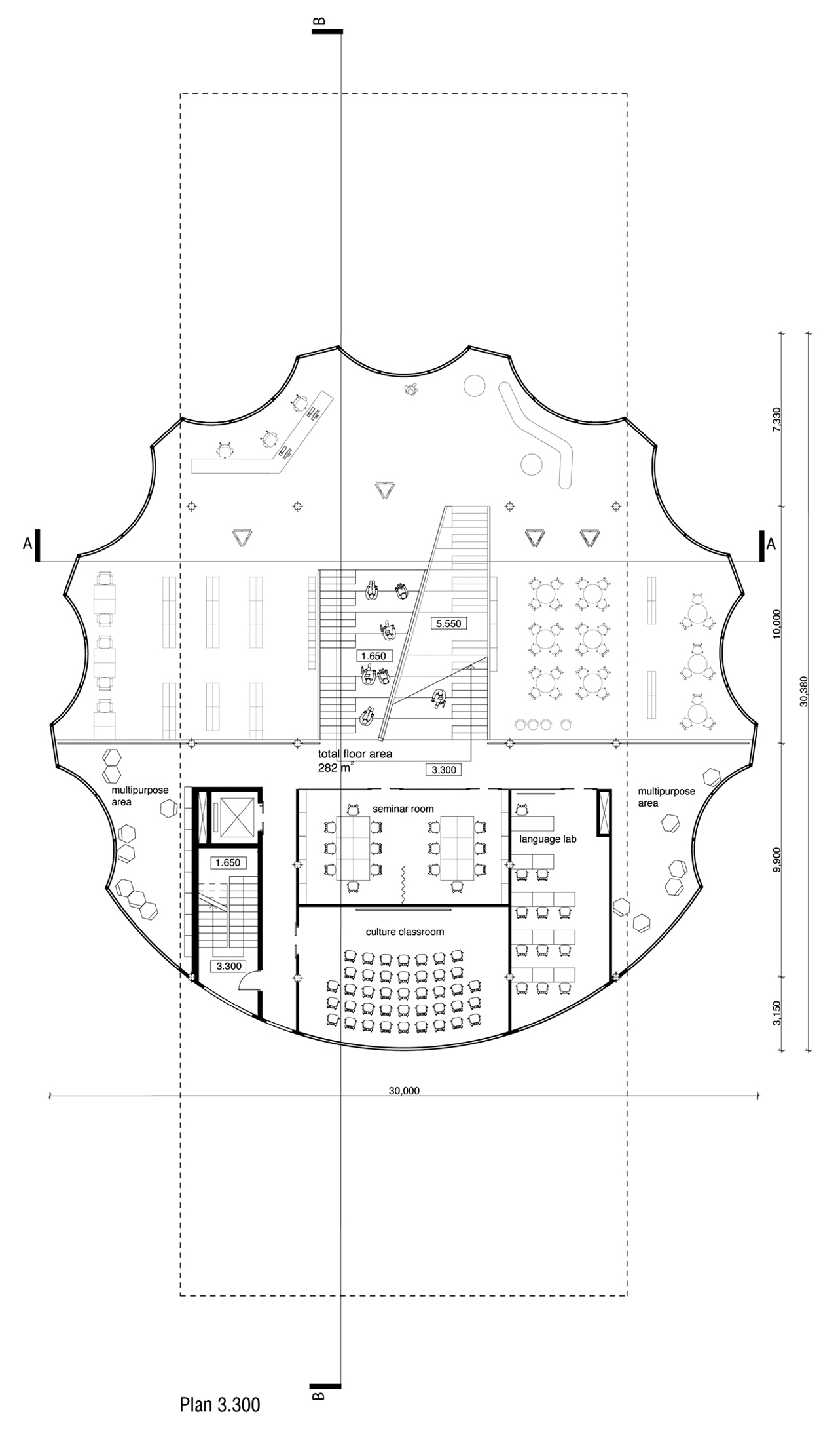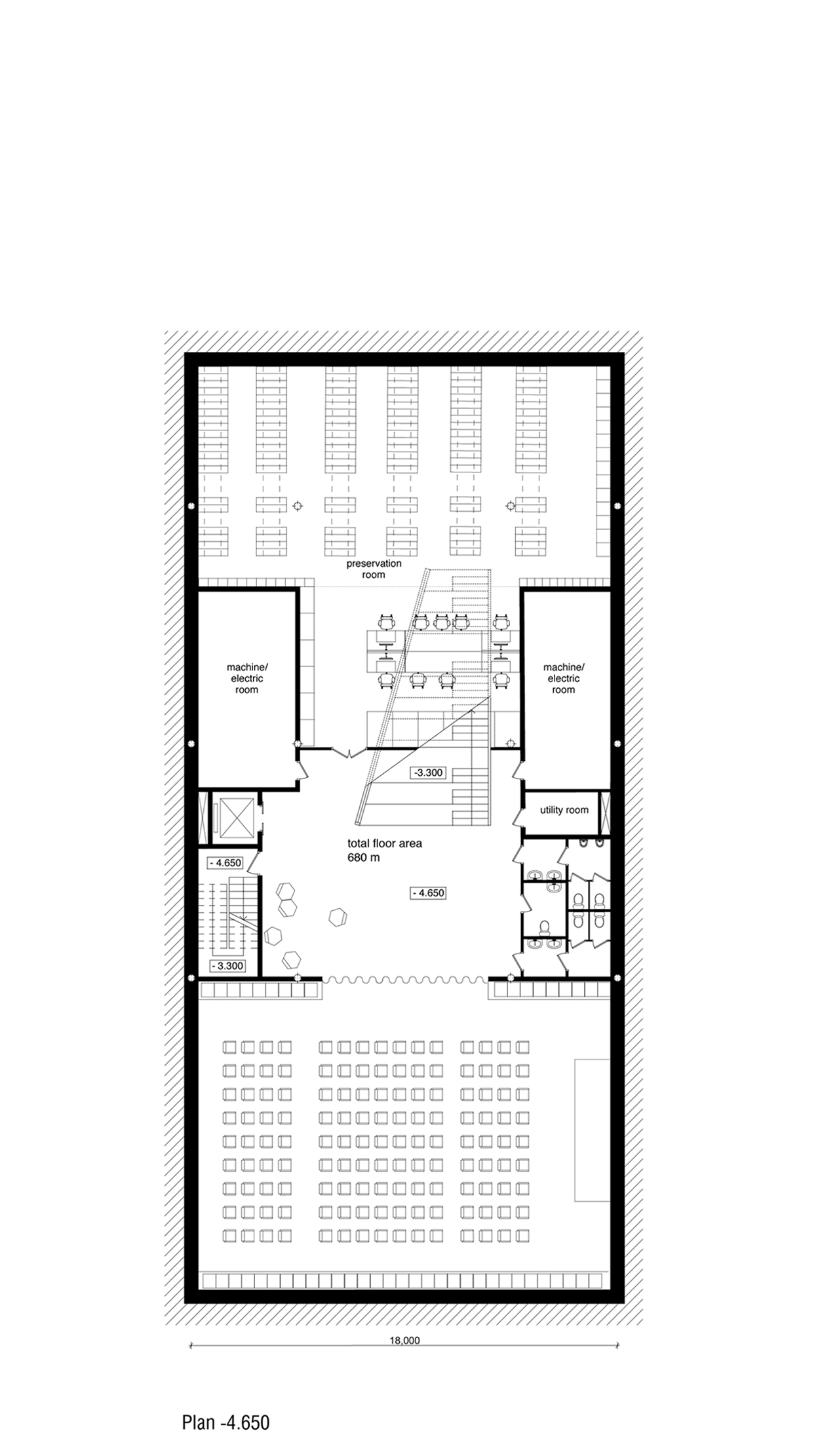 Among the basement floor spaces is a preservation room and the multipurpose room. The latter includes six scenarios of space organization. These are recreation, two-, three- or combined lecture space, performance and exhibition space. The stairs, if necessary, can be transformed into an amphitheater with a hall area expanding the lecture/exhibition room. A sliding wall could be used as a projection screen. Due to space adaptability it is possible to hold several events simultaneously. A lifelong study space, just as the exhibition/lecture room, is at minimal distance from the entrance. It is located in the entresol between the ground floor and the first floor occupying almost a half of cylindrical volume of the library.