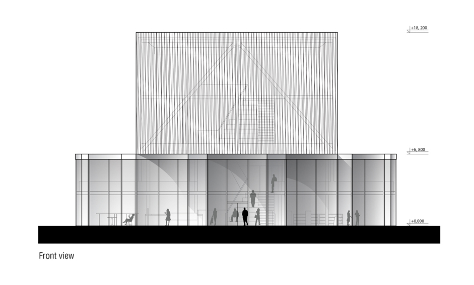 The lower volume is transparent, the upper one is solid, as if hovering over the ground. The reading room on top floor is a place of intelligent relaxation and rise over the everyday. The illusion of levitation is amplified by the moire effect created by the upper volume’s facade. Thus, the library as a whole makes an impression of the lightweight and compact structure. The lower volume is made circular to avoid segmentation of the area. There is no main facade as such – the library looks «welcome» from all sides. The gear-like form of the lower volume lets the building be dissolved in the park around the library. It also gives extra space for greenery and outdoor rest area.