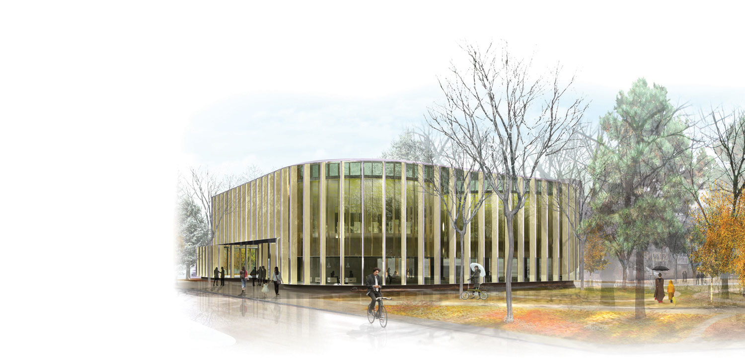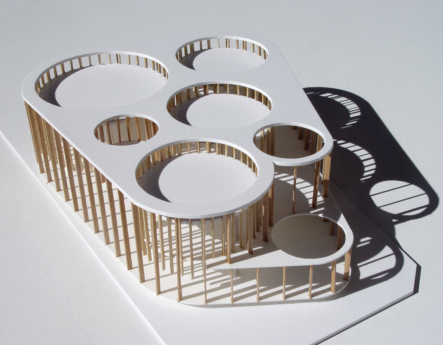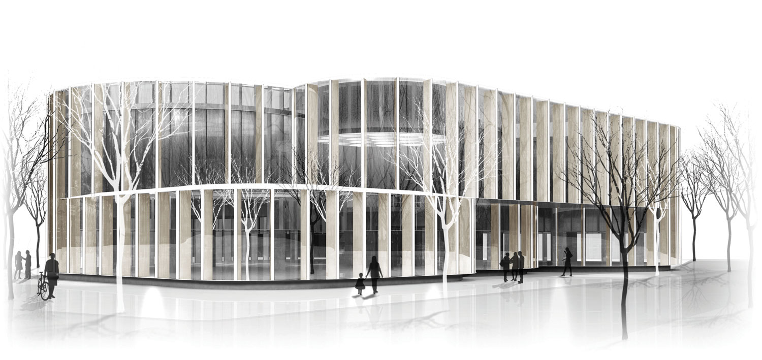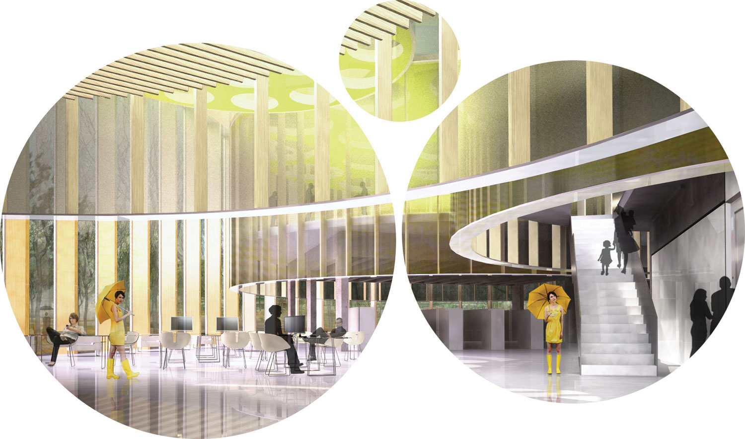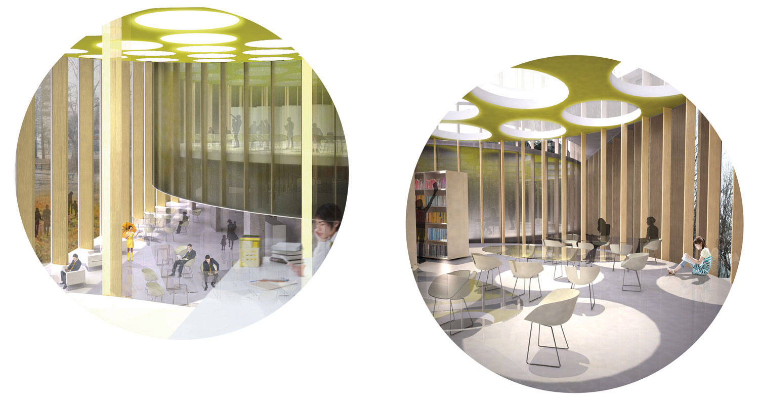 The present proposal works in favor of the qualities of continuity and transparency at the disciplinary level, as well as spatially and materially, and it does so both inside the library and outside, in the relationship with its environment. On the outside, the construction is offered light and transparent, slightly raised above the ground, like a pavilion. The glass envelope, curved and continuous –wrapping literally the interior spaces-, constructed with a regular and harmonic plot of right stud frames of laminated wood, integrates with the public park that runs in front. To the inside, the surrounding façade provides consistency and unity to the arrengement of different functional areas, sorted by a circular geometry, tangent cluster around the geometric and functional center of the library (housing the vertical core, toilets and countertops for public attention). The planimetric geometry and the secctional strategy seek balance between continuity and fragmentation through the manipulation of the geometry of tangent circles. On the first floor, the circles are configured as volumes, providing silent and quiet study areas and reading rooms however without loosing the visual conection to the whole. On the Ground floor, the circular geometry soars over the space without breaking the spatial continuity, thus favouring the areas of consultation, newspaper library and informal, youth and children’s reading areas.