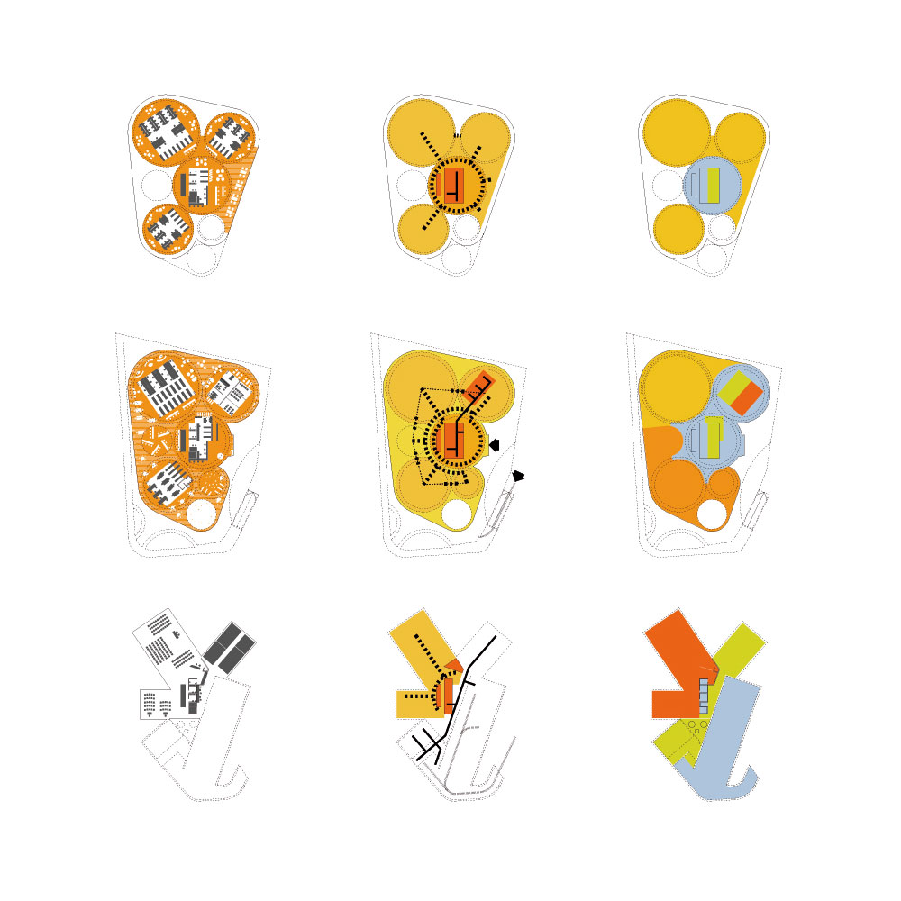The reinforced concrete retaining walls of the Basement floor will serve the function of foundations, adapting its square geometry to the specific uses placed on that floor. The structure above ground will combine reinforce concrete piers and slabs with laminated wood studs on the perimeter of the building. The cover slab would benefit from a lighter quality, so we propose a steel plate structure, well adapted to the circular geometry and most probably prefabricated in a workshop. The roof surface finish will be zinc panels on boards, assembled on a ventilated fashion for climate control and the increase of insulation. Double glazed glass with silk screen will be used on the façade surface for climate control, supported by a courting wall structure made of structural silicon, aluminum anchoring profiles and laminated wood vertical studs. Rubber flooring for acoustical and maintenance reasons.