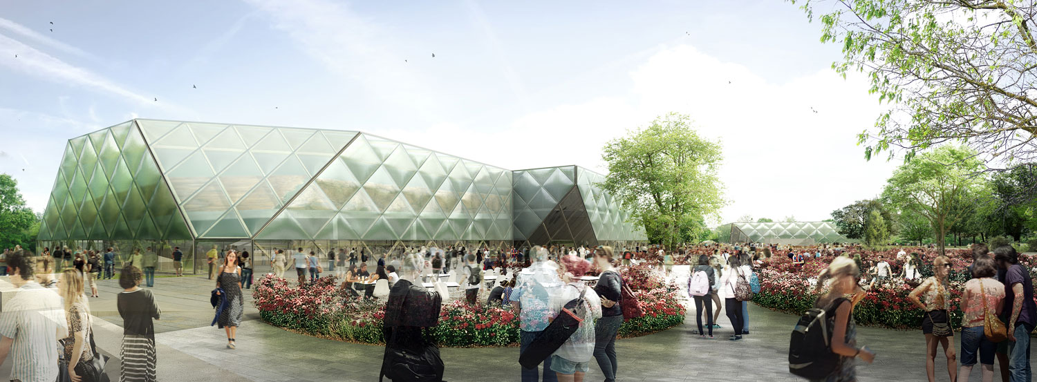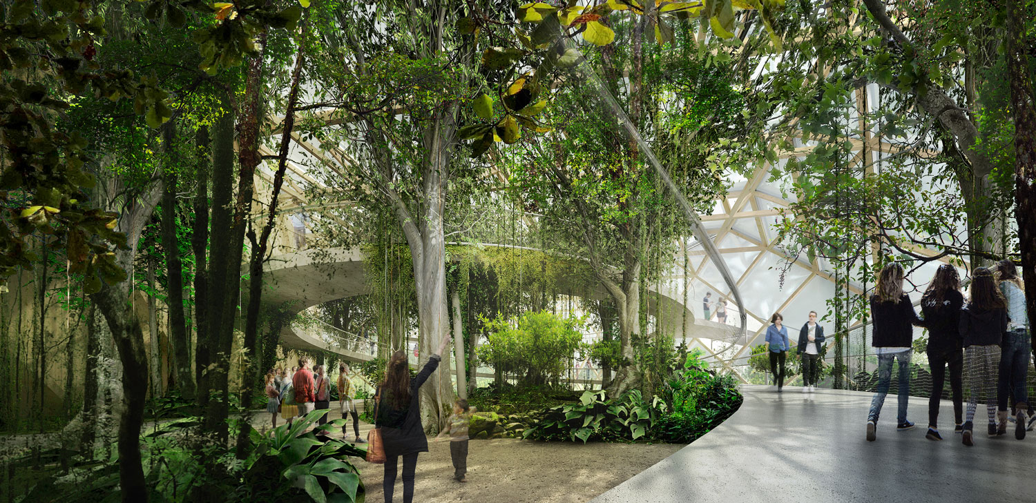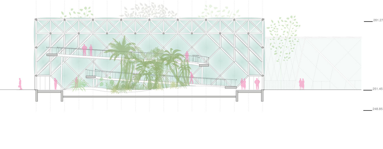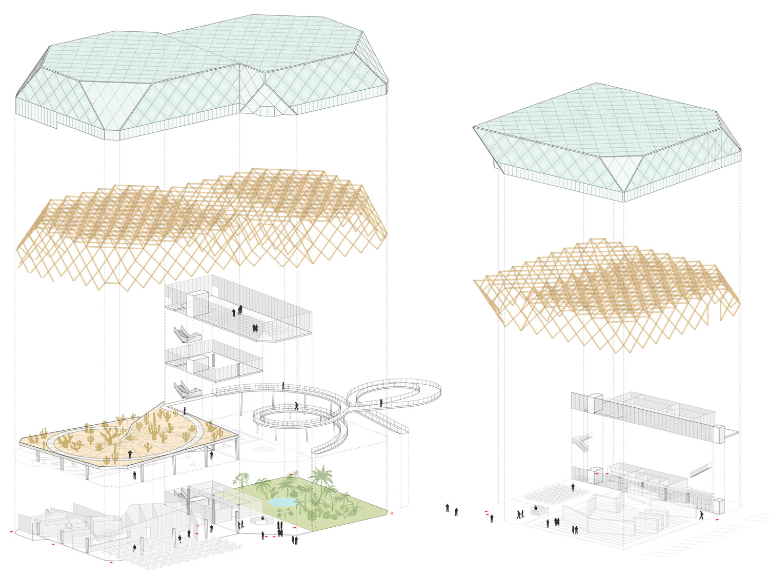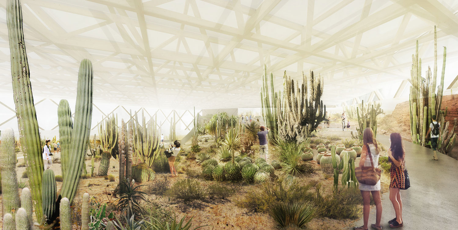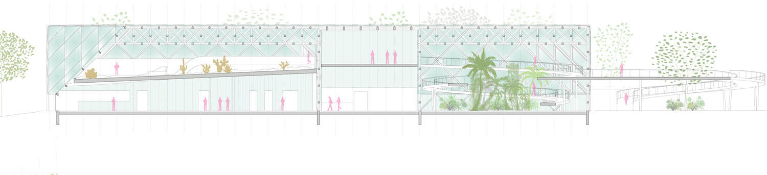 The two settings—desert and tropical—are opposing extremes of an enormous geological and biological cycle or loop, present on Planet Earth and represented in these greenhouses. In this great cycle, over millions of years deserts can become jungles, and jungles can give way to deserts. Yet, strange as it may seem, science has proved that these distant ecosystems have a constant and simultaneous interdependence. Those who visit these spaces will come to understand that complex interrelationship as they follow an itinerary, which is also a loop between contrasting conditions. Desert and Tropics can be explored separately, but they can also be experienced one after the other, as adjoining spaces, clearly illustrating the many ways in which they are connected. One ends where the other begins. Depending on visitor numbers, it will also be possible to control the flow of foot traffic so that on peak days the itinerary can only be done in one direction, while on days with fewer visitors people will be free to move in either direction. As this tour has two levels, visitors will also have to ascend and descend: a steady slope in the desert, and a gentle floating ramp among the trees in the jungle.