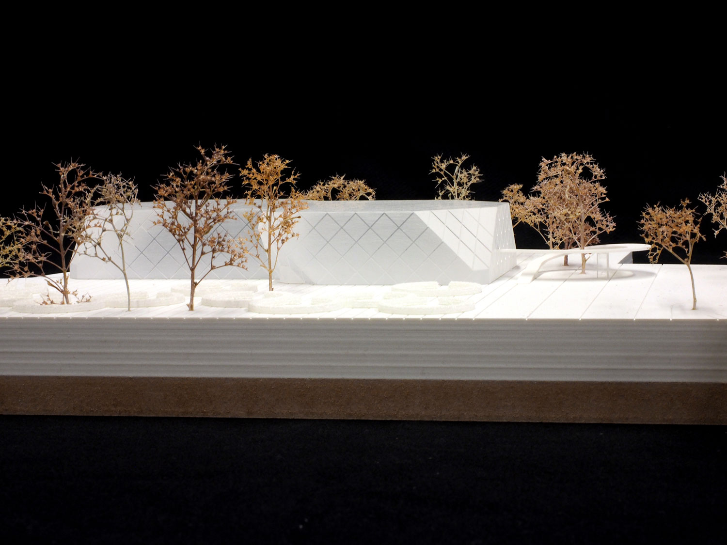 The tropical rainforest consists of clusters of palms and other trees that will eventually tower to the greenhouse ceiling, but it also incorporates simple devices that will allow plants to grow or find purchase at different heights. Plants will hang under the ramp, climb mesh-covered cylinders standing in for real trees, and colonise one side of the space as a vertical garden. Pools of water reflect that verticality and enhance the impression of the ramp as a delicate ribbon in the middle of the space. The building’s structure is both manifest and concealed behind the vegetation, on the walls and roof. In the desert, a uniform translucent suspended ceiling will diffuse the light to create the illusion of a bright sky, hiding all roofing and structural elements and eliminating shadows. The outer edges of the greenhouse are concealed behind huge panels with reflective membranes that infinitely replicate the landscape, recreating its vastness and simulating a distant horizon. The entire floor ascends in a spiral near the centre of the space.