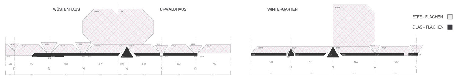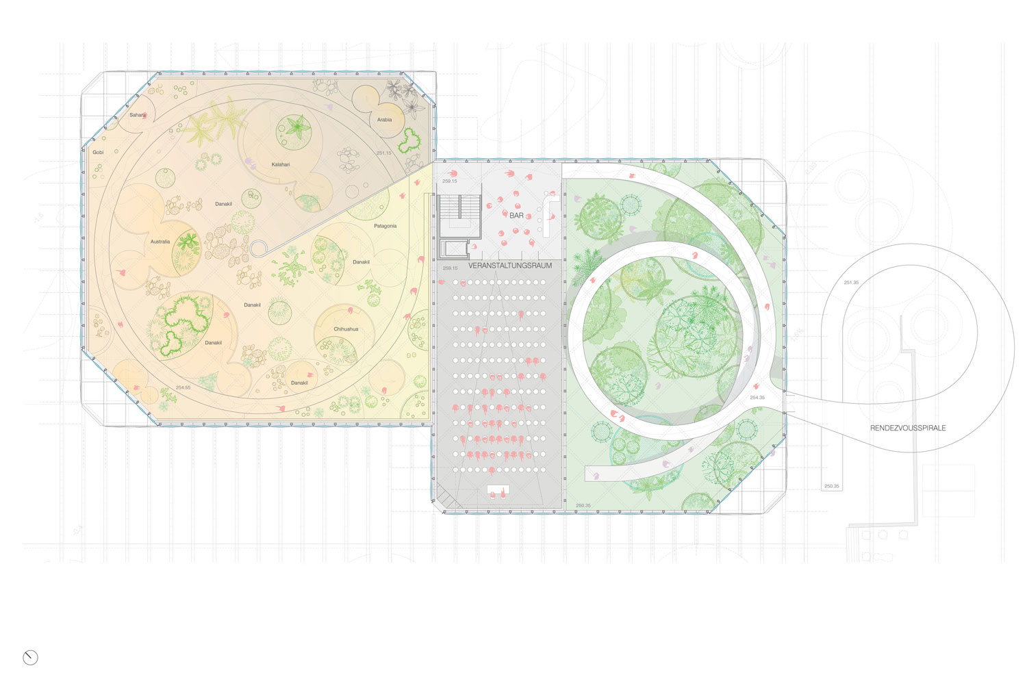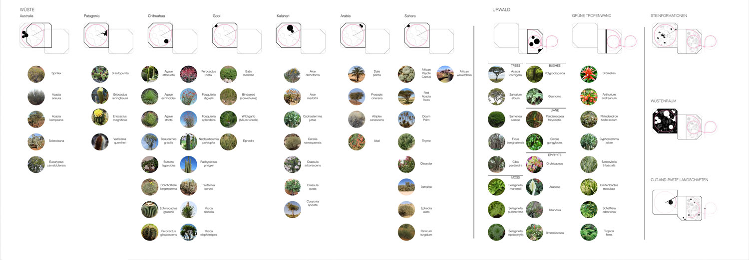 In both environments, the Tropenhaus and the Wüstenhaus, various landscapes are synthesised in circular areas and elements of varying sizes that seem to have been «cut and pasted». This formal and functional method has been used to design a peculiar landscape, «snipping» fragments from different desert and tropical settings all over the world. Each fragment is a circular area of varying dimensions that seems to have been lifted out of its original context and dropped into the greenhouse. Reality is only imitated in the details, accurately replicated in the fragments; on a larger scale, it is merely suggested and organised in an obviously artificial, abstract way, avoiding any resemblance to clichéd theme park simulations. There is no scenography in the sense of a set designed to mimic reality; instead, the scenery is a blend of real landscape and architecture that offers a more contemporary interpretation. Like works of art, landscape and nature are perceived and translated or reassembled in a different way that nevertheless conveys their most essential features.
