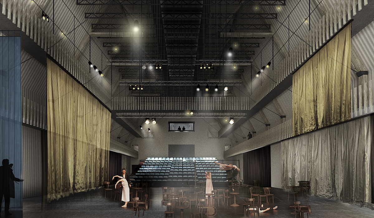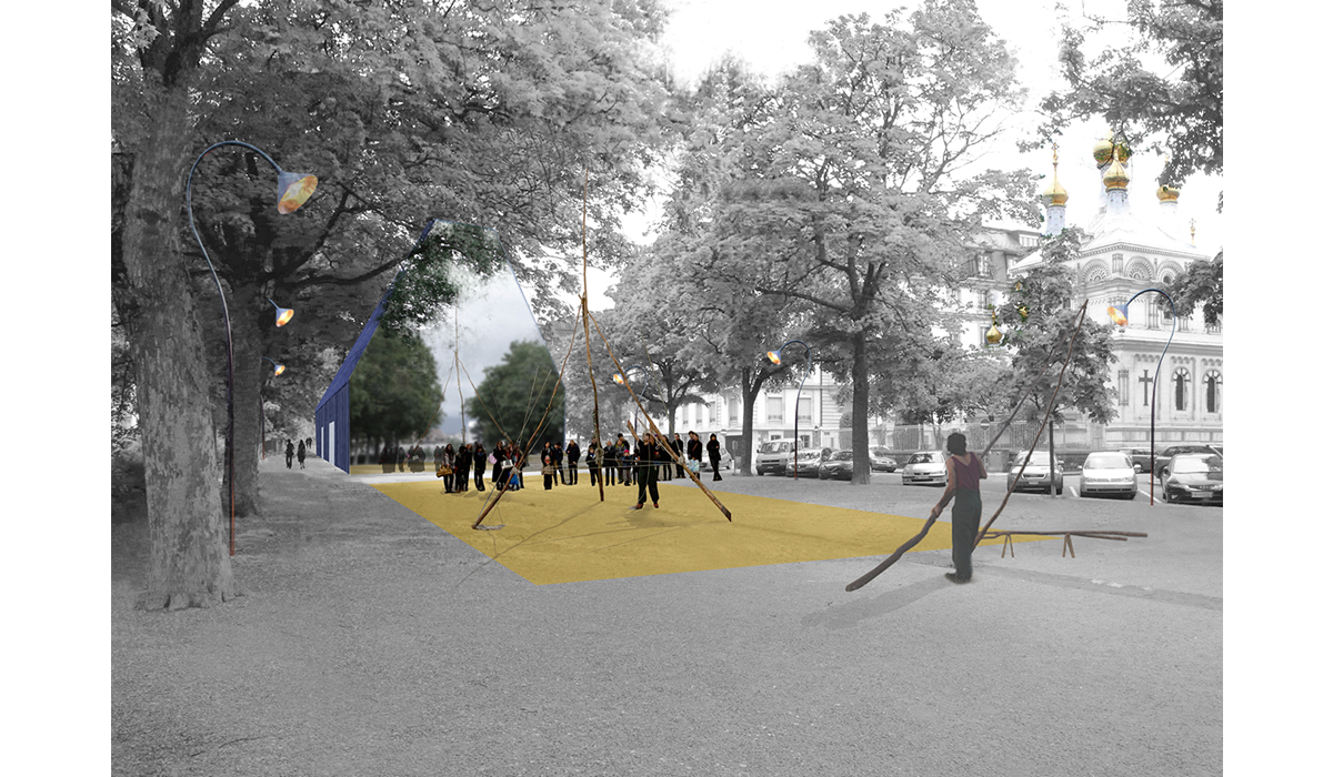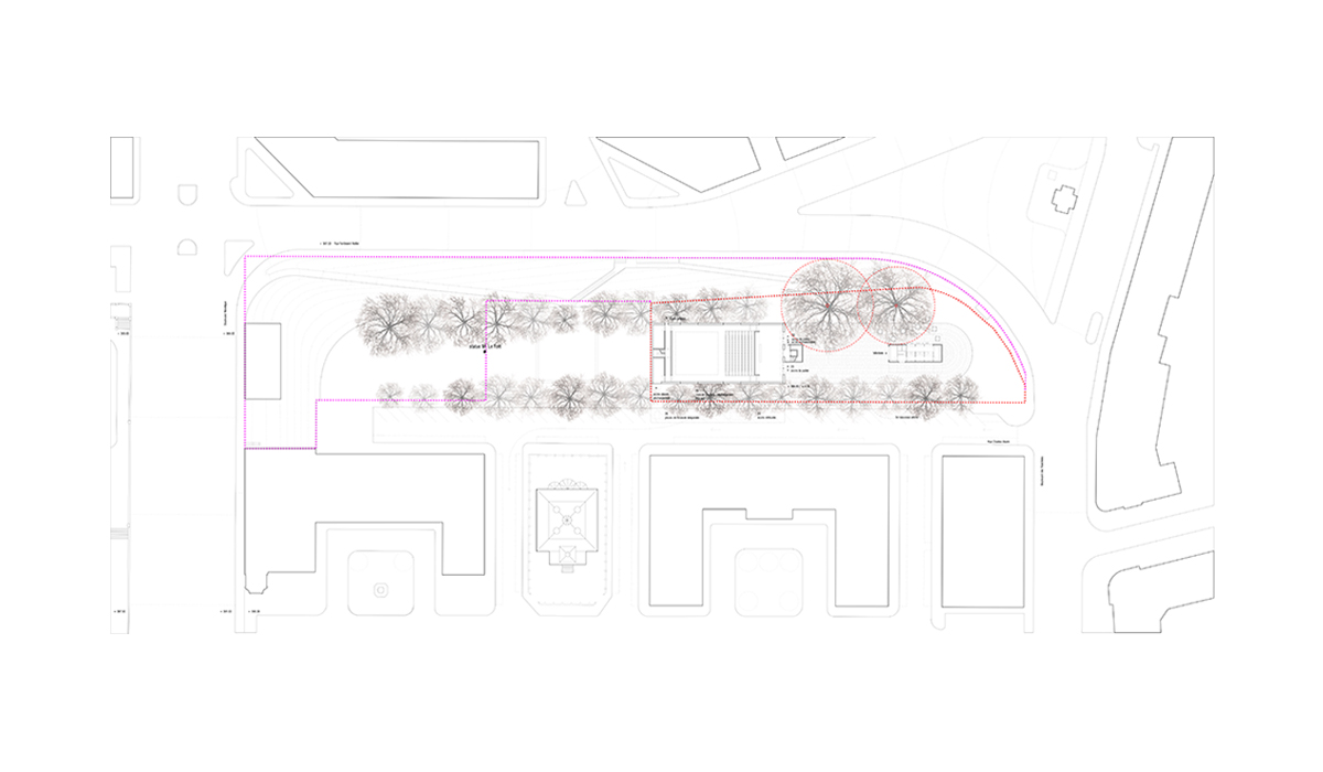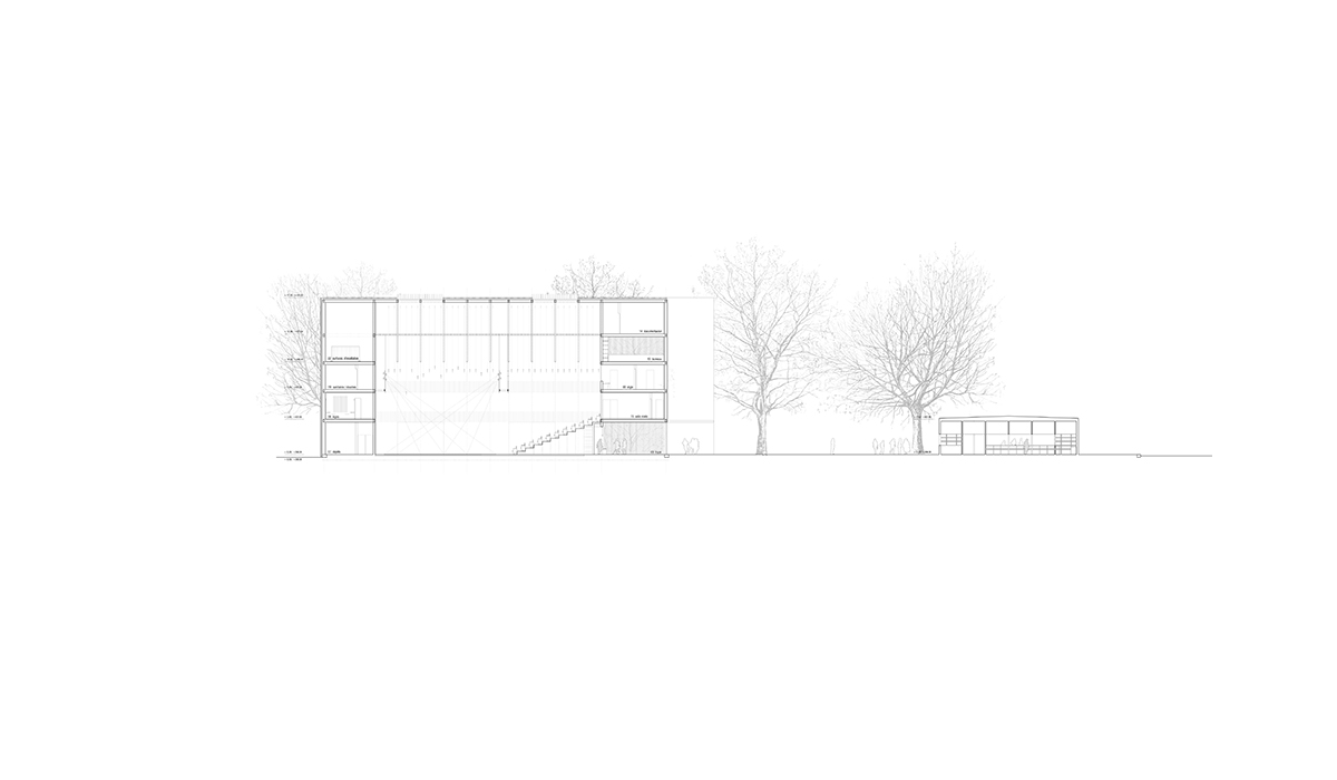 The dance pavilion lies on the axis of Place Charles-Sturm, previously occupied by the southern fortifications of the city and now characterized by two rows of trees that emphasize the strong linear character of the site. The position of the pavilion is dictated by the desire to settle in one compact volume the functional program in order to preserve all the trees belonging to the urban space. A new axis is created in relation to the Russian church though creating two new urban areas. At northwest the theatre “disappears” leaving protagonism to the church; the «mirror” facade of the theater becomes an opportunity to create an «art installation» symbol of a theatrical world that reflects the avenue and creating an optical illusion. At southeast the urban element of the kiosk activates the square onto which the Foyer overlooks. The two plane trees are the protagonists of this space. The form of the building adapts to the shape of the trees, modelling the section in the form of a cut pyramid which accommodates both public and artists in a large single performing space.