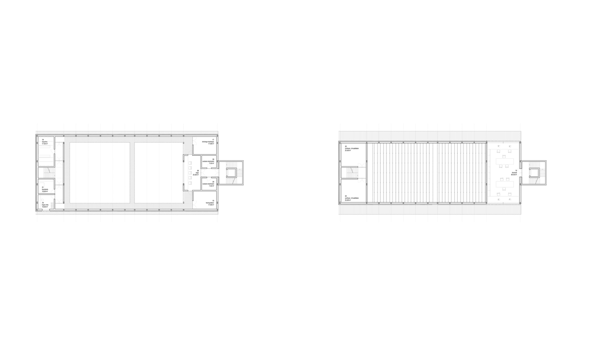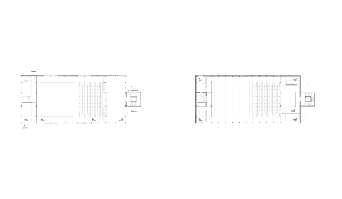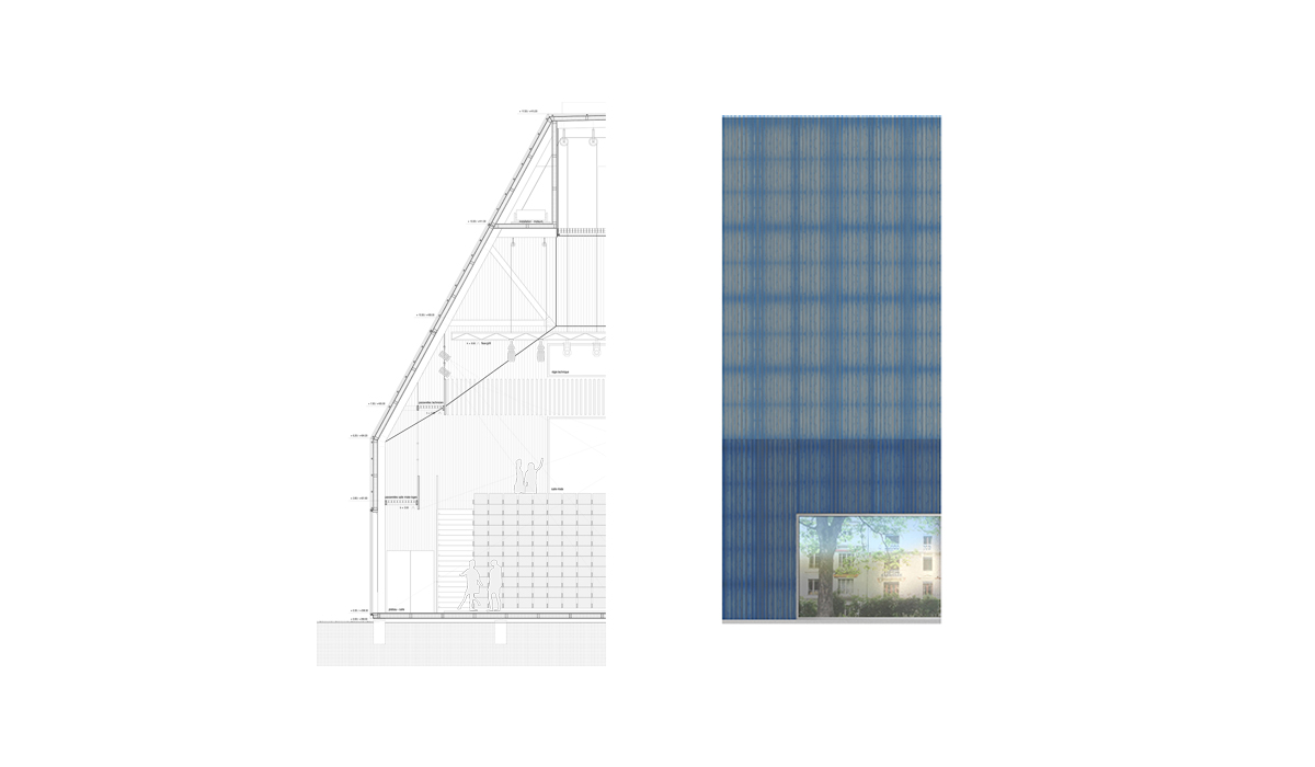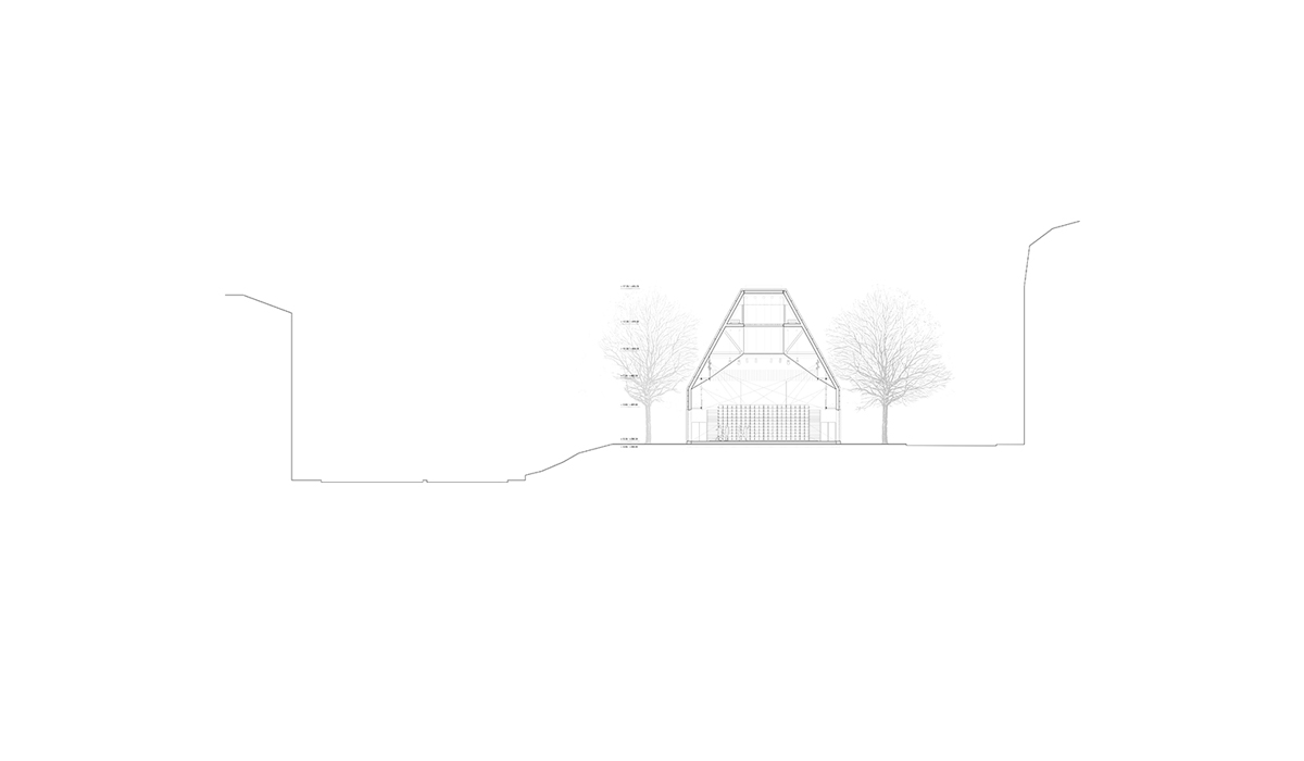 The dance pavilion lies on the axis of Place Charles-Sturm, previously occupied by the southern fortifications of the city and now characterized by two rows of trees that emphasize the strong linear character of the site. The position of the pavilion is dictated by the desire to settle in one compact volume the functional program in order to preserve all the trees belonging to the urban space. A new axis is created in relation to the Russian church though creating two new urban areas. At northwest the theatre “disappears” leaving protagonism to the church; the «mirror” facade of the theater becomes an opportunity to create an «art installation» symbol of a theatrical world that reflects the avenue and creating an optical illusion. At southeast the urban element of the kiosk activates the square onto which the Foyer overlooks. The two plane trees are the protagonists of this space. The form of the building adapts to the shape of the trees, modelling the section in the form of a cut pyramid which accommodates both public and artists in a large single performing space.