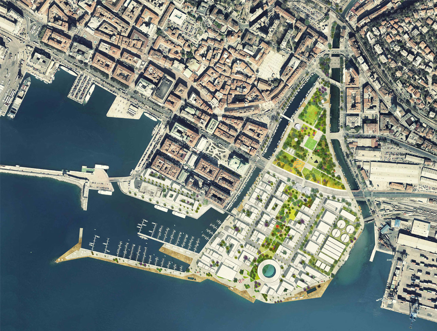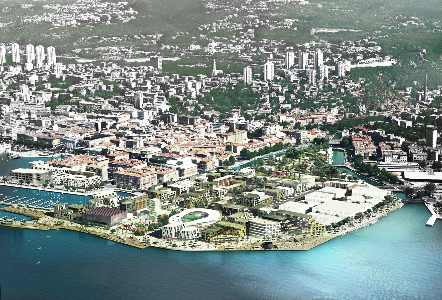 ☉ DELTA + a dynamic city is a proposal by NBJ architectes and NAS Architecture for City of Rijeka designed in 2013. It is located in Rijeka Croatia in a seaside setting. Its scale is extralarge with a surface of 176.000 sqm. Concepts such as new development and renaturalization are explored.