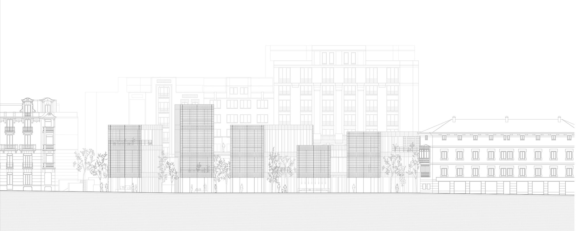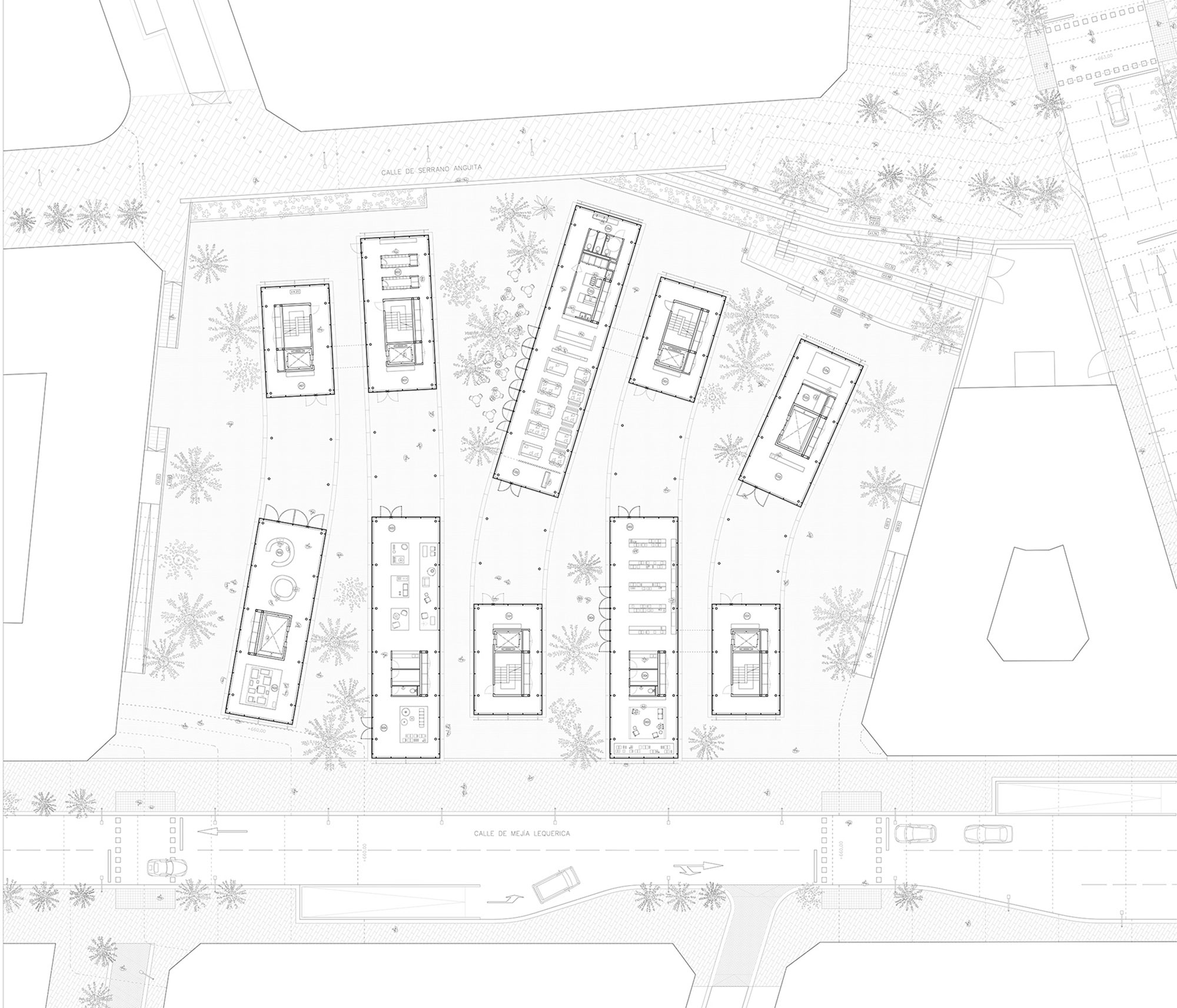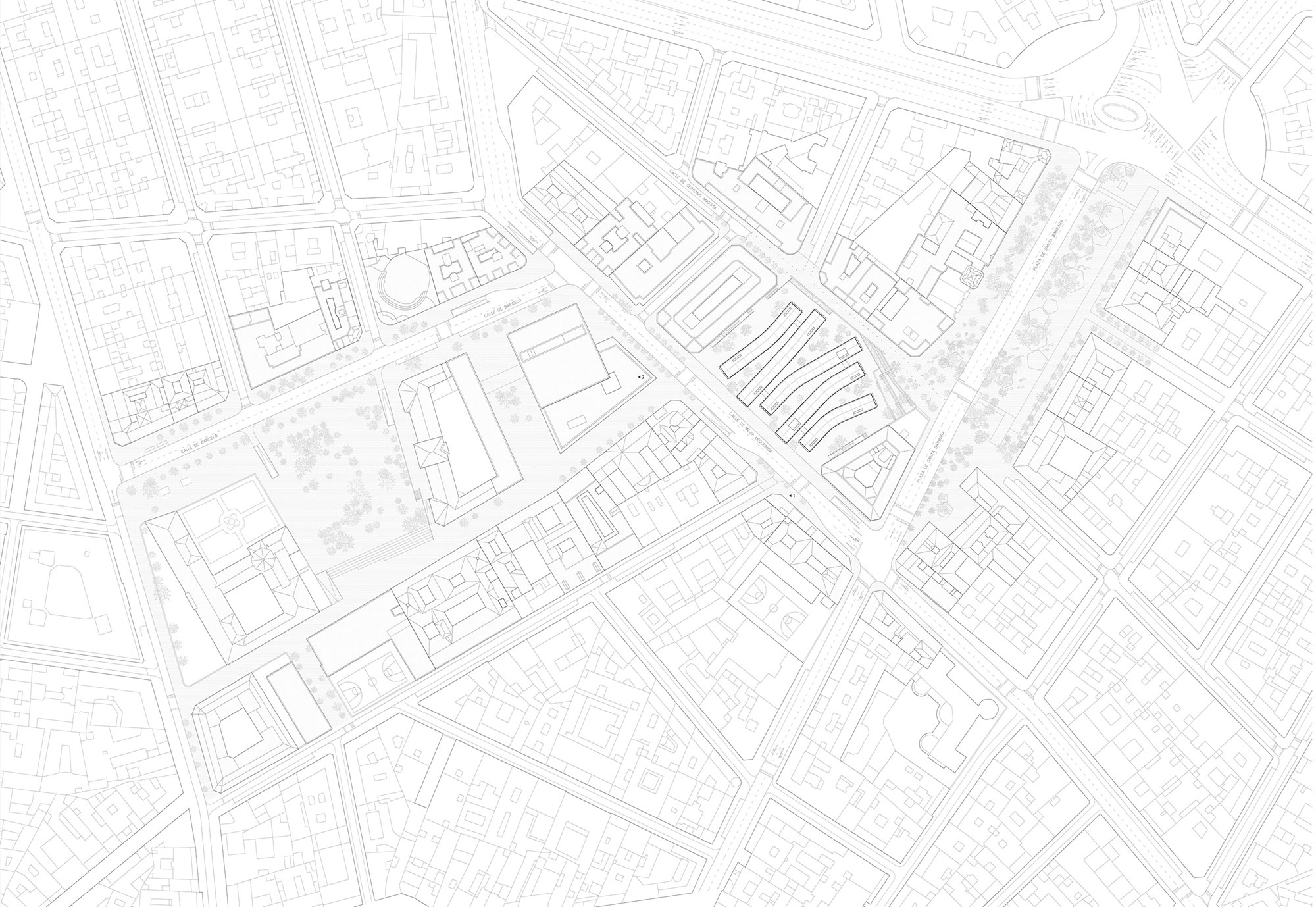 This building is located between two main public spaces in Madrid’s historic center. The purpose of the design is to link both Santa Bárbara square and the new Barceló Market area, creating a continuous urban space. Not in a direct way but creating a feeling of continuity through transparency and reflection. The Design Hub splits into five different glass buildings with curved contours, adapting itself to the surroundings, embracing the nearby buildings and opening itself to the squares.