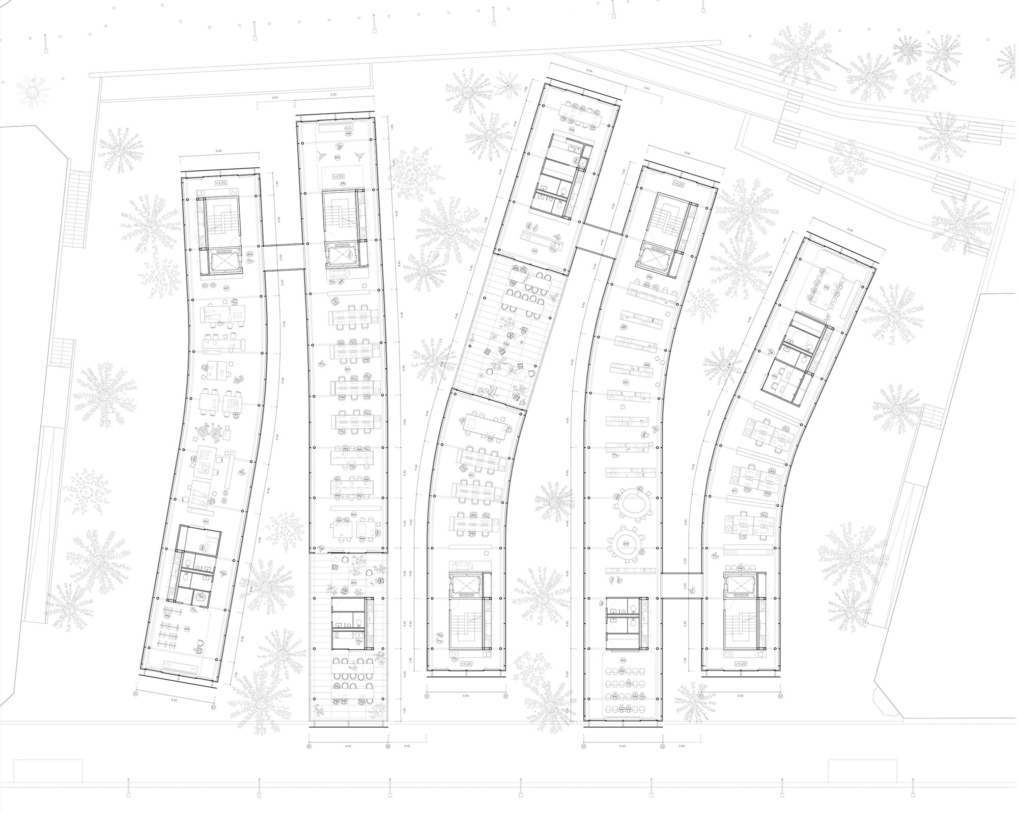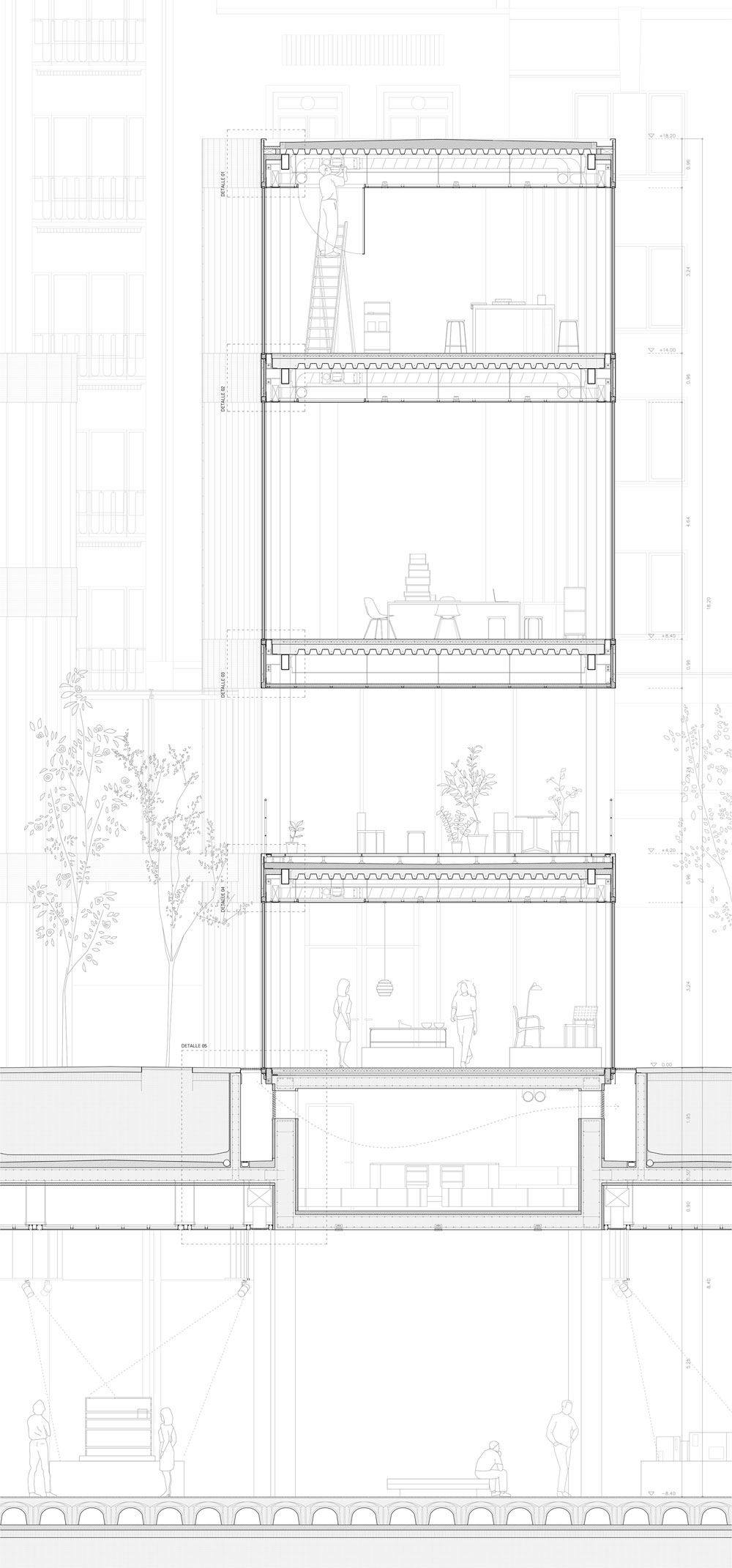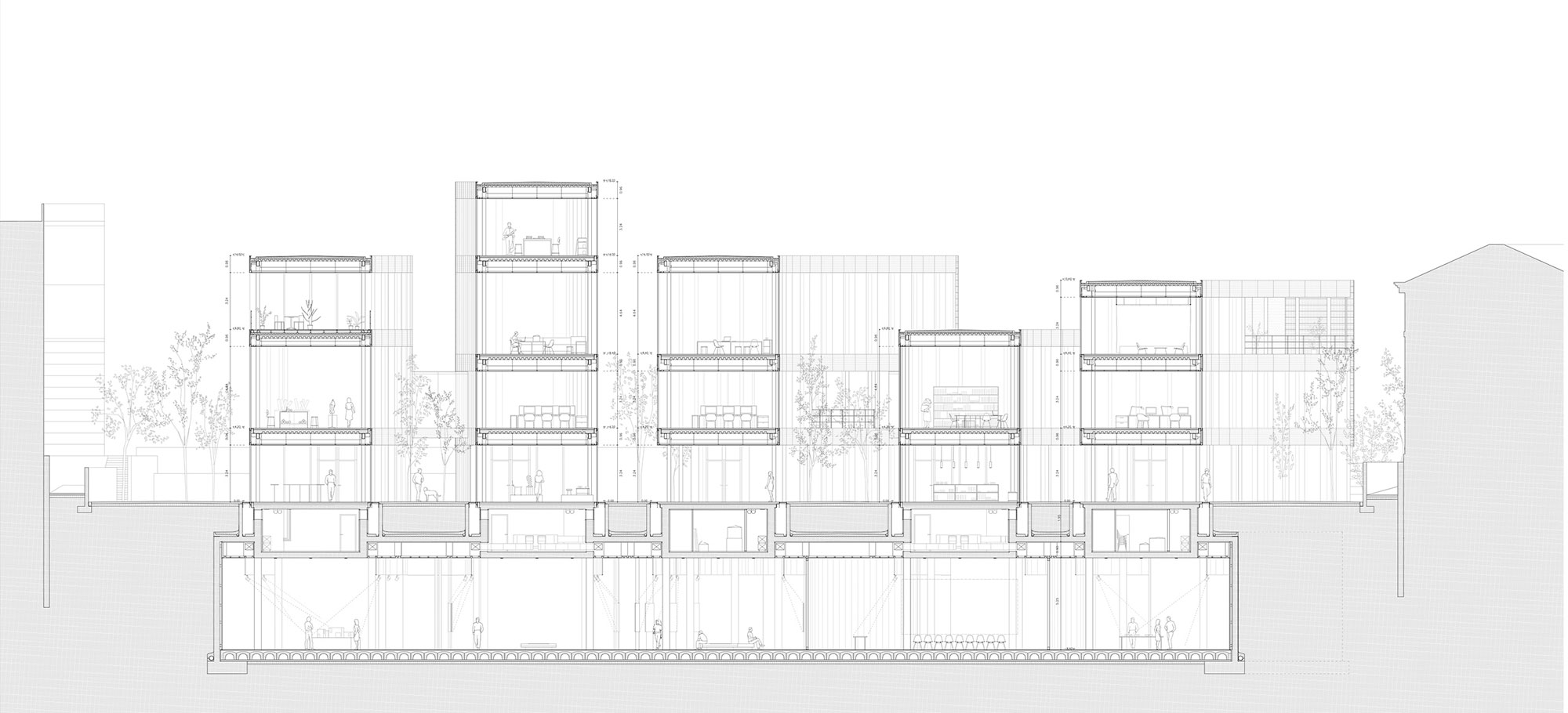 All buildings have gaps in the ground floor, allowing people to cross them and gain access to the buildings, the book shop, the store, the restaurant, and the public underground space. The upper levels are the areas for Fashion, Object and Space design studios, library and offices. There is a narrow separation between the façades here, light being filtered by the high tech glass materials. On the contrary, the underground space is open and suitable for exhibitions and conferences. It can be easily divided using moving walls.