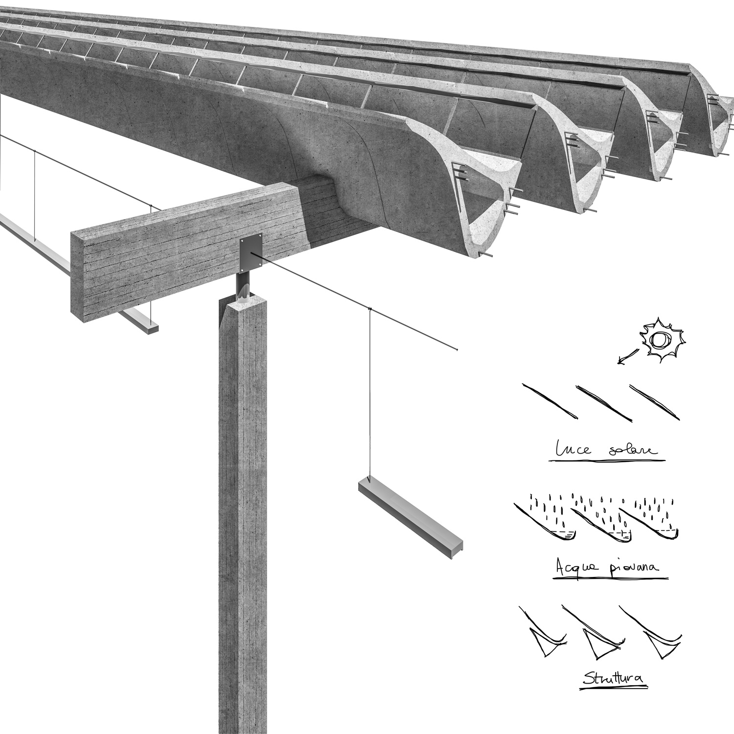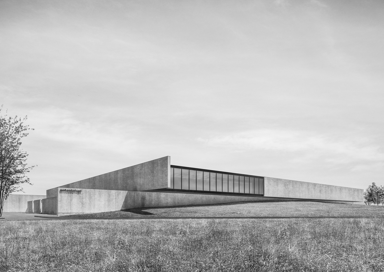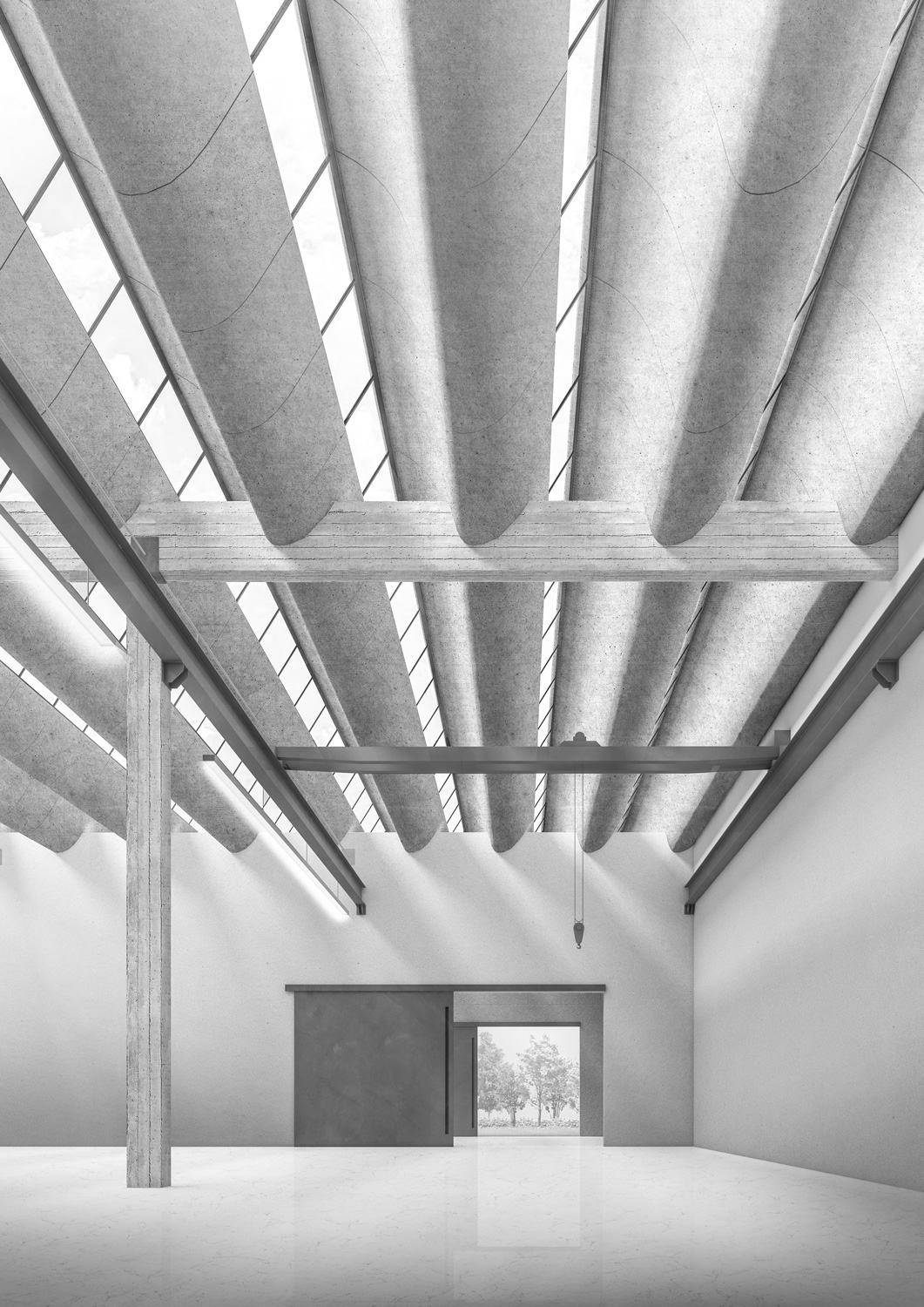 The walls establish a visual impact, influencing the visitor point of view, and create views that frame determined portion of the countryside,creating an interaction between two different environments, nature and industry, both physical and visual. To emphasize the importance of these elements and maintain their monolithic appearance, a zenithal lighting was obtained by separating the horizontal and vertical surfaces to allow the penetration of beams of light grazing the surface of the walls. The material choice is also strongly linked to the desire to emphasize the wall as a unitary and inseparable element, by using concrete blocks.