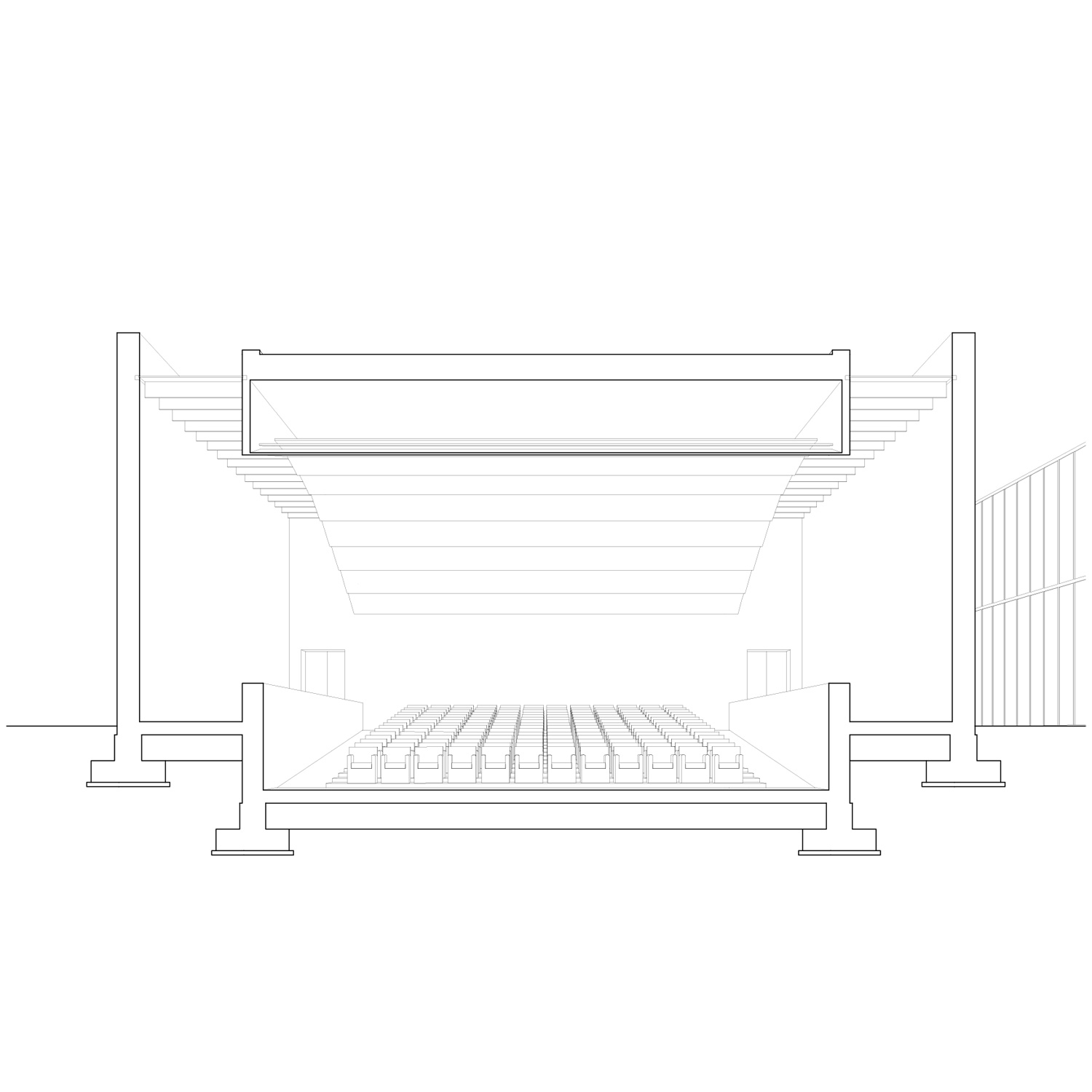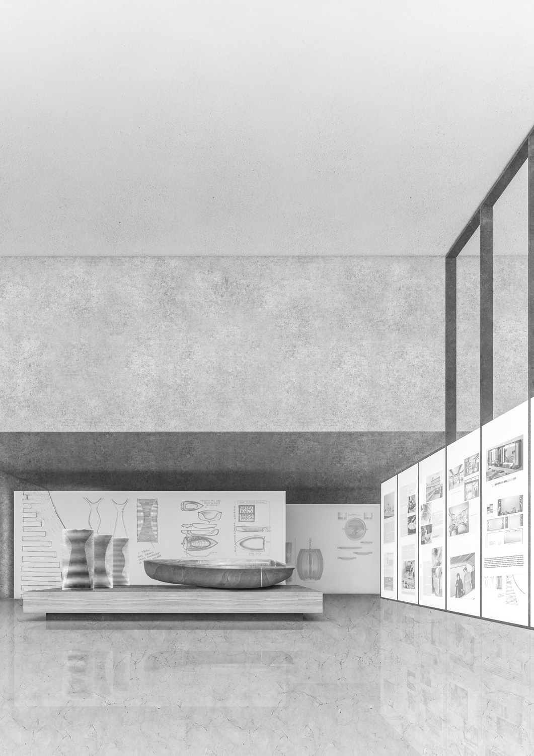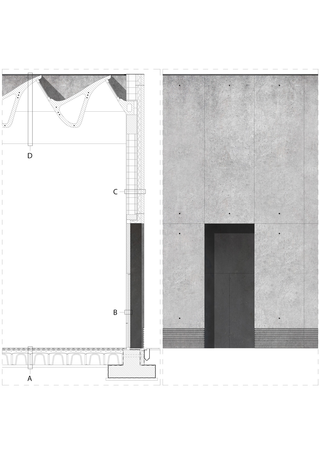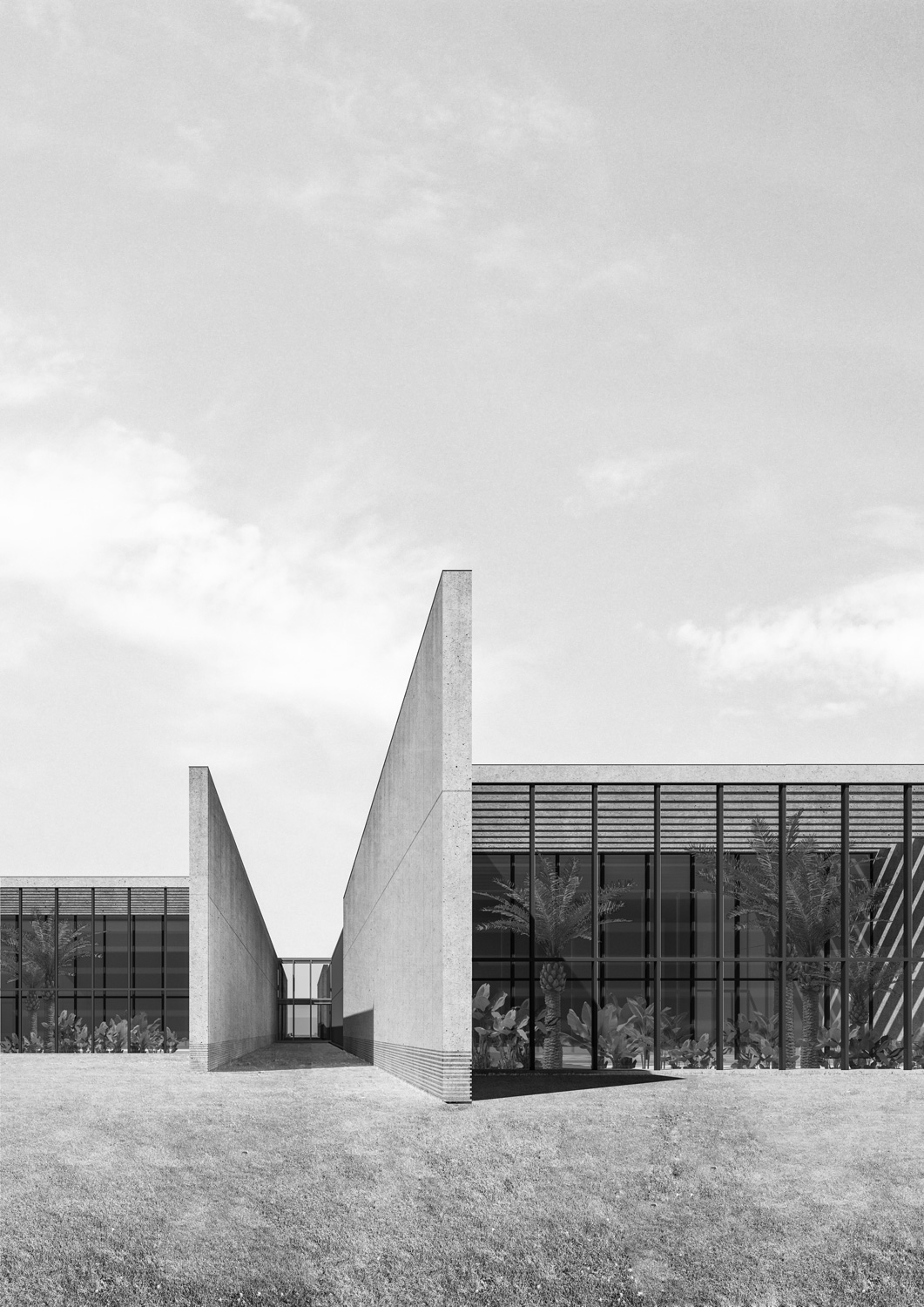 The walls establish a visual impact, influencing the visitor point of view, and create views that frame determined portion of the countryside,creating an interaction between two different environments, nature and industry, both physical and visual. To emphasize the importance of these elements and maintain their monolithic appearance, a zenithal lighting was obtained by separating the horizontal and vertical surfaces to allow the penetration of beams of light grazing the surface of the walls. The material choice is also strongly linked to the desire to emphasize the wall as a unitary and inseparable element, by using concrete blocks.