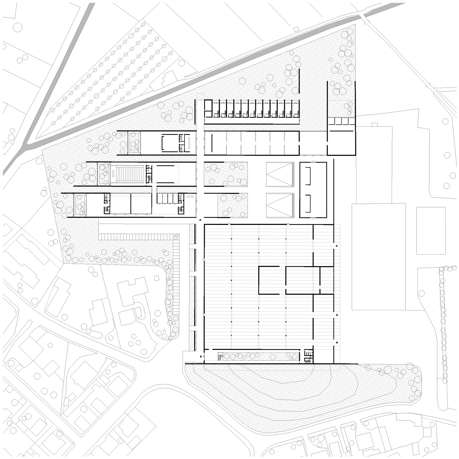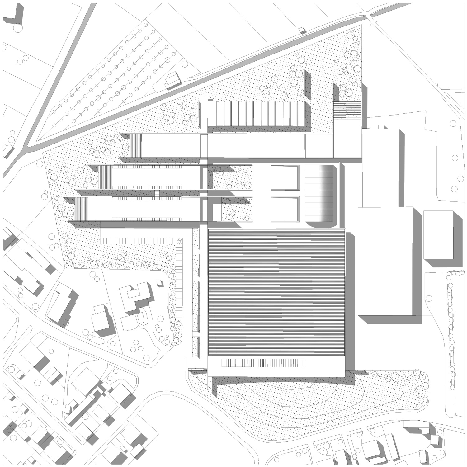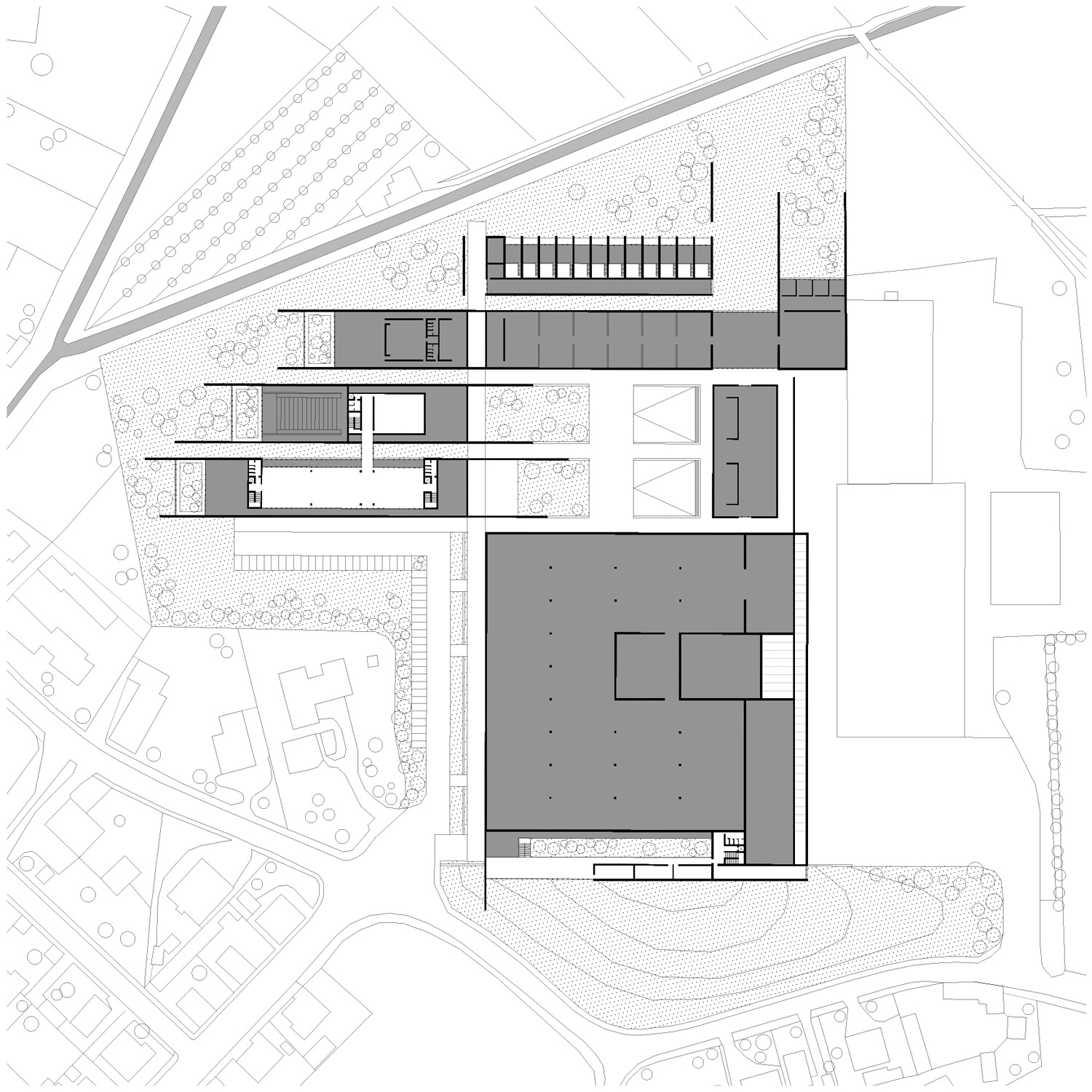 The result is a sequence of volumes that extend from the industrial area towards the adjacent countryside among walls that define their longitudinal development and adapt to the shape of the site. These volumes are connected by a path that crosses the whole building and ideally connects it bilaterally to the city and the countryside, acting as a «ma», despite being a physical presence . The work spaces develop in between the walls, alternating green open spaces which penetrate in the building and create views from the main path that crosses the building.