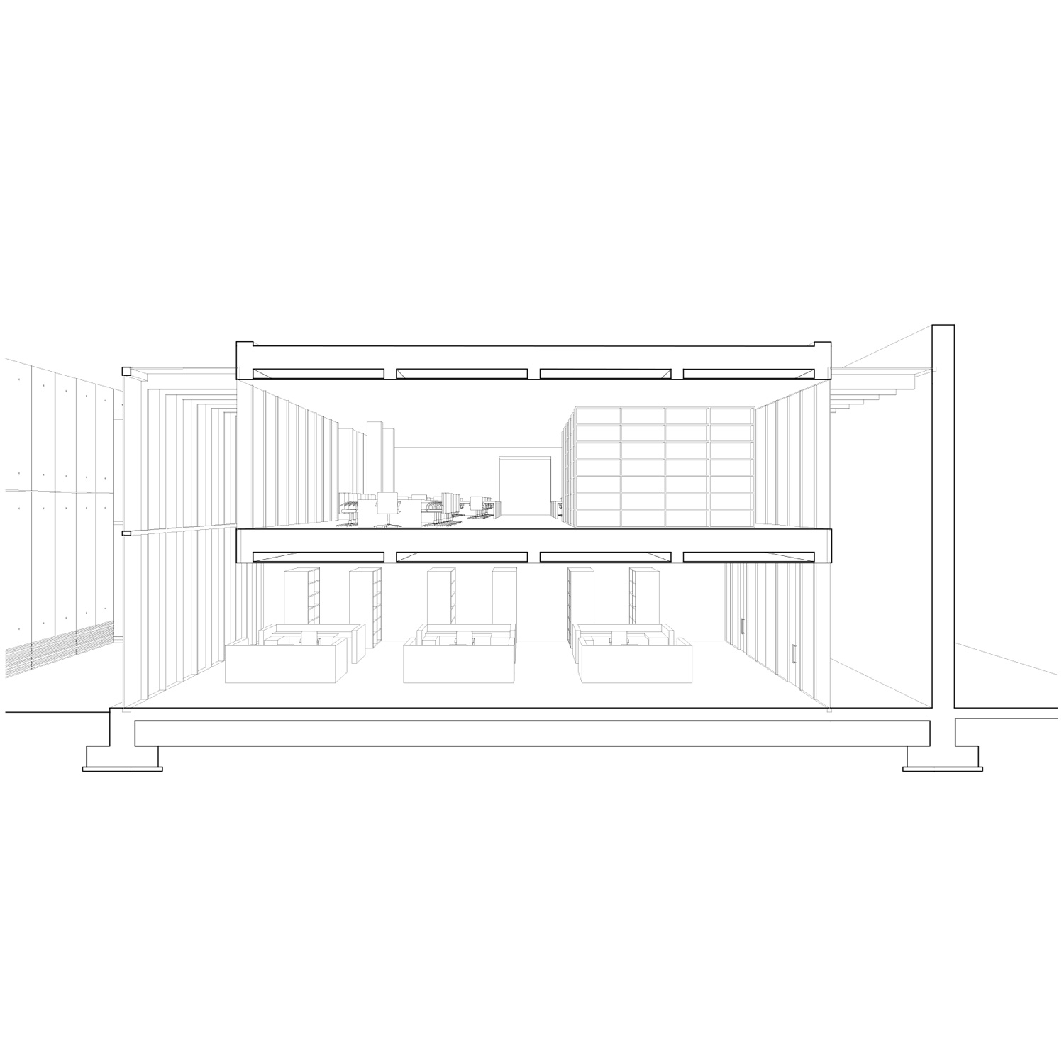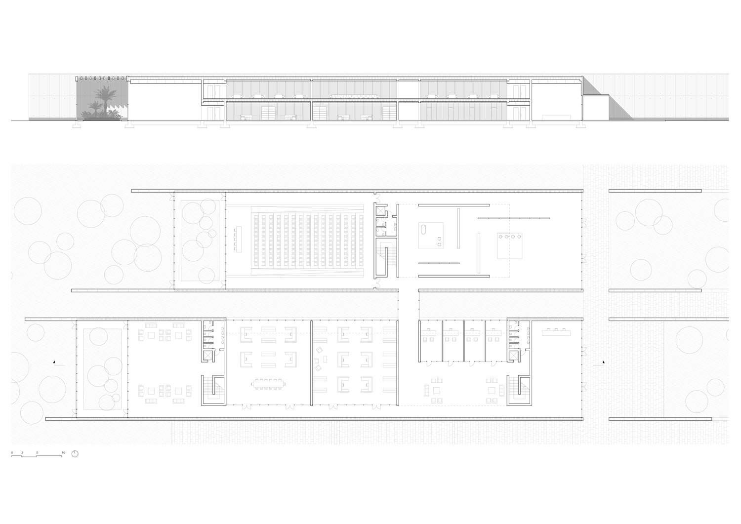 The company museum and a conference hall are located in the ground floor of the second volume, at the first level of which is organized the company archive. The third of the three long western volumes hosts the showroom and the events area, divided by a corridor that connect the two sides of the project.