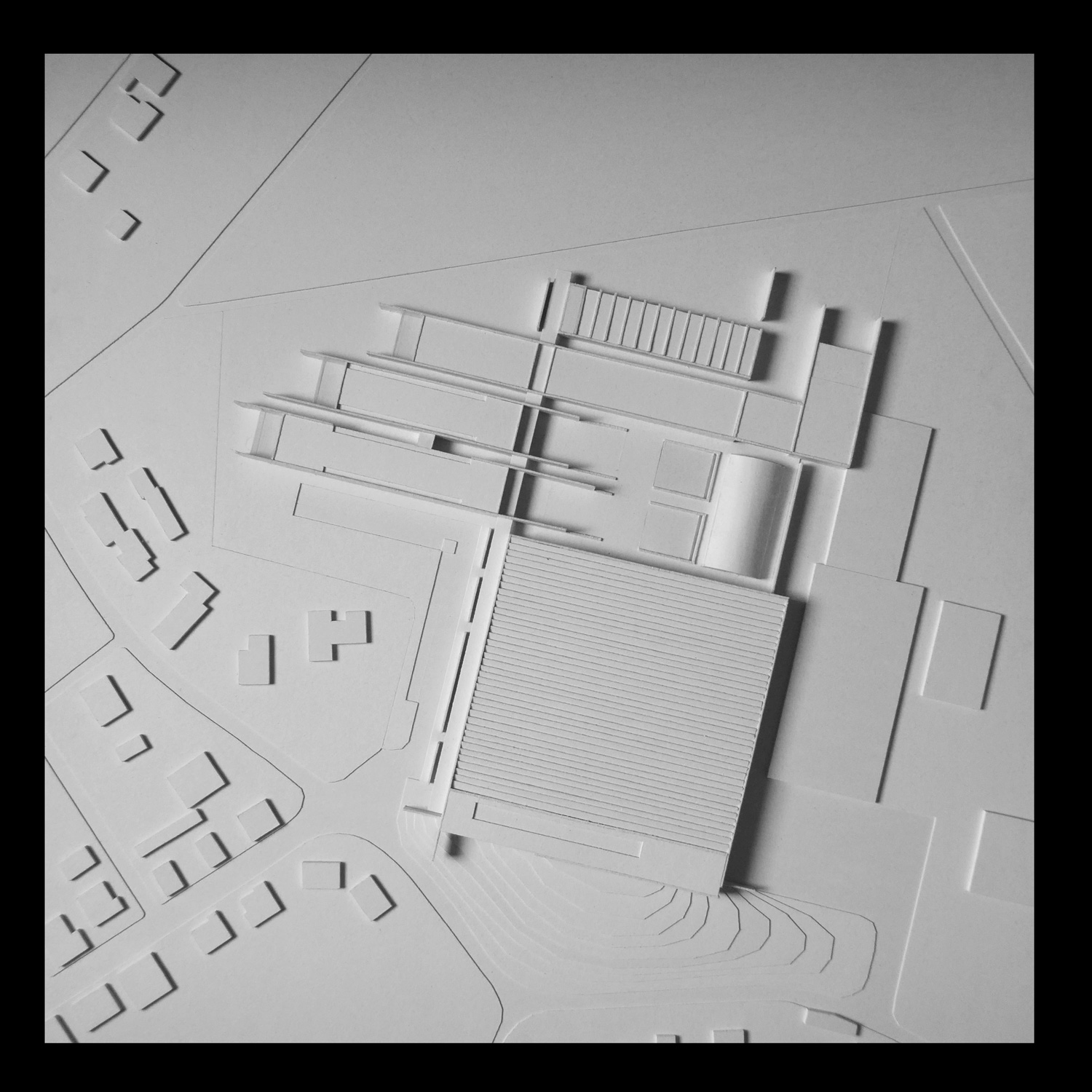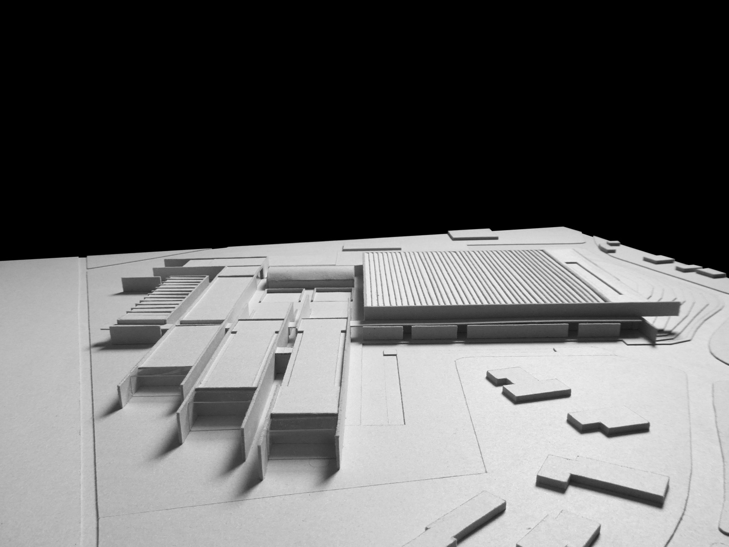 At the same time the building presents itself in a less invasive way towards the inhabited centre by following the direction of the main road and assuming a more «sculptural» aspect, dictated by the intersection of several walls, which conceals the view of the productive area.