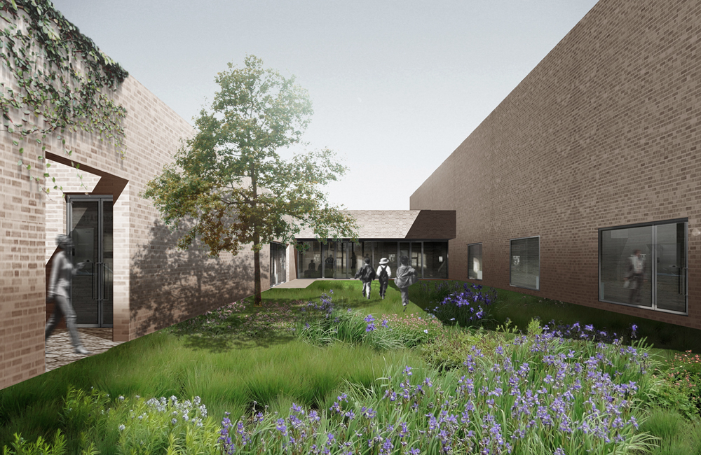 Para neutralizar estos lienzos -telón de fondo de la acción- se ha optado por una materialidad homogénea, un ladrillo rugoso con un tono similar al marés que encontramos en el zócalo del edificio existente. La naturaleza, artificialmente salvaje, vibra en este interior luminoso.