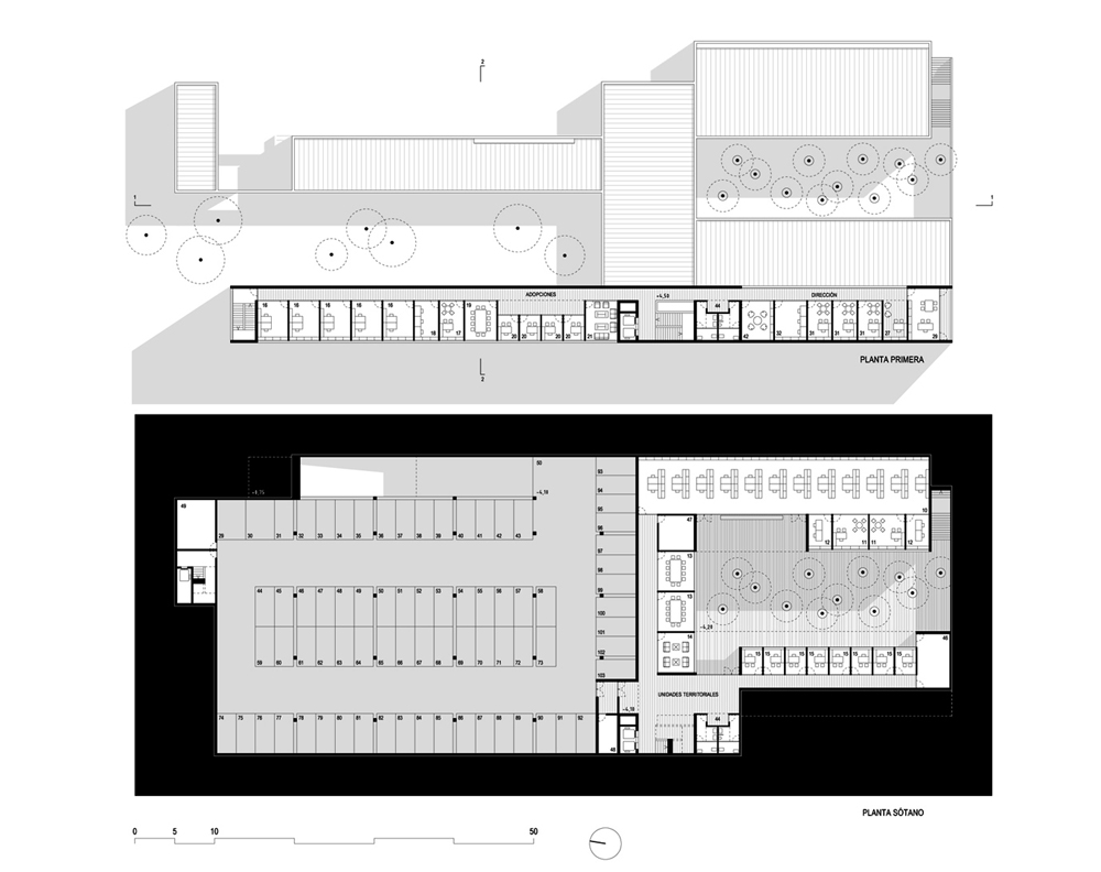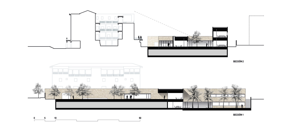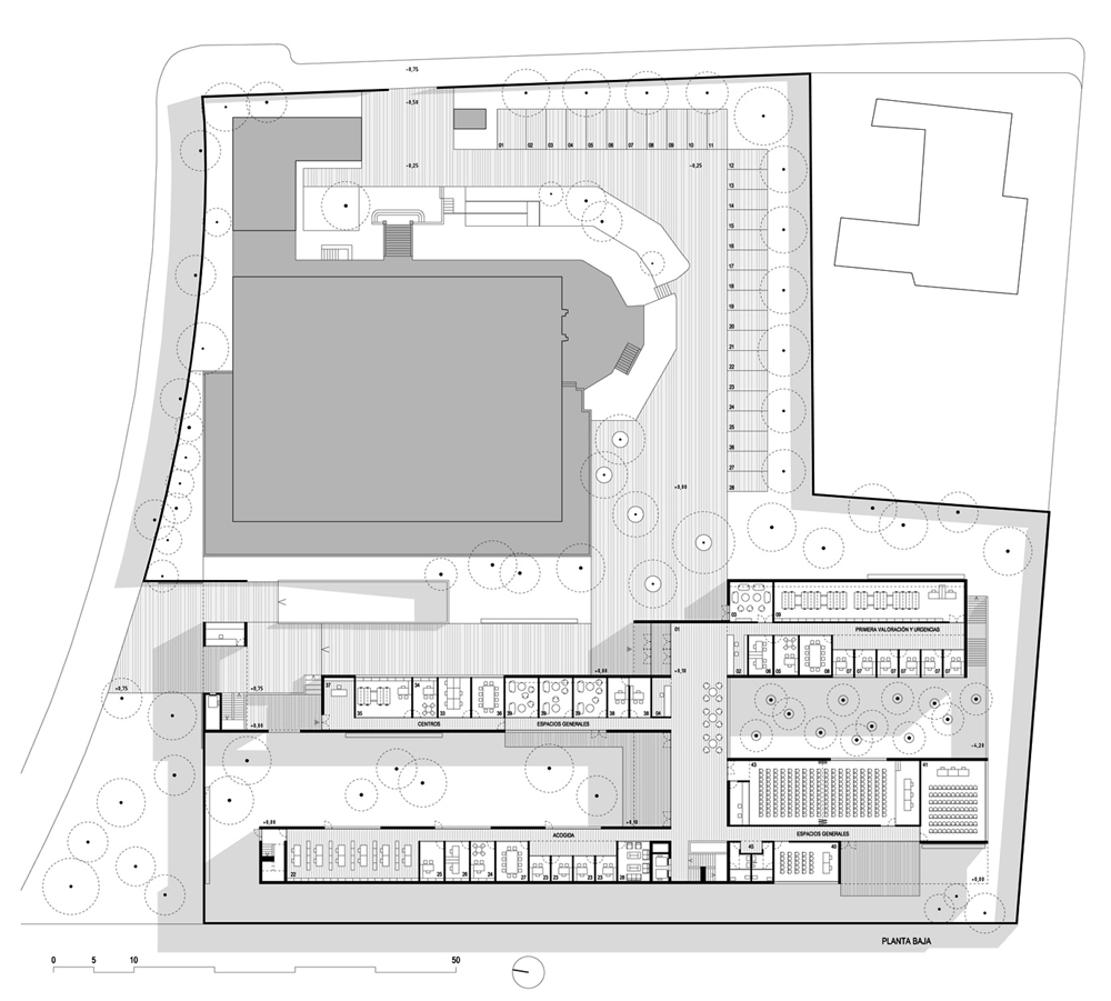Se ha optado por liberar la mayor parte del solar de los coches que actualmente inundan el lugar, proponiendo un aparcamiento en planta sótano con acceso desde la calle Uruguay. El grueso del programa se resuelve en planta baja, lo que permite esponjar las zonas de espera. De esta manera el edificio se define como una sección, un pliegue en este exterior esencialmente continúo.