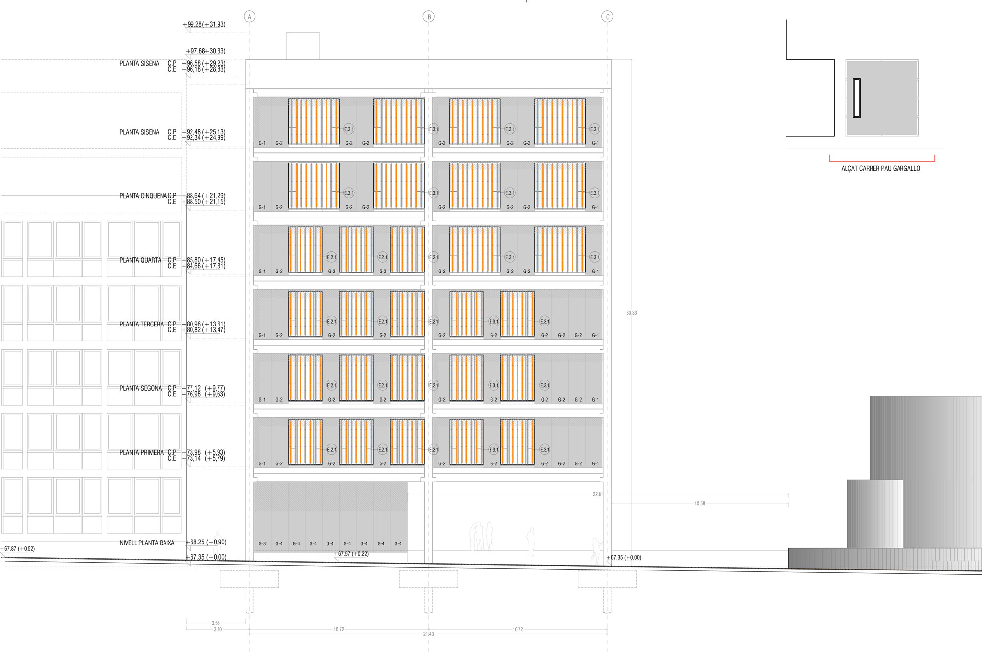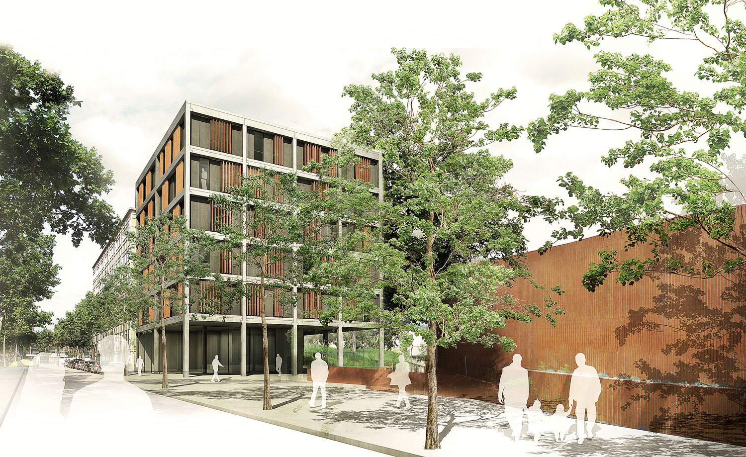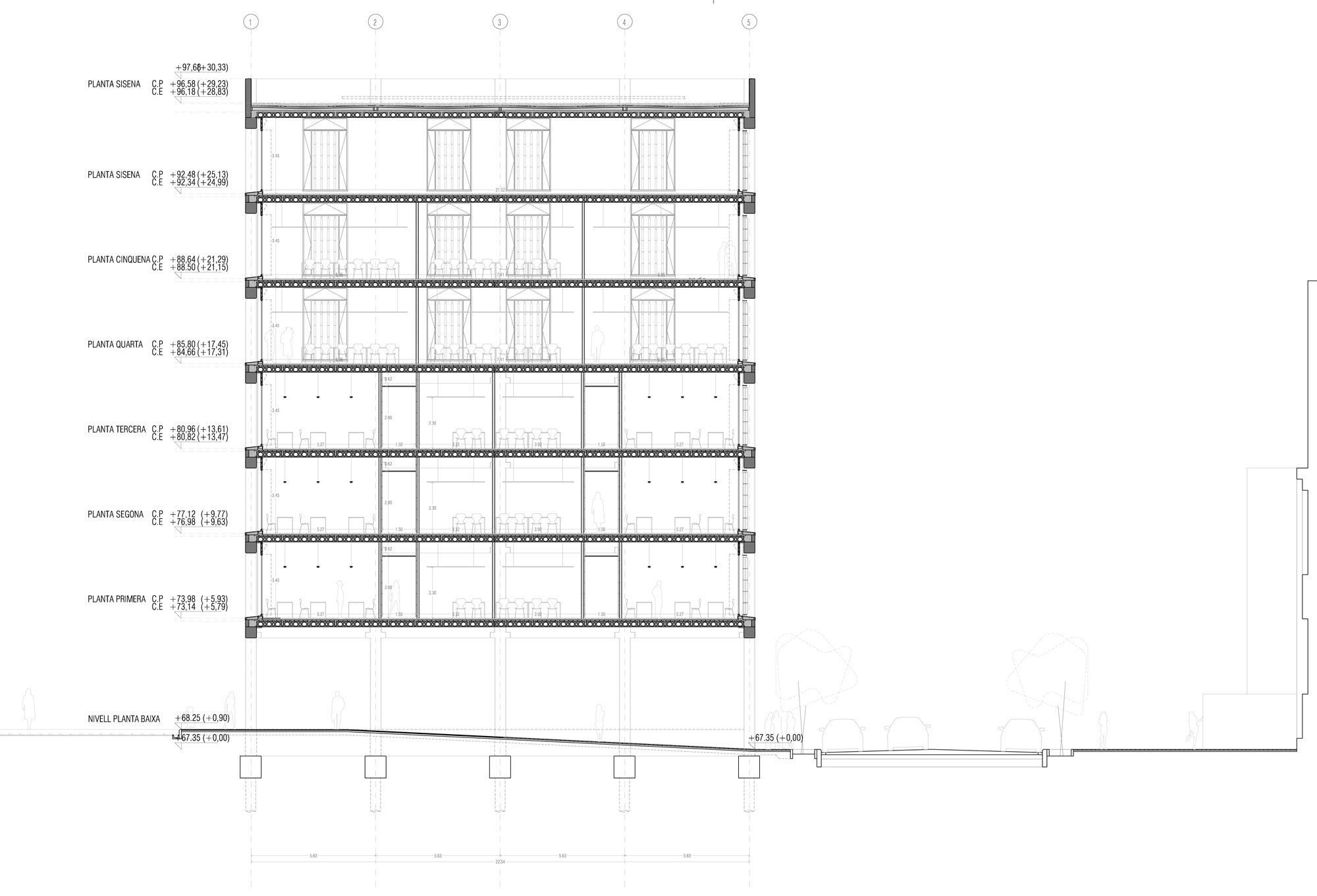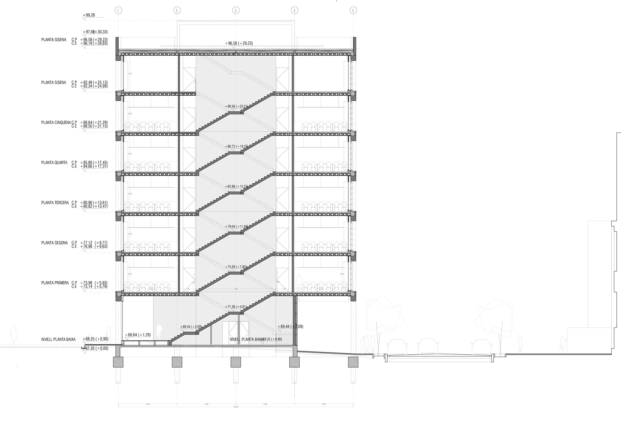 El edificio es un volumen unitario, que actua con respeto y que se relaciona con el contecto de forma sutil y elegante; manteniendo las alturas de las plantas y las alineaciones de ‘l’escola d’Edificació’, para garantizar la facilidad de conexión en cada planta y un orden respecto la calle. El orden estructural del nuevo edificio establece un diálogo con ‘l’Escola de Belles Arts’, mientras la materialidad de las lamas verticales se relaciona con la cerámica que modela la ampliación de J.A. Coderch.