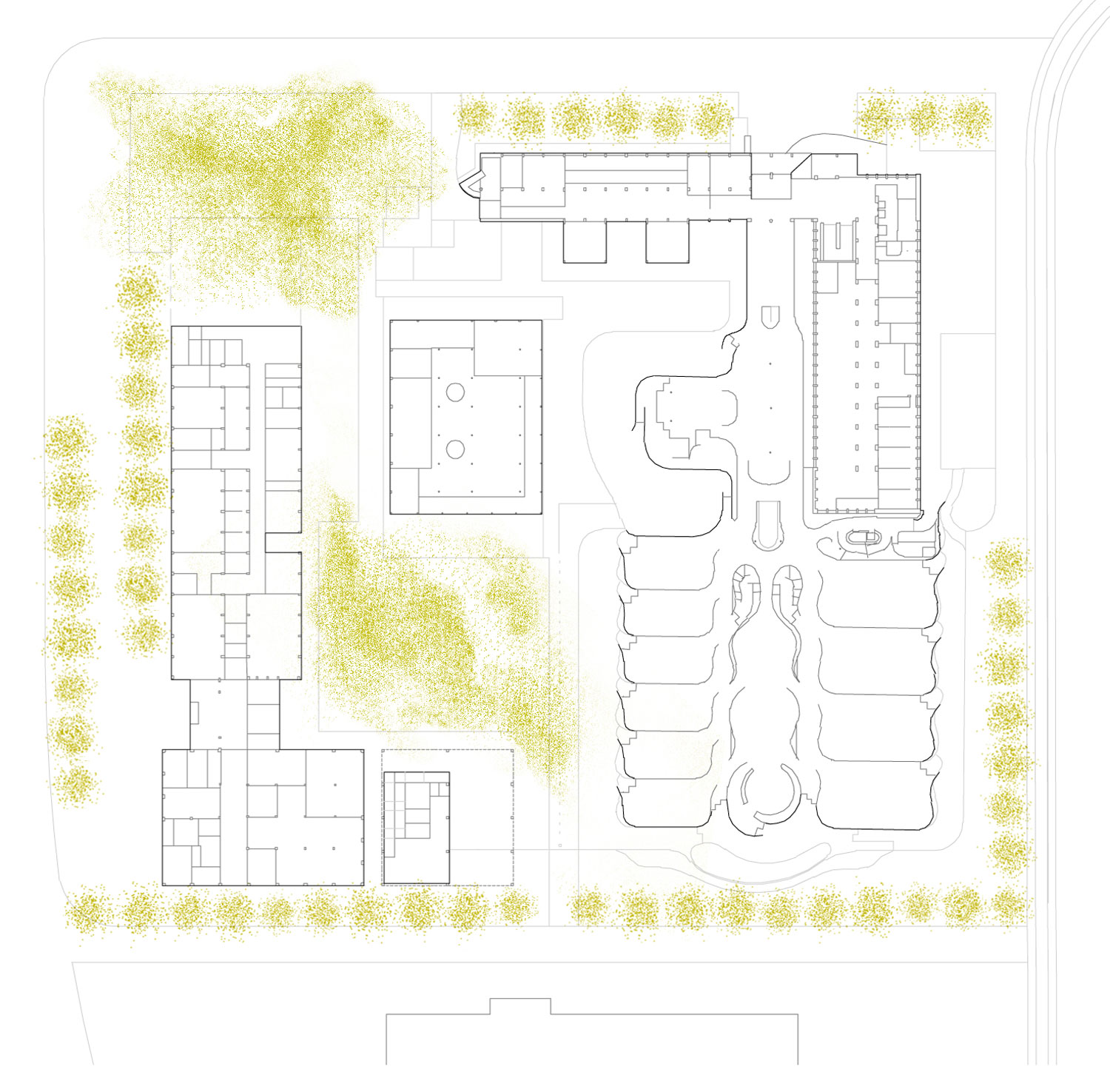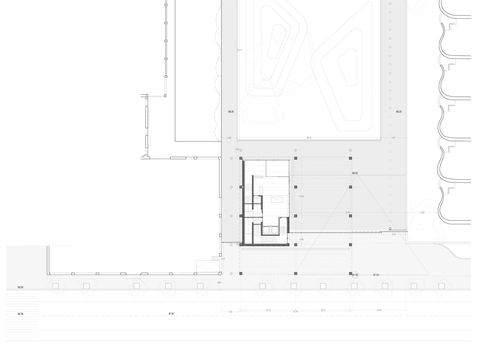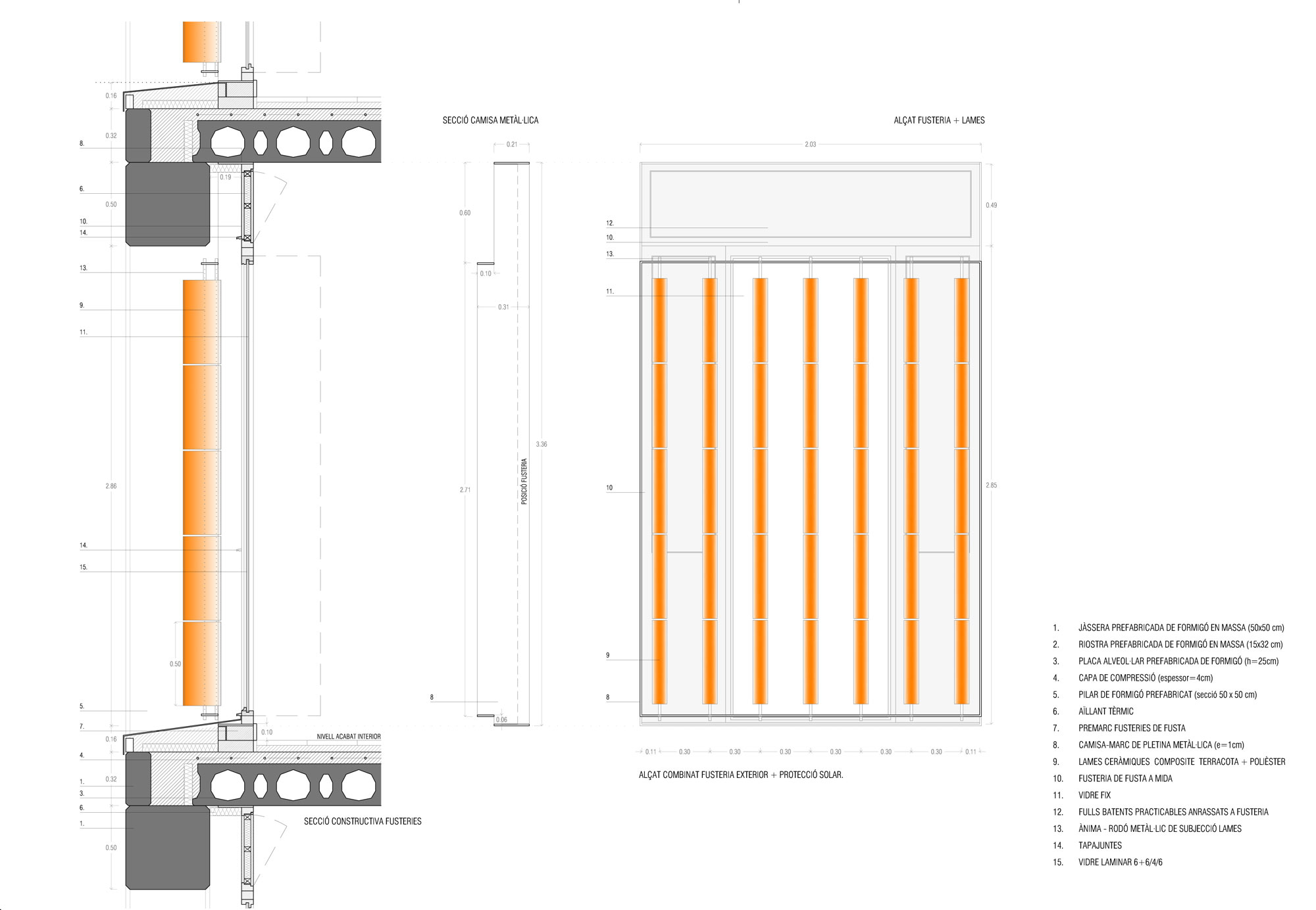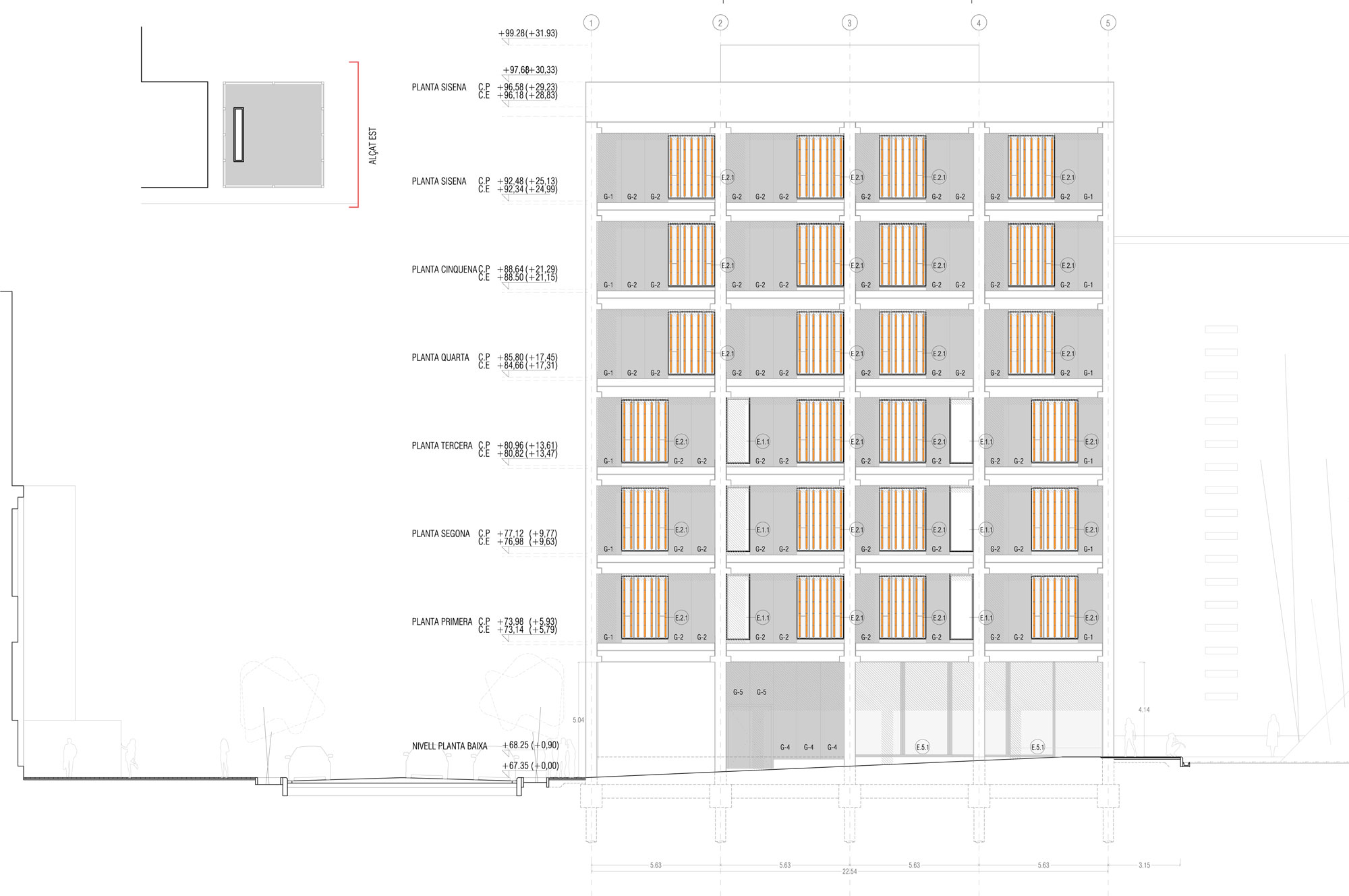 El edificio es un volumen unitario, que actua con respeto y que se relaciona con el contecto de forma sutil y elegante; manteniendo las alturas de las plantas y las alineaciones de ‘l’escola d’Edificació’, para garantizar la facilidad de conexión en cada planta y un orden respecto la calle. El orden estructural del nuevo edificio establece un diálogo con ‘l’Escola de Belles Arts’, mientras la materialidad de las lamas verticales se relaciona con la cerámica que modela la ampliación de J.A. Coderch.