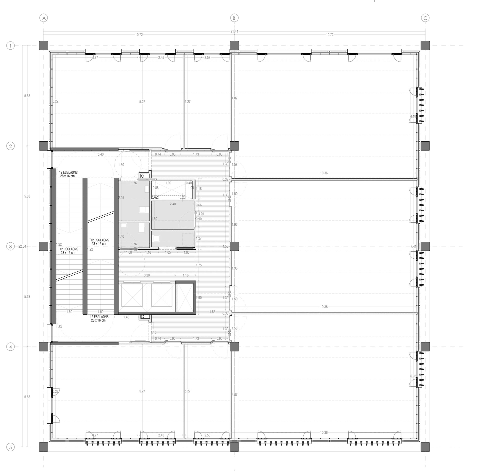 El núcleo ‘servidor’ (comunicaciones verticales, paso de instalaciones y lavabos) se sitúa en el centro de la planta, configurando una organización centrífuga para aprovechar al máximo las fachadas y garantizar iluminación y ventilación natural en la totalidad de las piezas. El núcleo se sitúa ligeramente desplazado para establecer distancias relativas con el cerramiento que favorecerá la colocación de despachos y permitirá una gran libertad del resto de la planta para situar las aulas en diferentes disposiciones. La normativa de incendios, en el apartado que hace referencia a la ocupación del usuario, obliga a dos escaleras de evacuación. La propuesta prevé que estén superpuestas ‘a la americana’, obteniendo la maxima eficiencia de la superficie en planta. La colocación de cortafuegos automáticos al rededor, permite una disposición optima y facilita dos posibles conexiones con la ‘Escola d’Edificació’. En el centro de la planta se sitúan las zonas húmedas y pasos de instalaciones verticales para garantizar el mínimo recorrido posible, economizando su trazado.