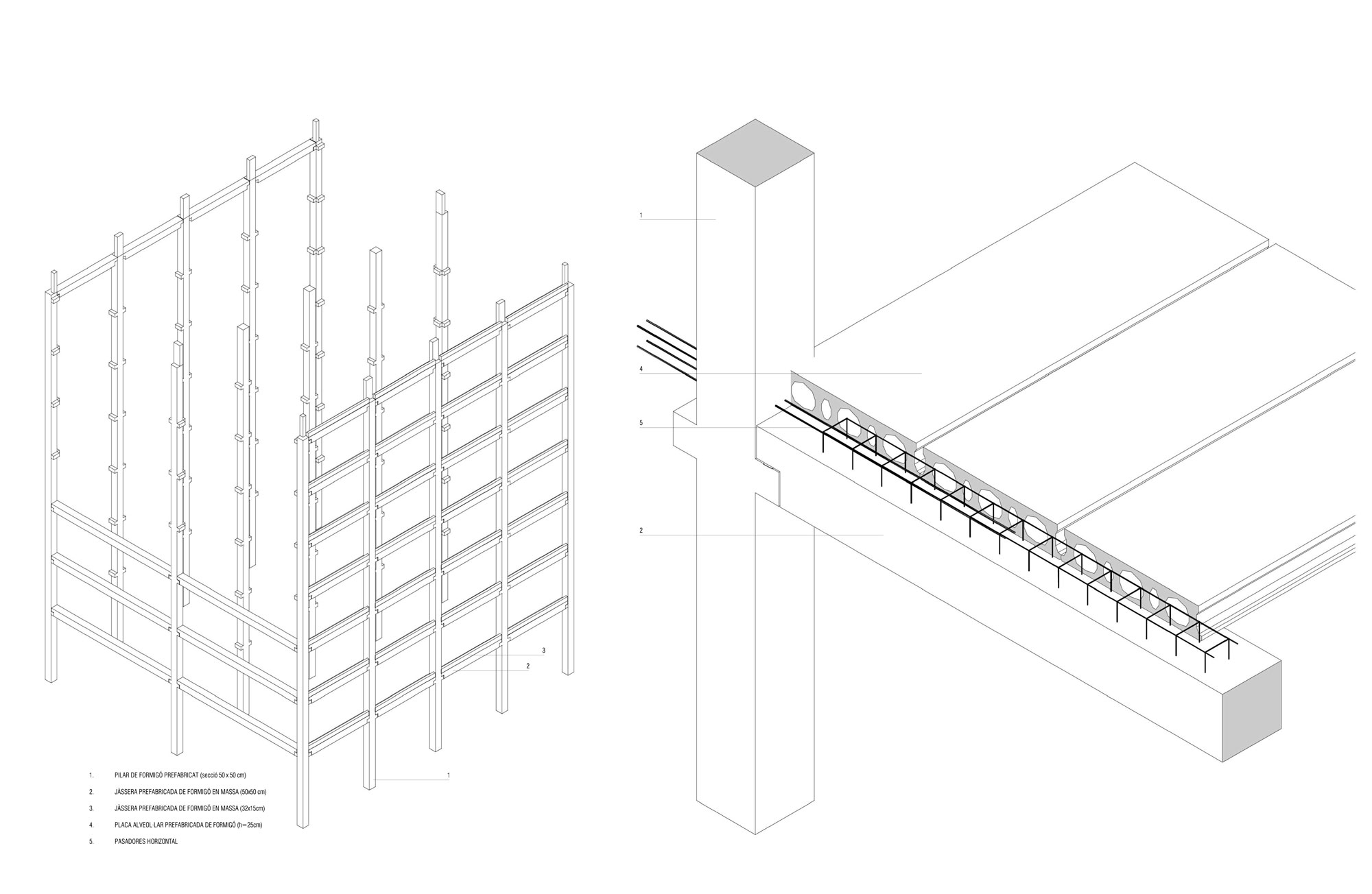 La estructura se plantea de hormigón prefabricado, con pilares y jácenas de 40×40 cm, luces de 10,91 x 5,65, y forjados de placas alveolares de 11,21 m de longitud y 25cm de canto. La estructura se deja vista, siendo el elemento de soporte tanto gravitacional, como constructivo y estético. Define la reticula de soporte del cerramiento, que en un segundo plano, da respuesta a las orientaciones, vistas, etc. Esta solución, permite una económica y rápida construcción, con soluciones estandarizadas de detalles que faciliten su ejecución.
