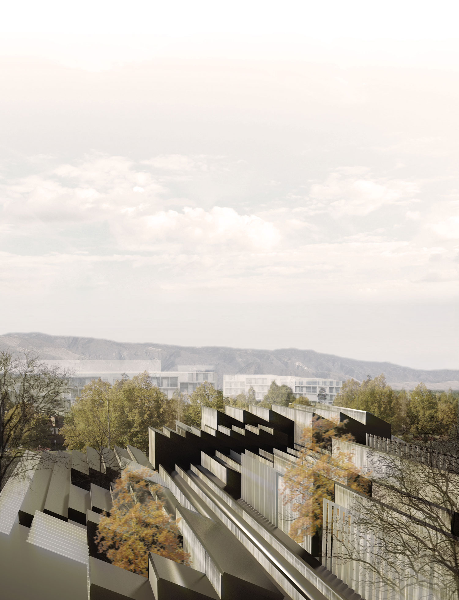 El movimiento de los volúmenes, las cubiertas en sierra, y su geometría celular, tratan de resolver la relación visual con el entorno, como concepto ampliado, a partir de la intencionada ambigüedad formal de su desjerarquizada volumetría, y el negro color materiales, para revelarse en el entorno. La totalidad de las construcciones propuestas para el Nuevo edificio de Servicios de Yebes se estructuran a partir de un sistema compositivo lineal, abierto y flexible, que permite establecer las reglas de juego del conjunto, así como las reglas de juego de las posibles fases de construcción y sus posibles ampliaciones.